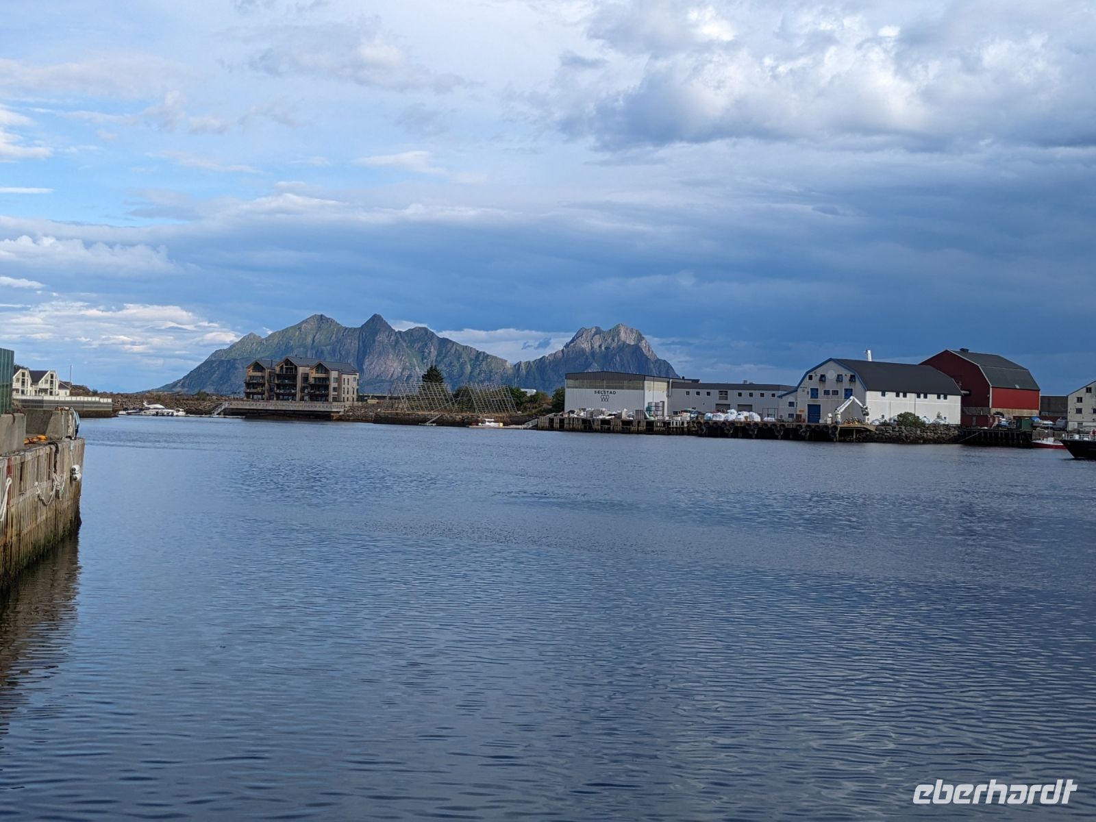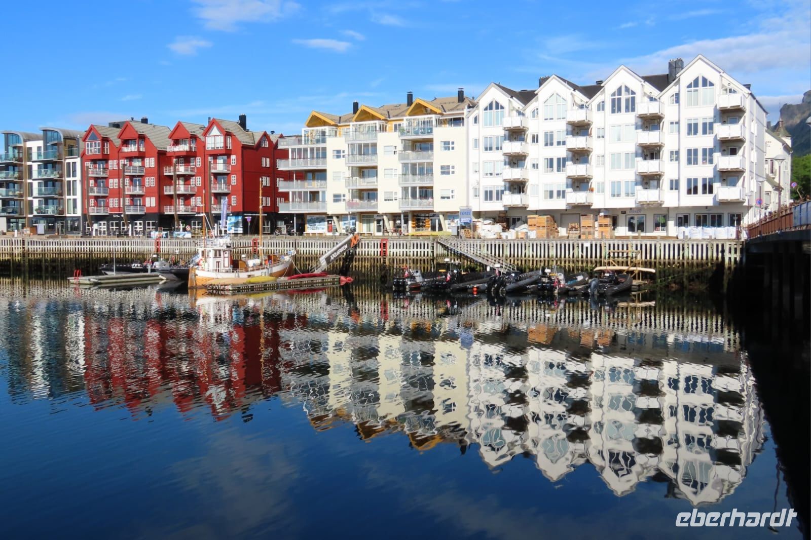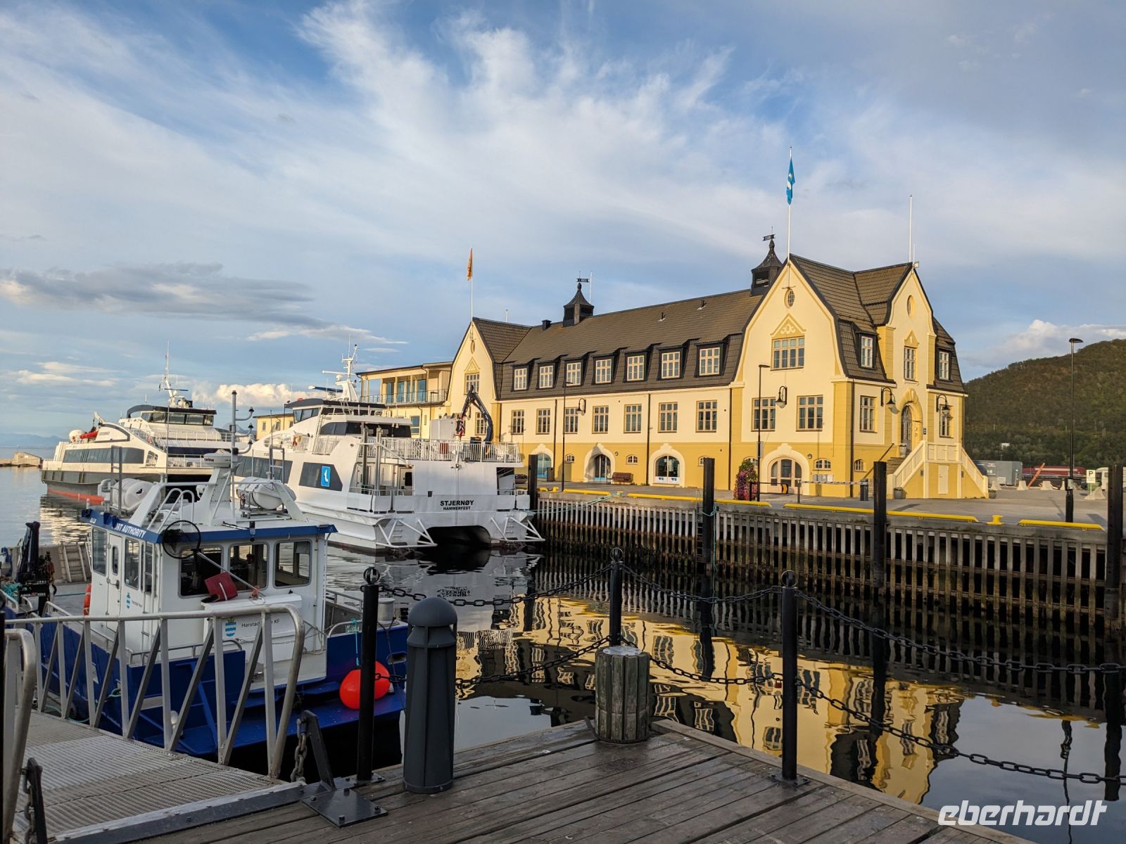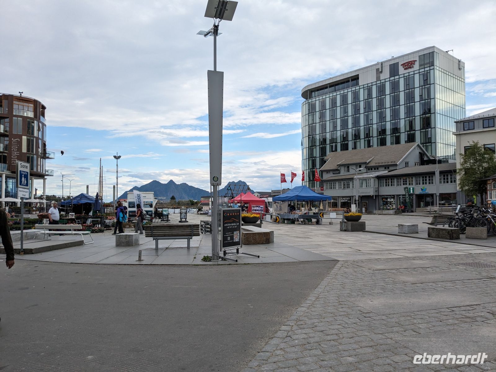 Wir verließen die E 6 - die wir in einigen Tagen etwas südlich wieder treffen würden und bogen auf die E 10 ab, den sogenannten „Kong Olafs Vei“. Der norwegische König Olav V. erkannte die Notwendigkeit moderner Logistik und tat sehr viel für die Entwicklung des norwegischen Verkehrswesens. Bei der nach ihm benannten Route hatte er die Fernstraße, bauen lassen, die von der westlichsten Siedlung der Lofoten – dem Ort Å - über die Vesterålen bis ins schwedische Luleå führt. Erst 1984 wurde dieser Verkehrsweg von ihm zusammen mit dem Schwedenkönig Carl XVI. Gustaf eingeweiht. Ein Stopp vor der Auffahrt auf die Vesterålen ermöglichte dann Fotos von der gewaltigen Tjeldsund- Brücke, die auch Steinslandbrücke genannt wird und die das Festland mit dem Archipel der Vesterålen verbindet. Diese, den nördlicher gelegenen „Schwester“-.Archipel der Lofoten erreichtern wir nach der Brücken-Überquerung. Hier, auf Norwegens zweitgrößter Insel Hinnøya liegt nicht allzuweit von der Tjeldsund-Brücke Harstad, die größte Stadt der Region, in deren Zentrum nahe dem Hafen wir heute übernachteten.