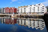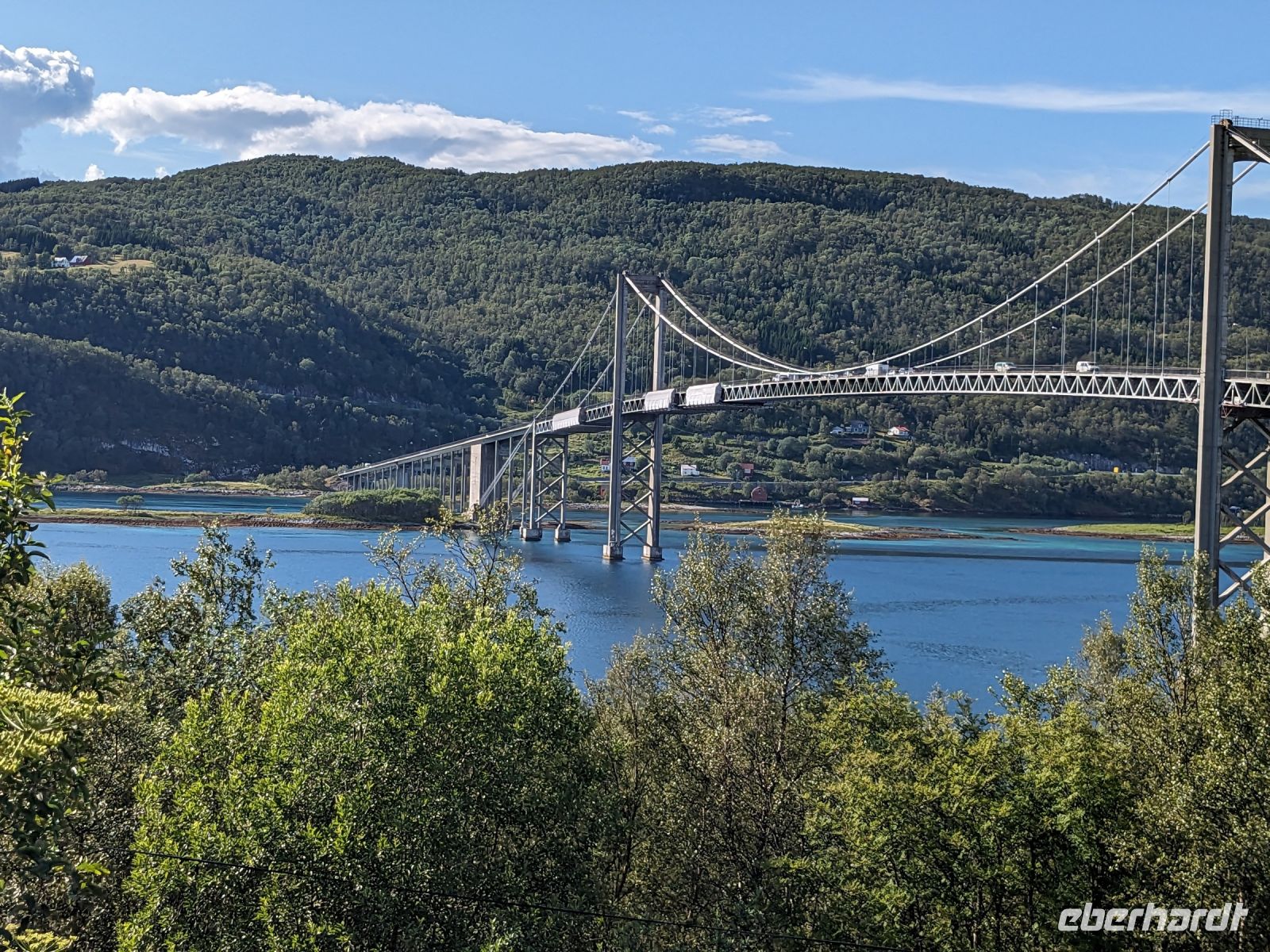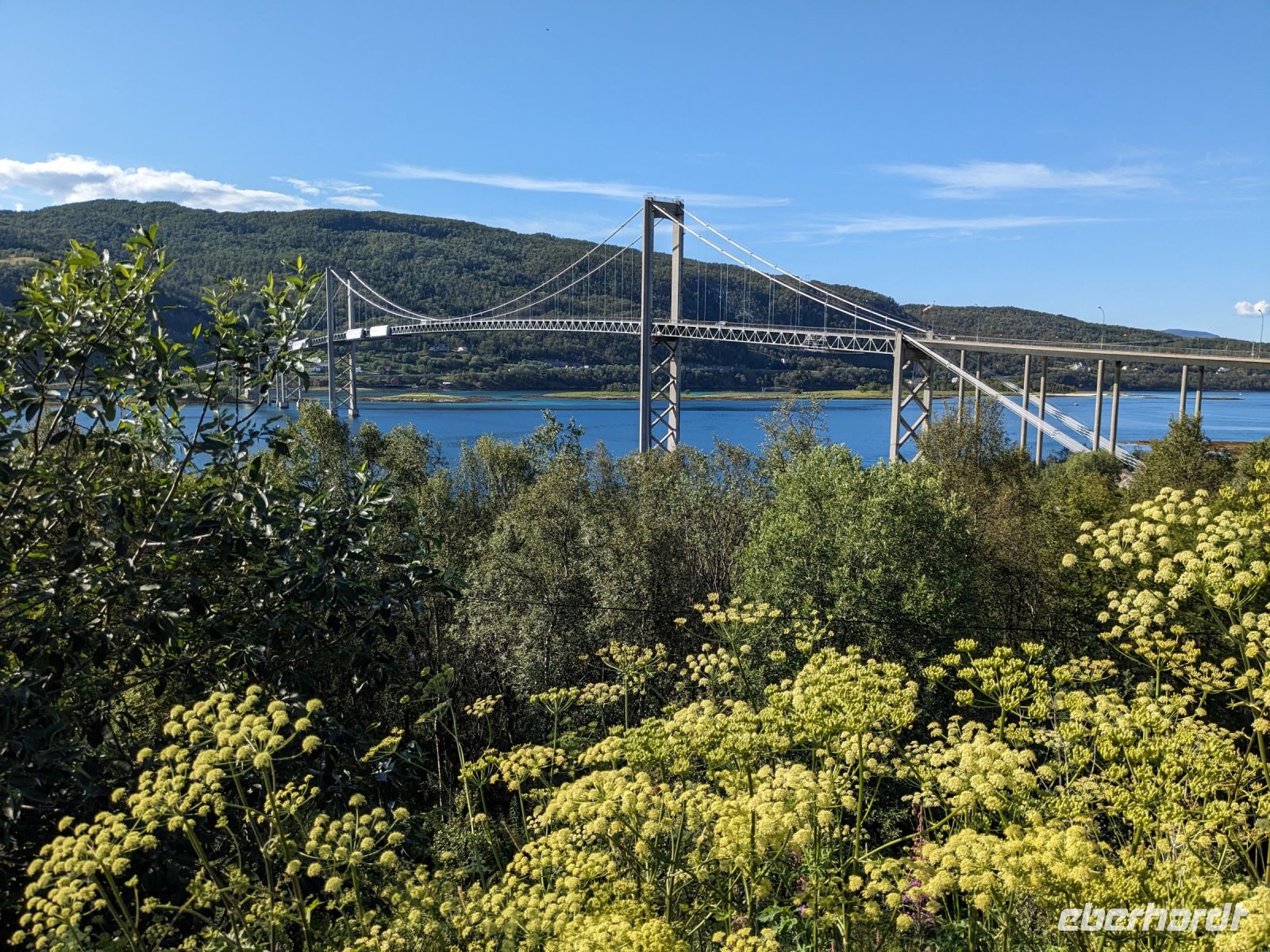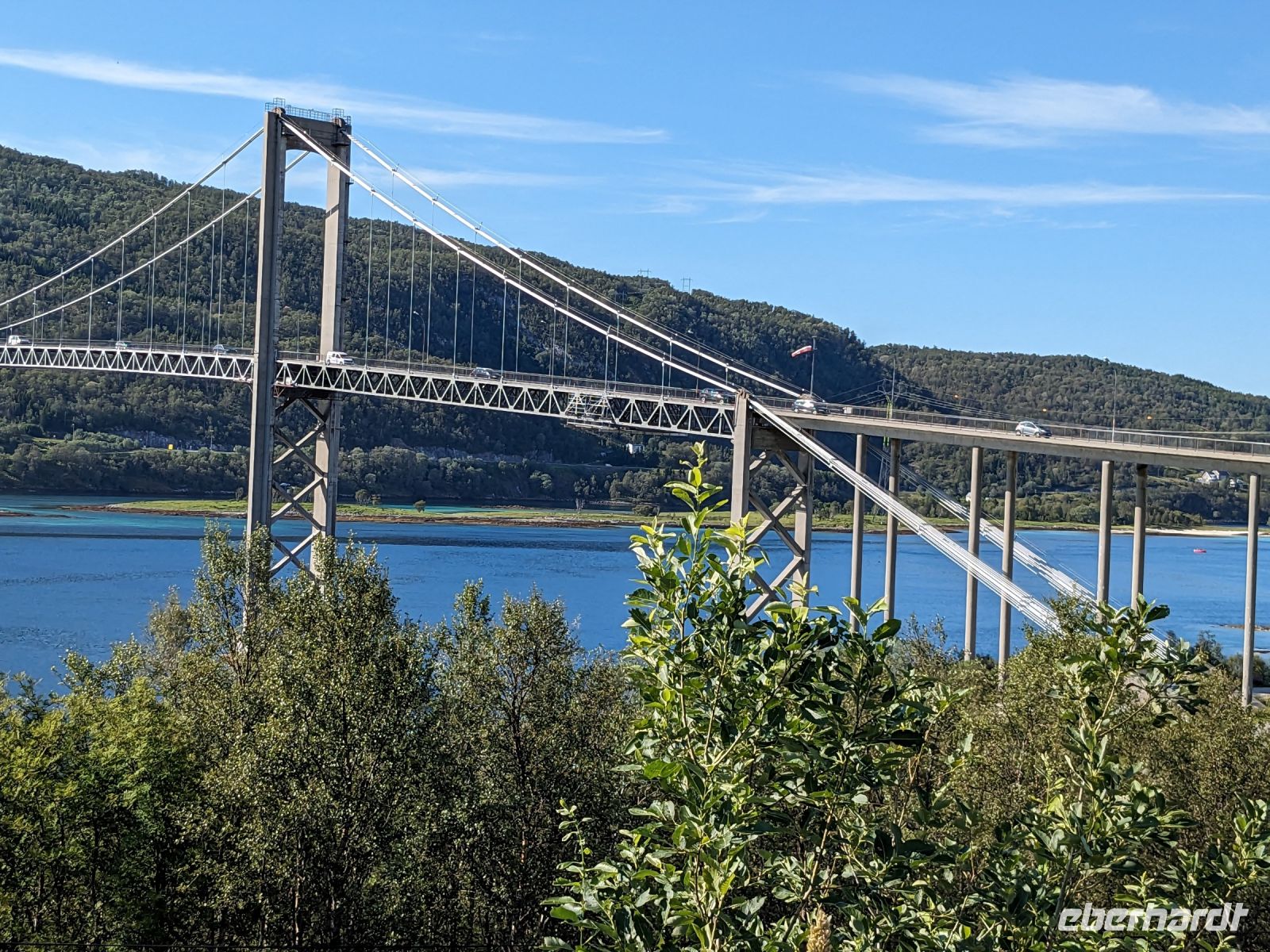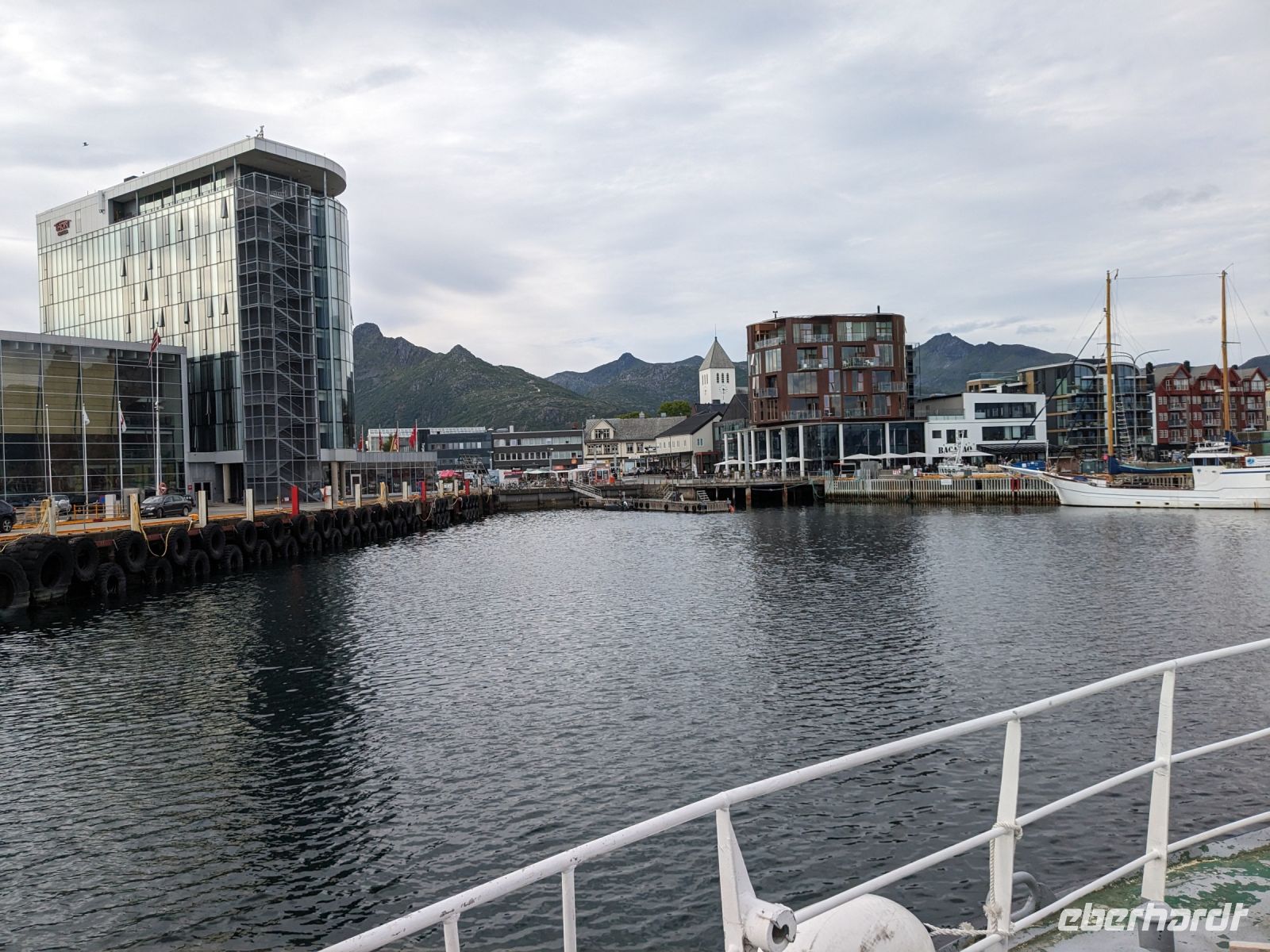 Wir verließen die E 6 - die wir in einigen Tagen etwas südlich wieder treffen würden und bogen auf die E 10 ab, den sogenannten „Kong Olafs Vei“. Der norwegische König Olav V. erkannte die Notwendigkeit moderner Logistik und tat sehr viel für die Entwicklung des norwegischen Verkehrswesens. Bei der nach ihm benannten Route hatte er die Fernstraße, bauen lassen, die von der westlichsten Siedlung der Lofoten – dem Ort Å - über die Vesterålen bis ins schwedische Luleå führt. Erst 1984 wurde dieser Verkehrsweg von ihm zusammen mit dem Schwedenkönig Carl XVI. Gustaf eingeweiht. Ein Stopp vor der Auffahrt auf die Vesterålen ermöglichte dann Fotos von der gewaltigen Tjeldsund- Brücke, die auch Steinslandbrücke genannt wird und die das Festland mit dem Archipel der Vesterålen verbindet. Diese, den nördlicher gelegenen „Schwester“-.Archipel der Lofoten erreichtern wir nach der Brücken-Überquerung. Hier, auf Norwegens zweitgrößter Insel Hinnøya liegt nicht allzuweit von der Tjeldsund-Brücke Harstad, die größte Stadt der Region, in deren Zentrum nahe dem Hafen wir heute übernachteten.