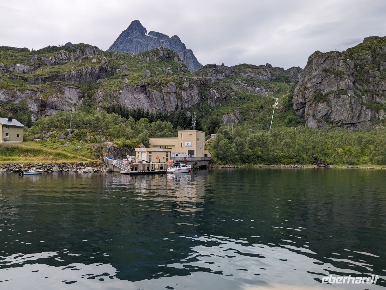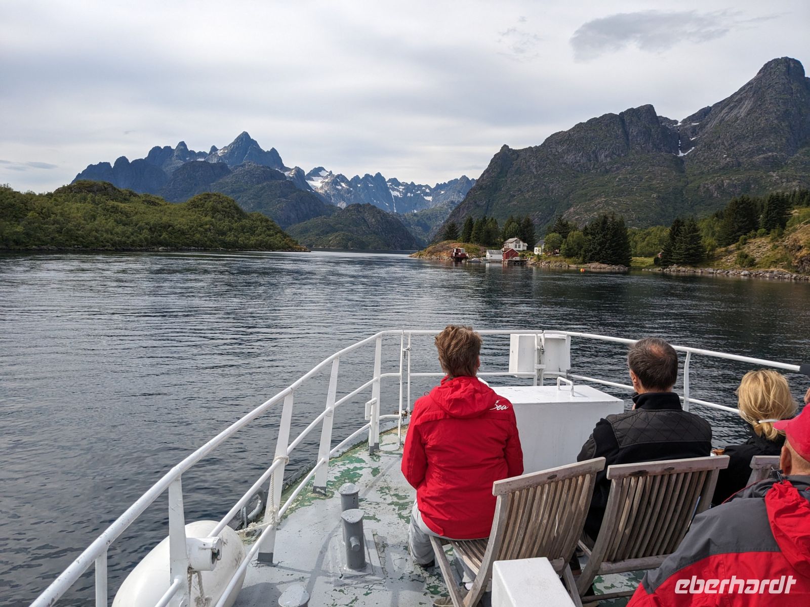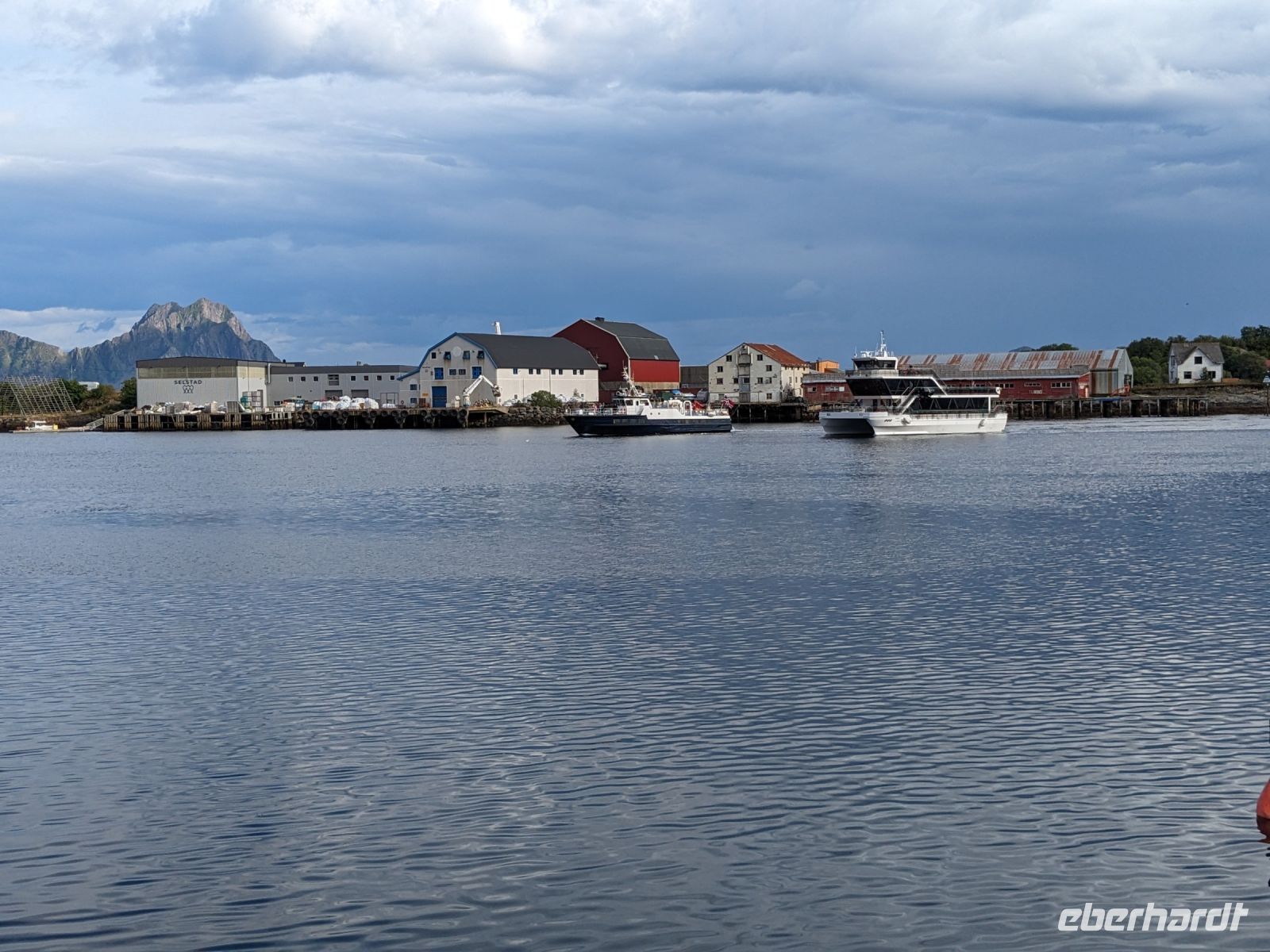 Später fuhren wir Richtung Süden, vorbei an der Tjeldsund-Brücke und durch die Tunnel- und Brückenverbindung auf die Lofoten. Nach Überquerung der letzten Brücke wurden wir im winzigen Hafen Hanøy von einem Schiff abgeholt: mit dem „Øykongen“ (auf Deutsch „Inselkönig“) starteten wir zu einer tollen Bootsfahrt, die uns durch den Raftsund – die Meerenge, die die Vesterålen von den Lofoten trennt - in den Trollfjord und in den Hauptort der Lofoten, nach Svolvær führen sollte. Unterwegs könnten wir, so hieß es, erwarten, Seeadler zu sehen, von denen viele hier nisten.