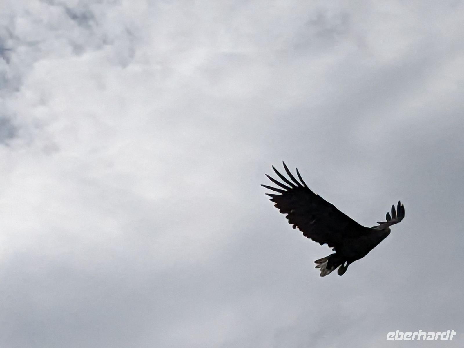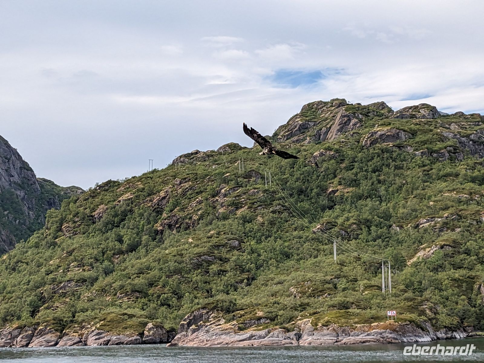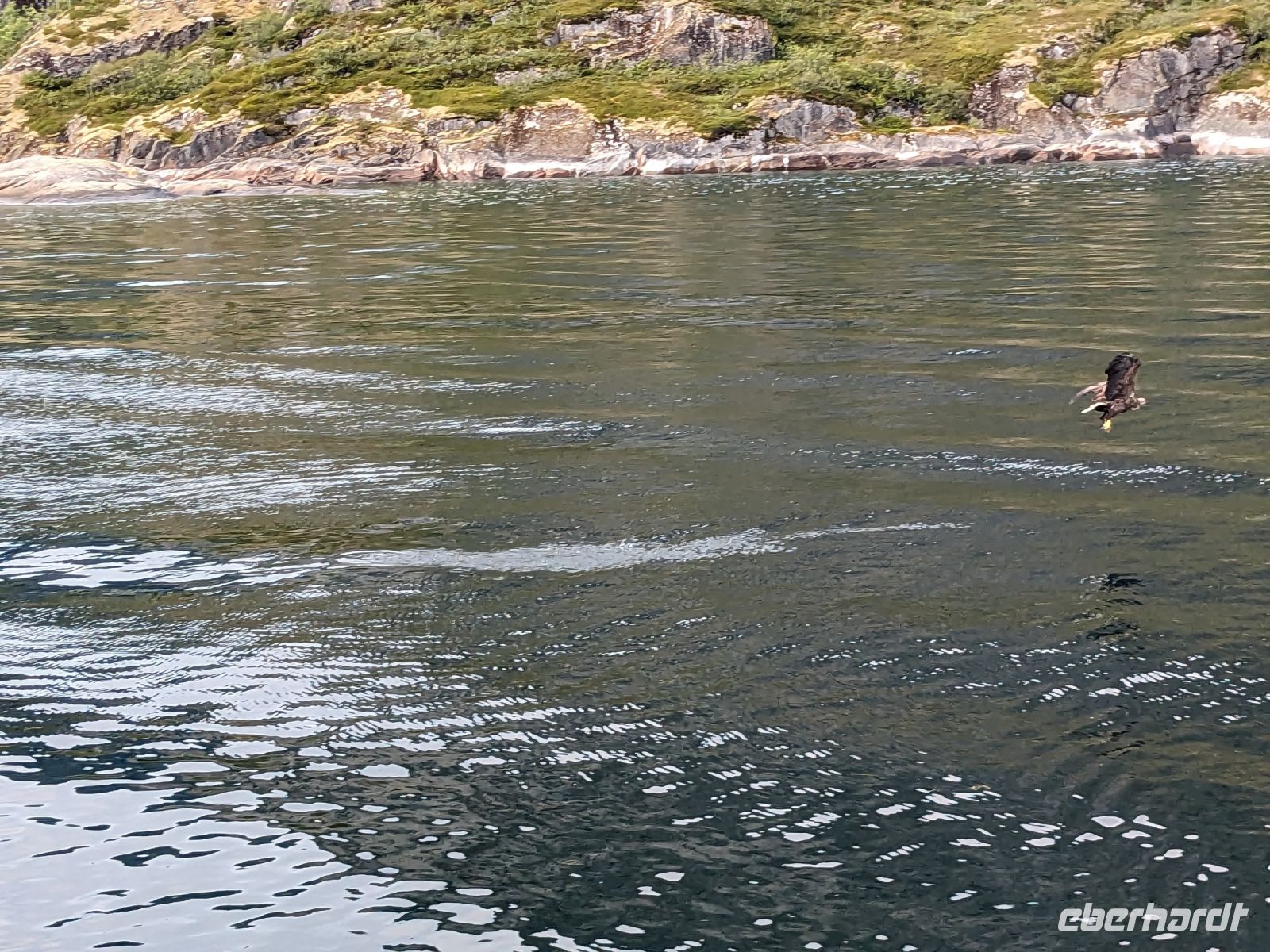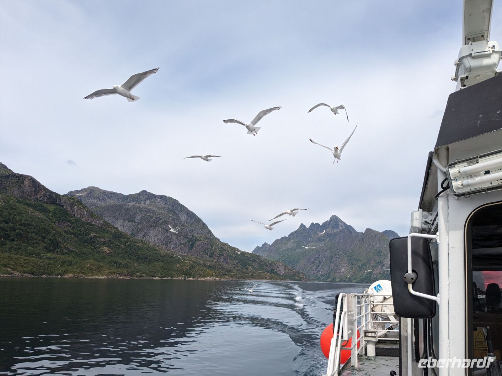 Dann fuhren wir mit unserem Boot in den Trollfjord, der sich nach schmaler Zufahrt als kesselartig ins Land hineinreichender Seitenarm des Raftsunds weitet. Mit einem guten Kilometer Länge und 800 m Breite nach einer nur 100 m breiten Zufahrt ist er eine Besonderheit und seine Entstehung wird einer Laune der Troll-Fabelwesen zugeschrieben. Hier lag das Boot ruhig und wir kosteten als Imbiss eine gegendtypische Lachssuppe. Nach der Wiederausfahrt aus dem Trollfjord begann die eigentliche „Seeadler-Safar“. Ein Crewmitglied, das uns vorher erklärt hatte, was ablaufen würde, warf Fisch und Krabben in die Luft und lockte damit zunächst viele Möwen an. Die erregten wiederum die Aufmerksamkeit der Seeadler, die offensichtlich am so bereitwillig geworfenen Futter teilhaben wollten. Und tatsächlich segelten sie mehrfach herbei, die Könige der Lüfte. Mindestens ein halbes Dutzend Seeadler konnten wir beobachten, die teilweise in nur zwei drei Meter Entfernung an uns vorbeiflogen. Einige von uns sahen sogar einen Schweinswal, wofür es auch ein Beweisfoto gibt.