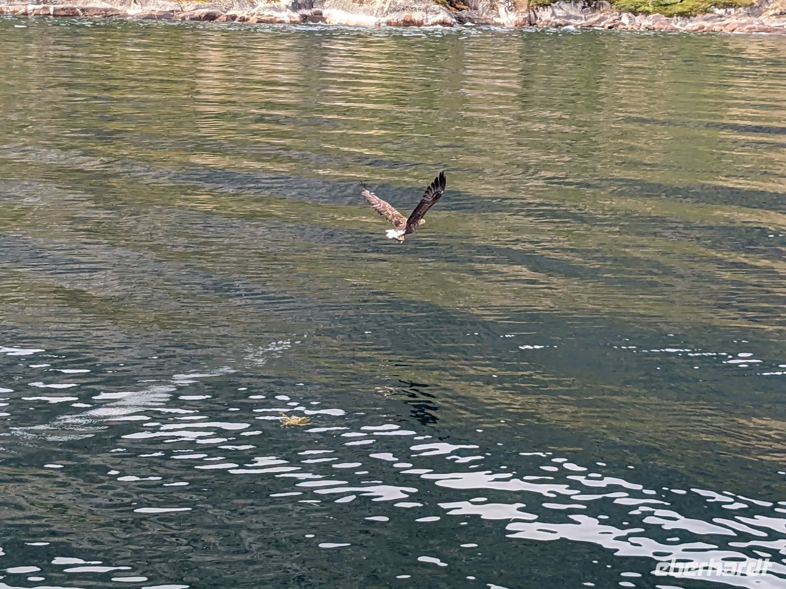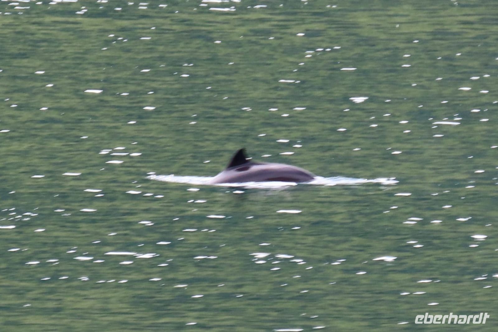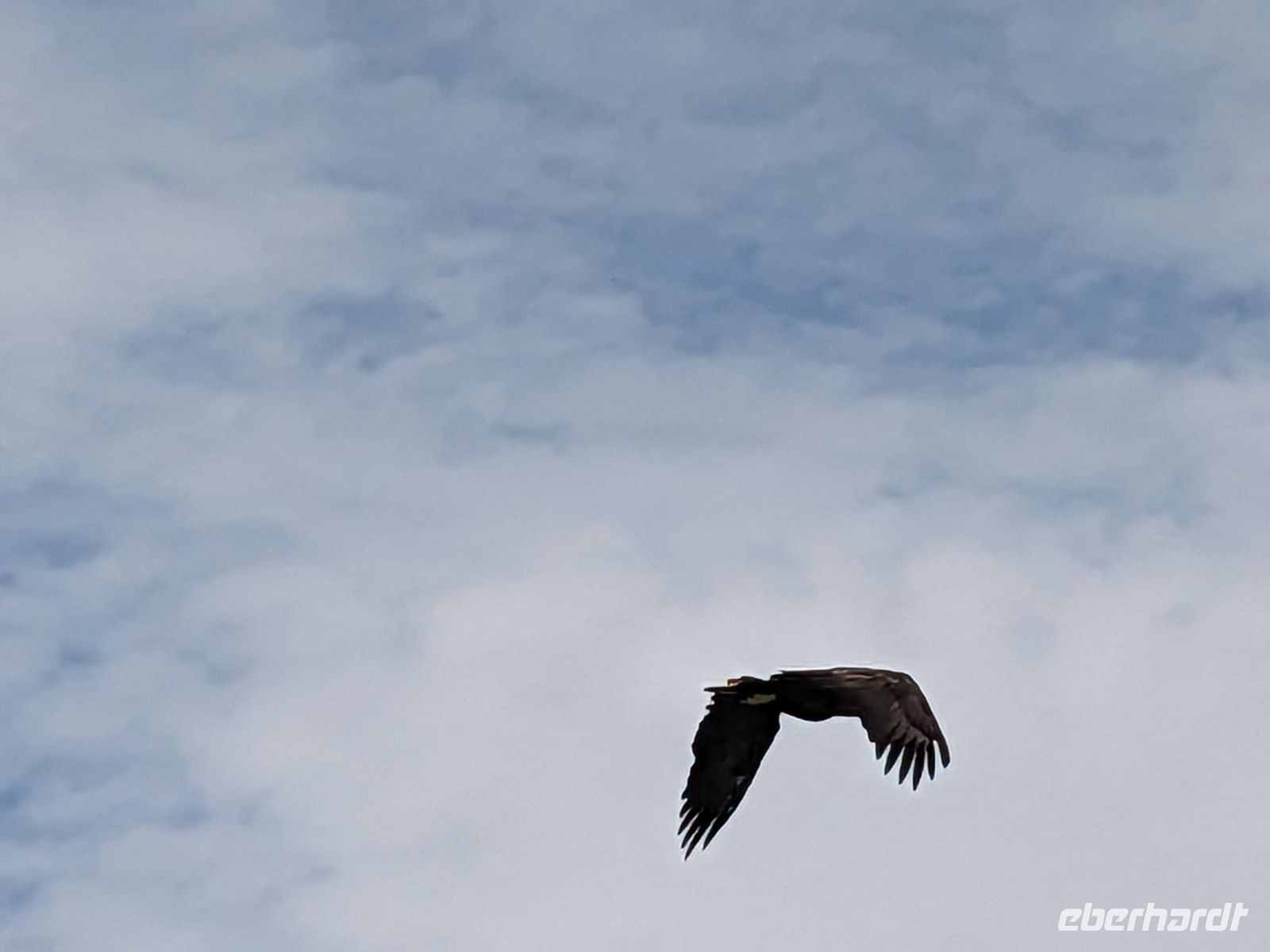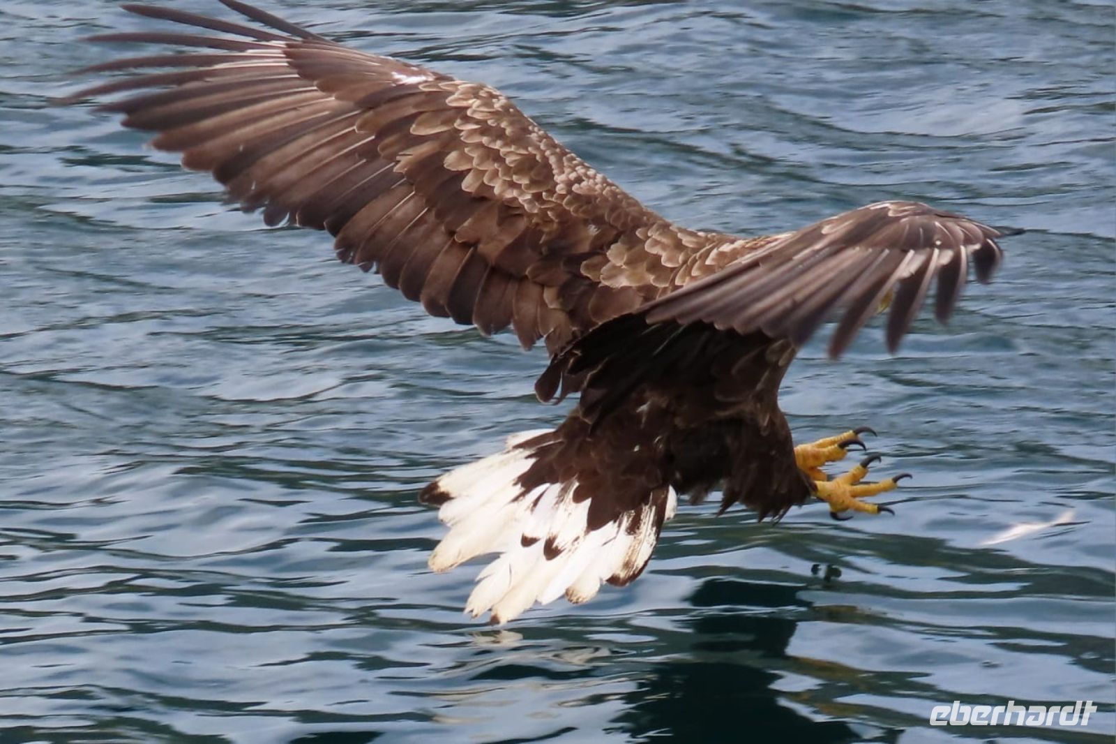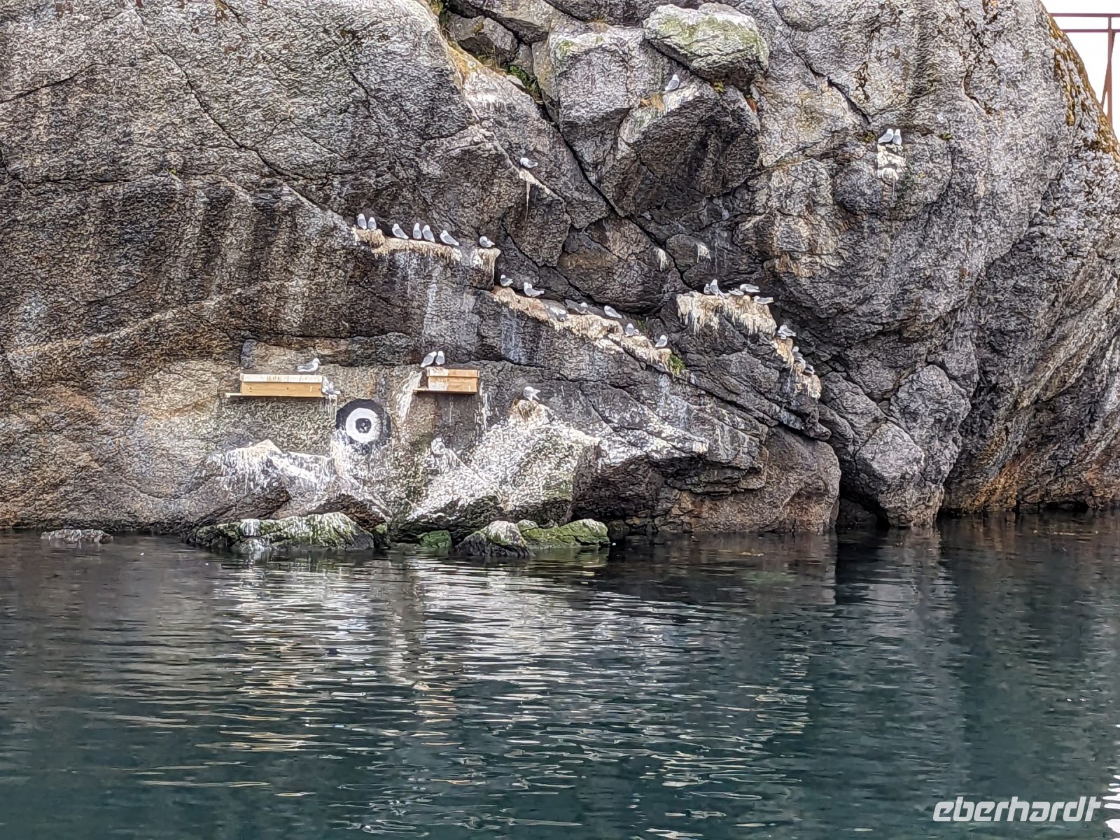 Dann fuhren wir mit unserem Boot in den Trollfjord, der sich nach schmaler Zufahrt als kesselartig ins Land hineinreichender Seitenarm des Raftsunds weitet. Mit einem guten Kilometer Länge und 800 m Breite nach einer nur 100 m breiten Zufahrt ist er eine Besonderheit und seine Entstehung wird einer Laune der Troll-Fabelwesen zugeschrieben. Hier lag das Boot ruhig und wir kosteten als Imbiss eine gegendtypische Lachssuppe. Nach der Wiederausfahrt aus dem Trollfjord begann die eigentliche „Seeadler-Safar“. Ein Crewmitglied, das uns vorher erklärt hatte, was ablaufen würde, warf Fisch und Krabben in die Luft und lockte damit zunächst viele Möwen an. Die erregten wiederum die Aufmerksamkeit der Seeadler, die offensichtlich am so bereitwillig geworfenen Futter teilhaben wollten. Und tatsächlich segelten sie mehrfach herbei, die Könige der Lüfte. Mindestens ein halbes Dutzend Seeadler konnten wir beobachten, die teilweise in nur zwei drei Meter Entfernung an uns vorbeiflogen. Einige von uns sahen sogar einen Schweinswal, wofür es auch ein Beweisfoto gibt.