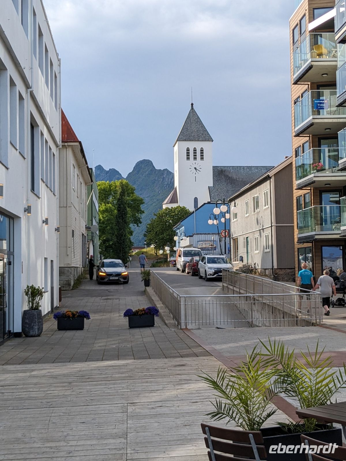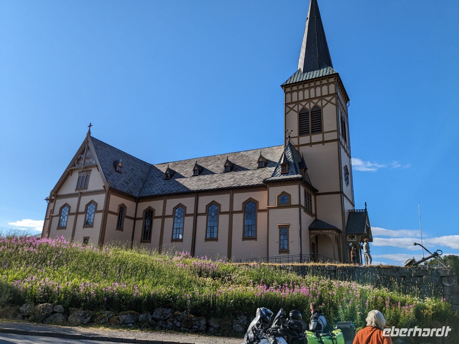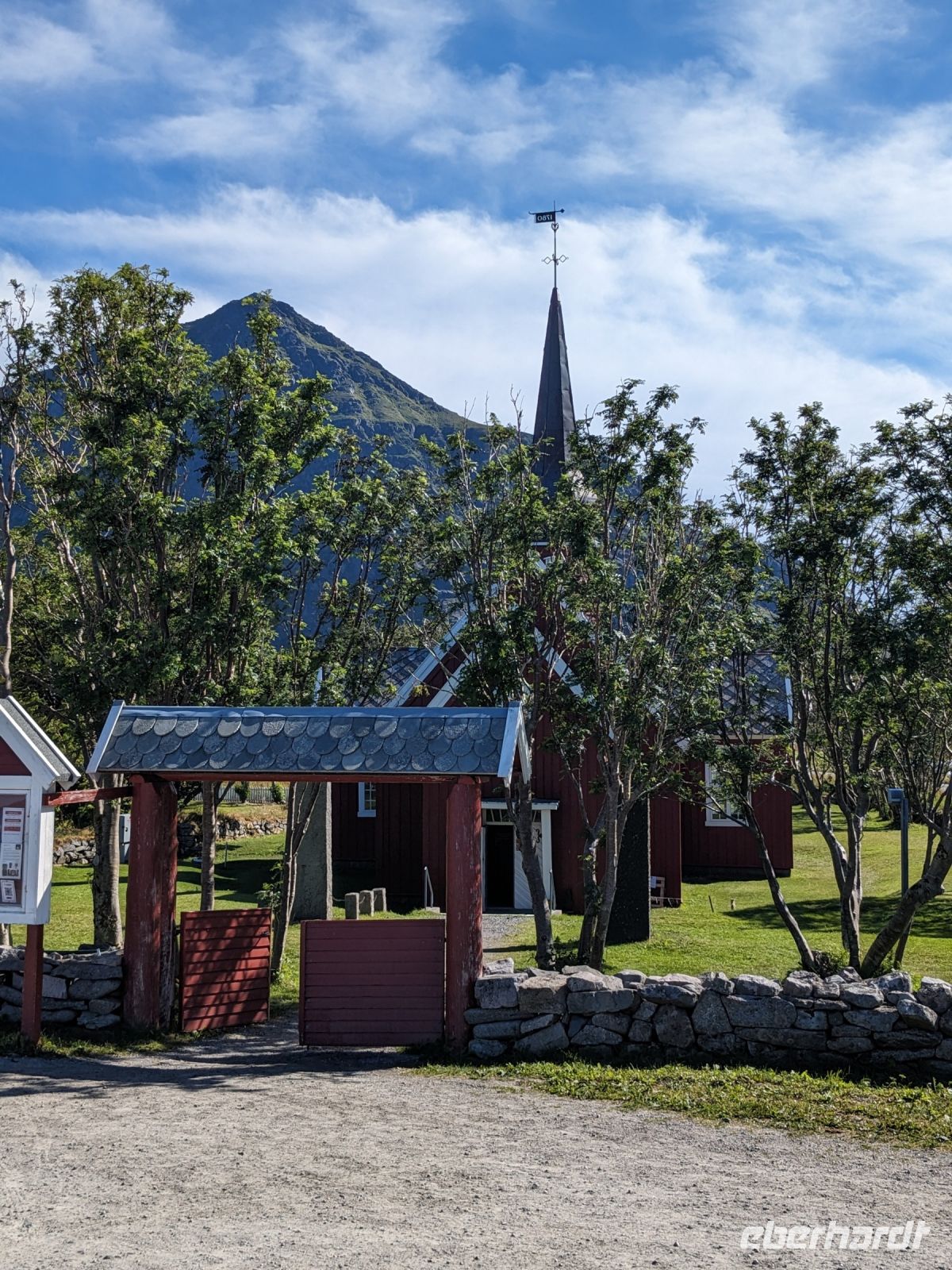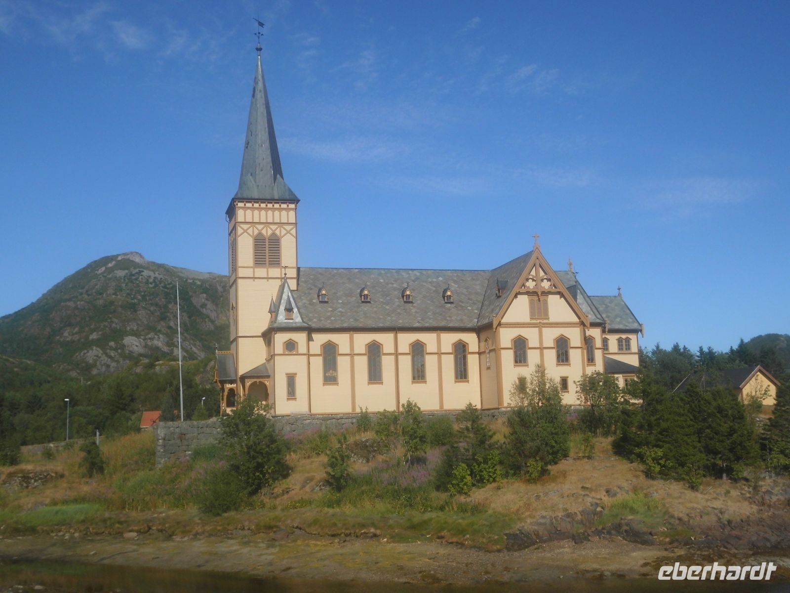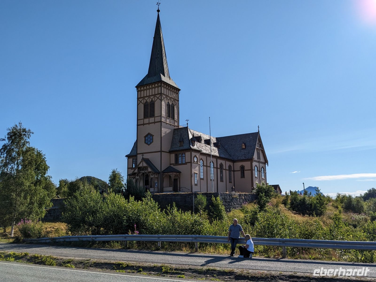 Herrliches Wetter versüßte uns den Tag von Anfang an mit strahlendem Sonnenschein und oft wolkenlosem Himmel. Zauberhafte, mitunter fast unwirklich anmutende Bilder boten sich uns auf unserer Fahrt nach Süden. Einen ersten Fotostopp machten wir an der als „Lofotenkathedrale“ bekannten Pfarrkirche des Ortes Kabelvåg. Eigentlich heißt sie „Vågan-kirke“, wurde 1898 im neugotischen Stil errichtet und bietet als größte Kirche der Inselgruppe 1200 Menschen Platz.