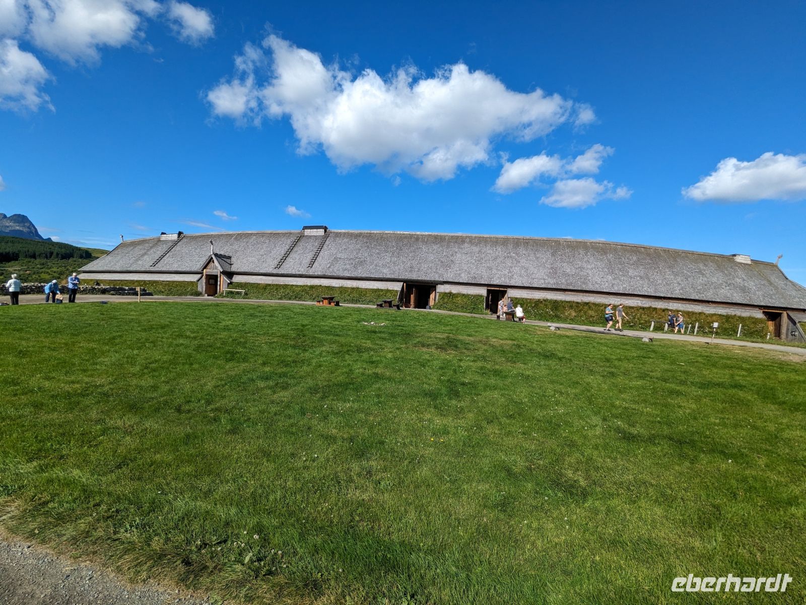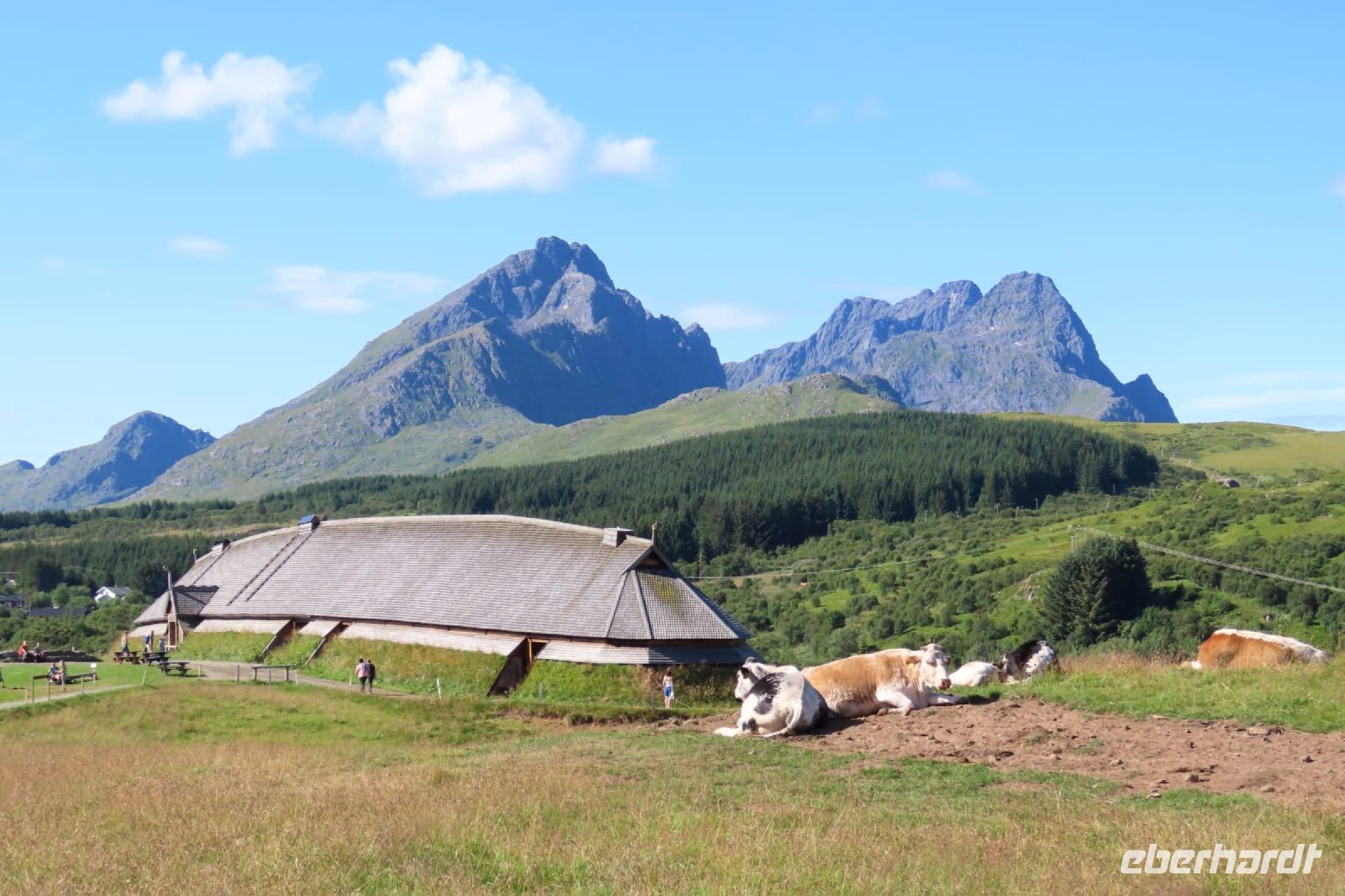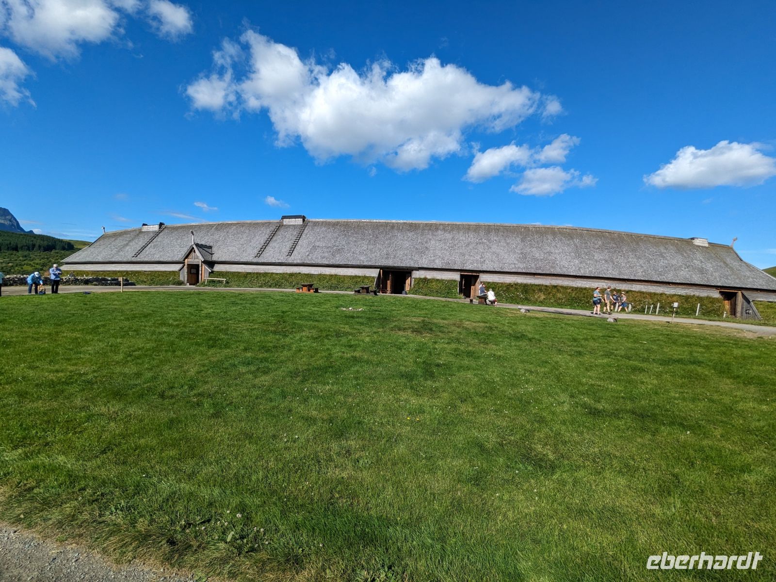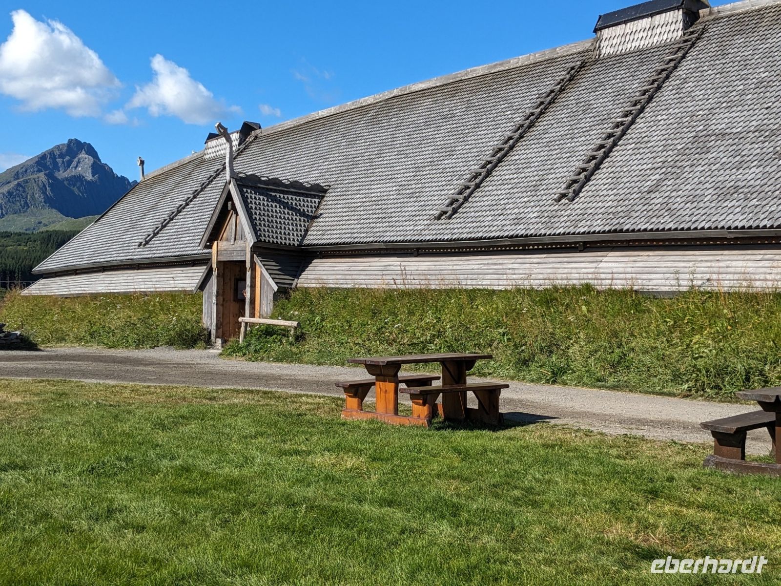 Dann stand als nächstes ein Besuch in „Lofotr“ an, dem Wikinger-Museum, das in einem originalgetreuen Nachbau eines wikingischen Häuptlingssitzes untergebracht ist. Nachdem in den 1980er Jahren ein Bauer beim Pflügen Scherben und Reste aus der Wikingerzeit entdeckt hatte, fand eine groß angelegte archäologische Untersuchung statt. Die Ausgrabung förderte unter anderem die Überreste des größten bisher bekannten wikingischen Clansitzes zutage. Sein direkt neben der Fundstelle mit 83 m Länge errichteter originalgetreuer Nachbau ist das größte Langhaus aller Wikingermuseen. Bei einer kleinen Einführung in die Geschichte des Museums und der Ausgrabung, vor allem aber in den Alltag der Wikinger, wurden wir auf den Besuch des Ausstellungsgeländes eingestimmt. Im nachgestalteten Häuptlingssitz sind die Räume so angeordnet, wie sie ursprünglich waren und man kann bis auf die originalen Ausstellungsstücke in den Vitrinen alles anfassen und sich mit (nachgebauten) Gegenständen aus der wikingischen Vergangenheit des 6. – 10. Jh. vertraut machen. Hier in „Lofotr“ wurden liebevoll die meisten wichtigen Elemente wikingischen Lebens nachgestaltet.