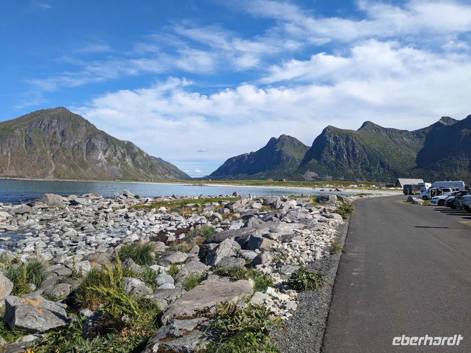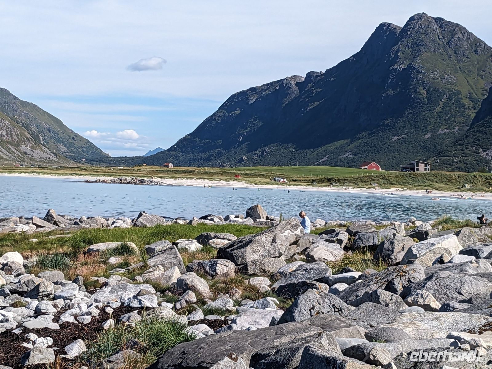 Einen Mittagsimbiss im Bus mit der entsprechenden Pause gab es dann am größten Badestrand der Lofoten bei Flakstad, in dem tatsächlich einige Gäste des angrenzenden Campingplatzes im glasklaren Atlantikwasser badeten.