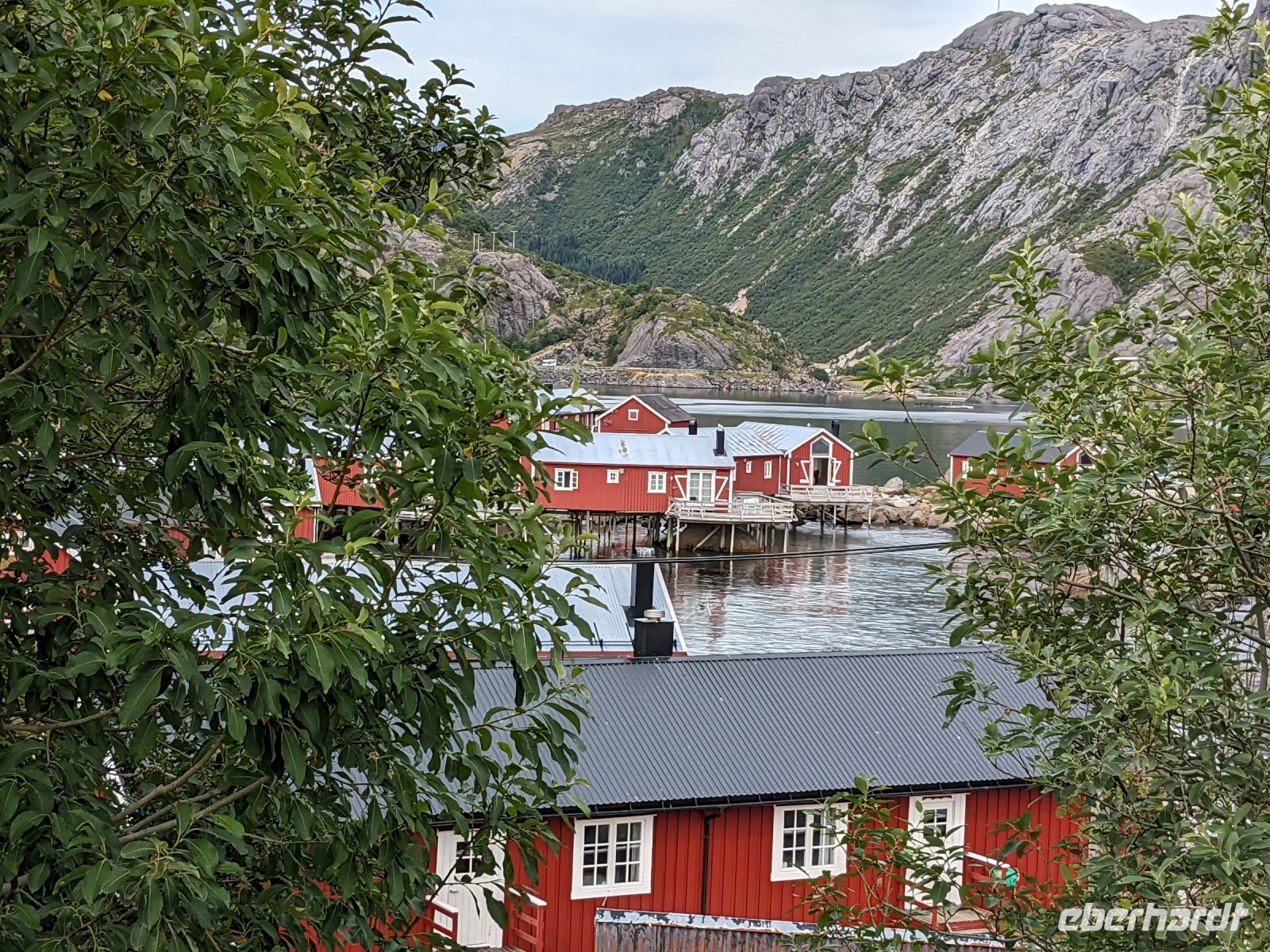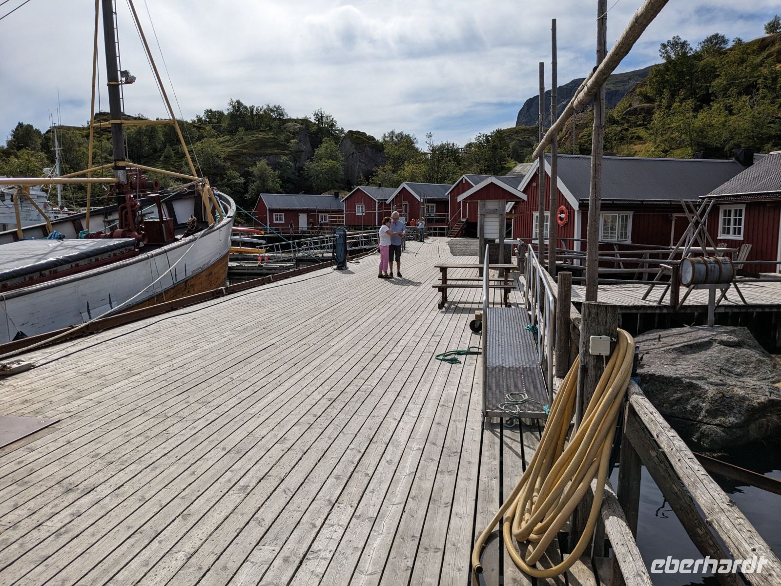 Nächster Höhepunkt war die Fahrt auf einem Seitenweg in das heute als UNESCO-Weltkulturerbe original bewahrte Fischerdörfchen Nusfjord. In dieser entzückenden Siedlung scheint für den Betrachter die Zeit stehen geblieben zu sein. Die Atmosphäre hier ist für den Norden des alten Norwegens typisch und zeigt besser als ein Dokumentarfilm die Besonderheiten in einem solchen abgeschiedenen Lofotenwinkel – auch wenn heute touristische Einrichtungen das Bild leicht verändern. Aber die hölzernen Anlegestellen der Fischkutter – bis heute der Hauptweg im Dorf - eine originelle alte Trankocherei, aber auch die Häuser der einstigen Verwaltung und der „Landhandel“ genannte Dorfladen taugen jederzeit als Filmkulisse.
