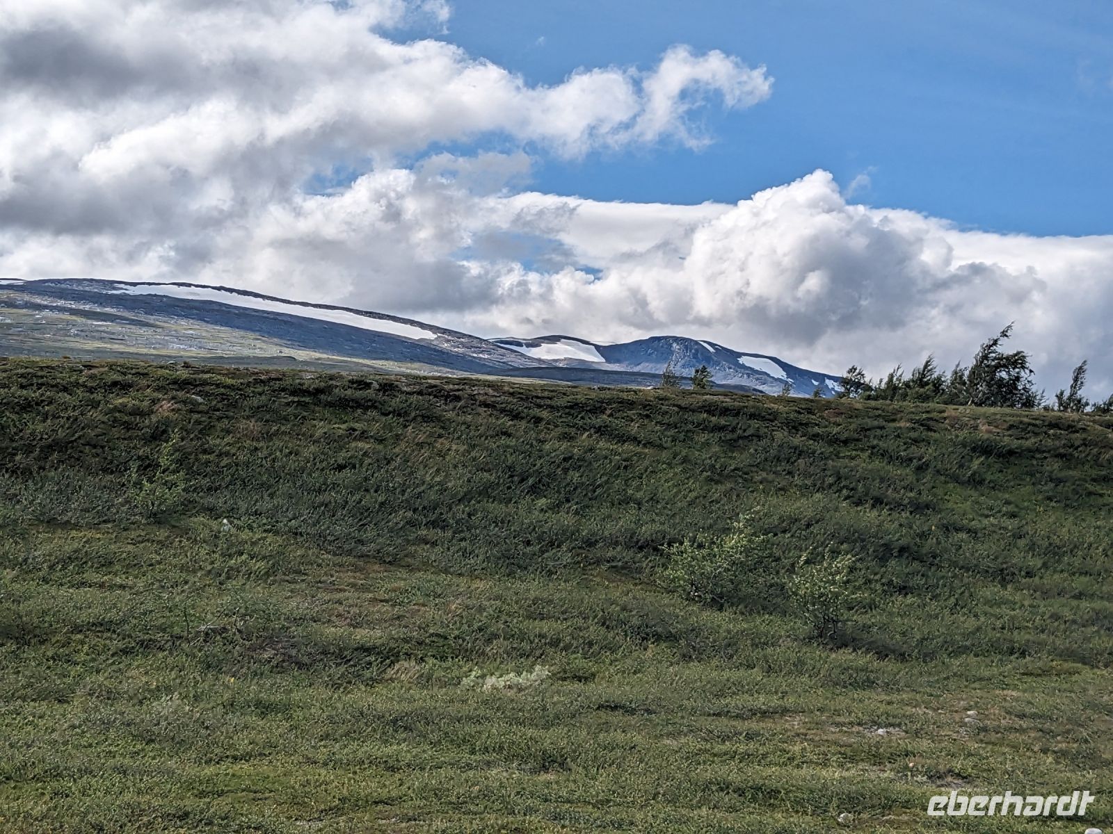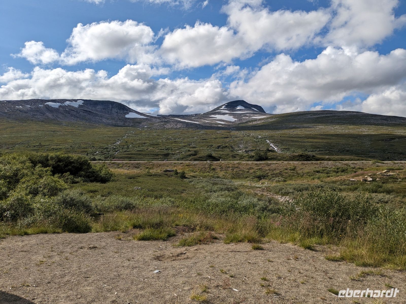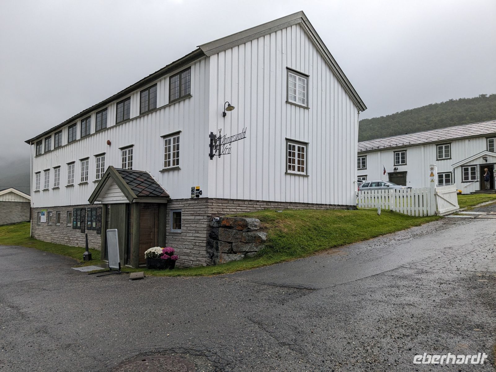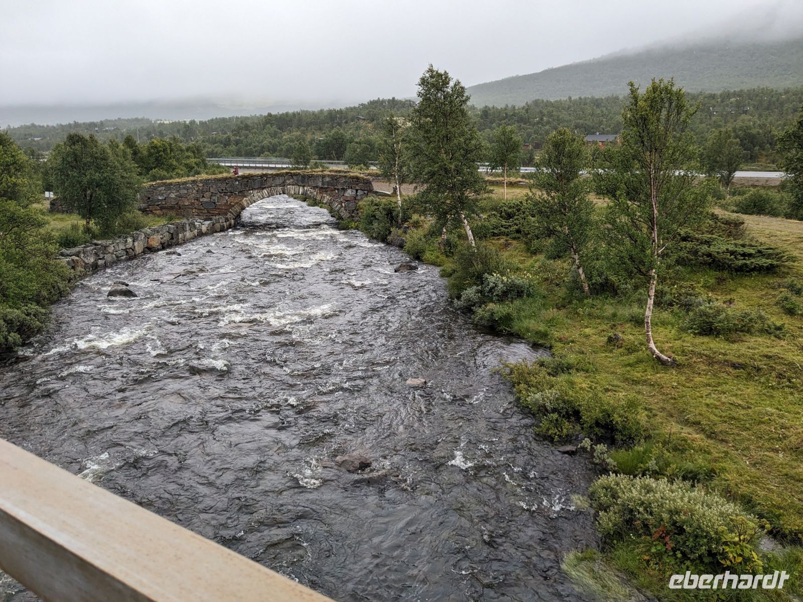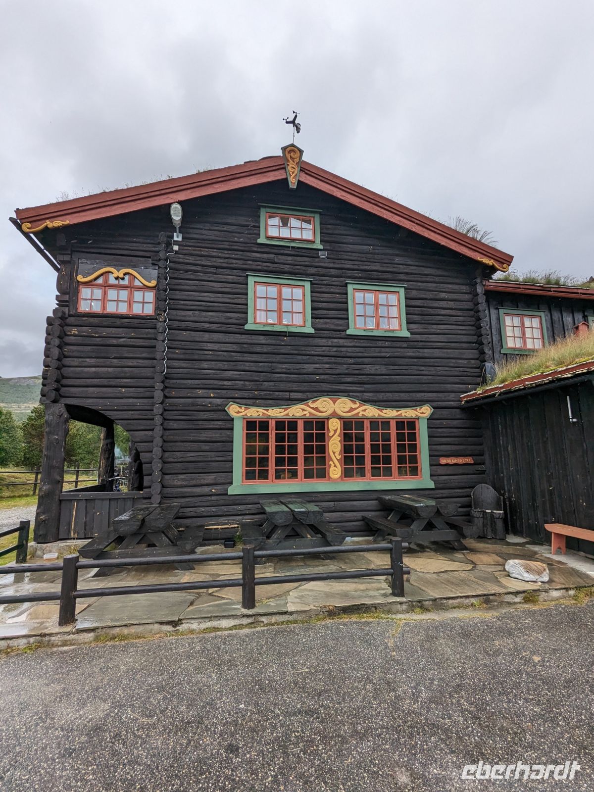 Über Oppdal, das „Tor zum Süden“ erreichten wir Südnorwegen und gleich darauf das dramatisch vom Flüsschen eingeschnittene Drivatal. Das Wetter war an diesem Tag schlecht, so dass wir vor dem Dovrefjell nur einen Fotostopp in Kongsvoll einlegten, einem heute als Hotel und Wanderunterkunft fungierenden großen ehemaligen Königshof mitten auf dem historischen Königsweg, der durch Drivatal und über das Dovrefjell führte – fast mit demselben Verlauf wie heute die E 6. Danach ging es bei Regen und tief hängenden Wolken weiter zum Dovrefjell. Hier und im nachfolgenden Gudbrandsdal gibt es die meisten Sagen über die Umtriebe der gefährlichen Trolle und Zauberwesen, die auf den Hochflächen der Fjelle und in den Wäldern und Äckern der Flusstäler hausen sollen. Die Überquerung des Dovrefjells bei leider schlechtem Wetter und schlechter Sicht, war einer der letzten Landschaftshöhepunkte dieser Reise. Wir legten einen Stopp ein bei Dovregubbens Hall ein, die dem Volksmund nach nahe der Unterkunft des gefährlichsten und größten aller Trolle errichtet wurde. Das im Stile eines traditionellen alten Bauerngehöfts errichtete kleine Gasthaus ist malerisch. Zudem gibt es ganz in der Nähe eine historische Brücke des alten Königsweges.