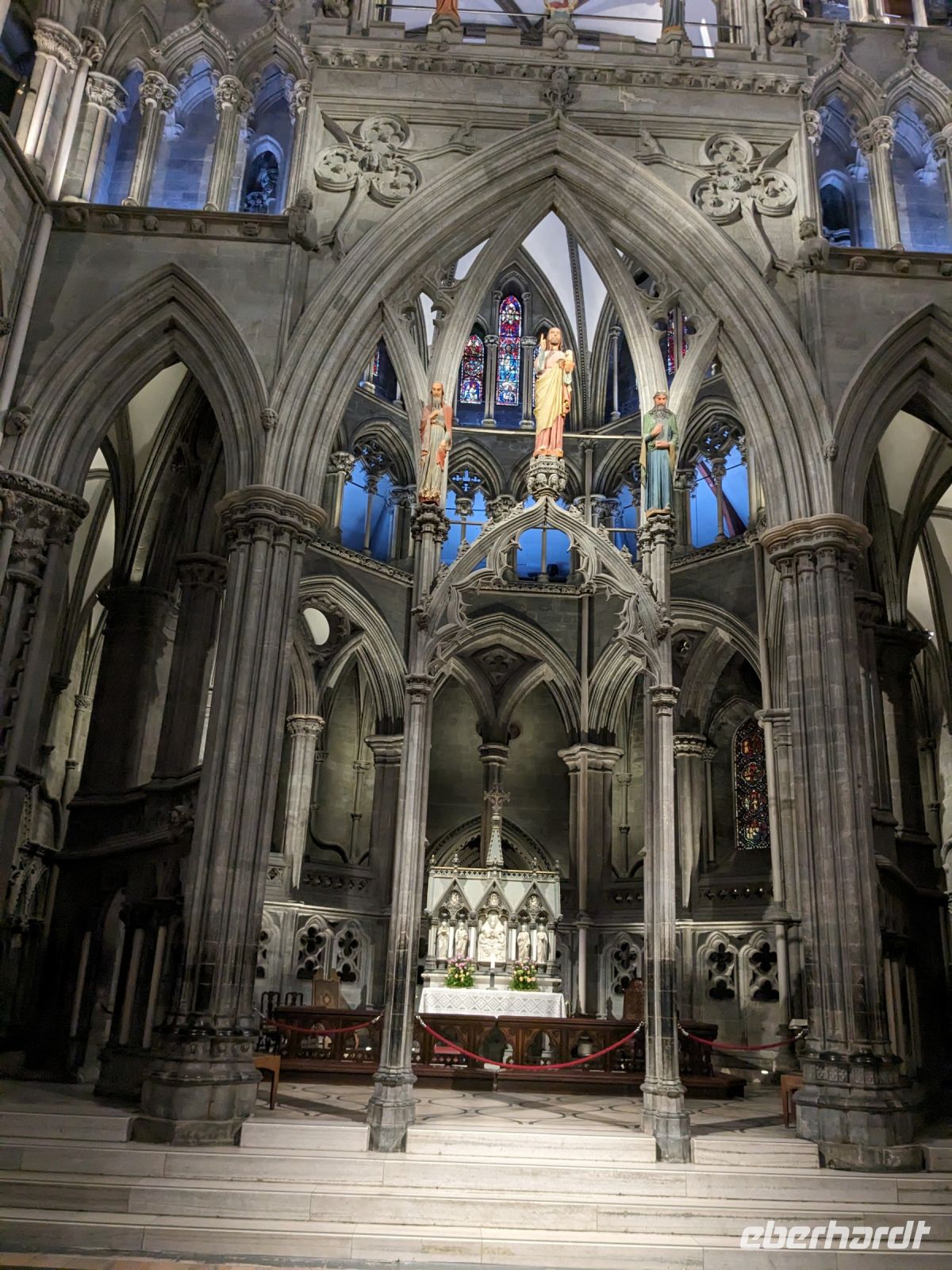 Wir begannen die Besichtigung mit dem berühmten Nidarosdom, dem größten und bekanntesten Kirchenbauwerk in Norwegen und dem einst wichtigsten skandinavischen Wallfahrtsort. Der Dom wurde errichtet über der ursprünglich hölzernen Grabkapelle des Heiligen Olav, der als König recht gewaltsam Anfang des 11. Jh. das Christentum in Norwegen einführte und 1030 in der Schlacht bei Stiklestad zu Tode kam. Gleich darauf heiliggesprochen machten seine Gebeine und Reliquien die Stadt, die damals allgemein nur Nidaros genannt wurde, zum besuchten Wallfahrtsort, an dem zahlreiche Kirchen und Klöster entstanden. Der steinerne Kirchenbau wurde im 12. Jh. begonnen, verfiel nach der Reformation und wurde im 19. Jh. komplett neu aufgebaut. Man nutzte hierfür den nahe Trondheim vorkommenden grünen Seifenstein. Besonders schön und augenfällig ist die Westfassade des Domes – ausgeführt in englischer Manier als Schirmfassade..Bei einer kleinen Führung erlebten wir das Innere des Domes. Er ist zwar relativ dunkel, dennoch entfalten seine drei Schiffe im Langhaus und sein hoher Chor eine gewaltige Raumwirkung, wenn man sich erst einmal an das Dämmerlicht gewöhnt hat. Nach den zahlreichen Umbauten ist heute die Stelle mit ehemaligen Grab des Heiligen Olav nicht mehr genau bekannt. Sein Wahrzeichen aber, das Olavskreuz, findet sich bis heute in den Staatsflaggen aller skandinavischen Länder.