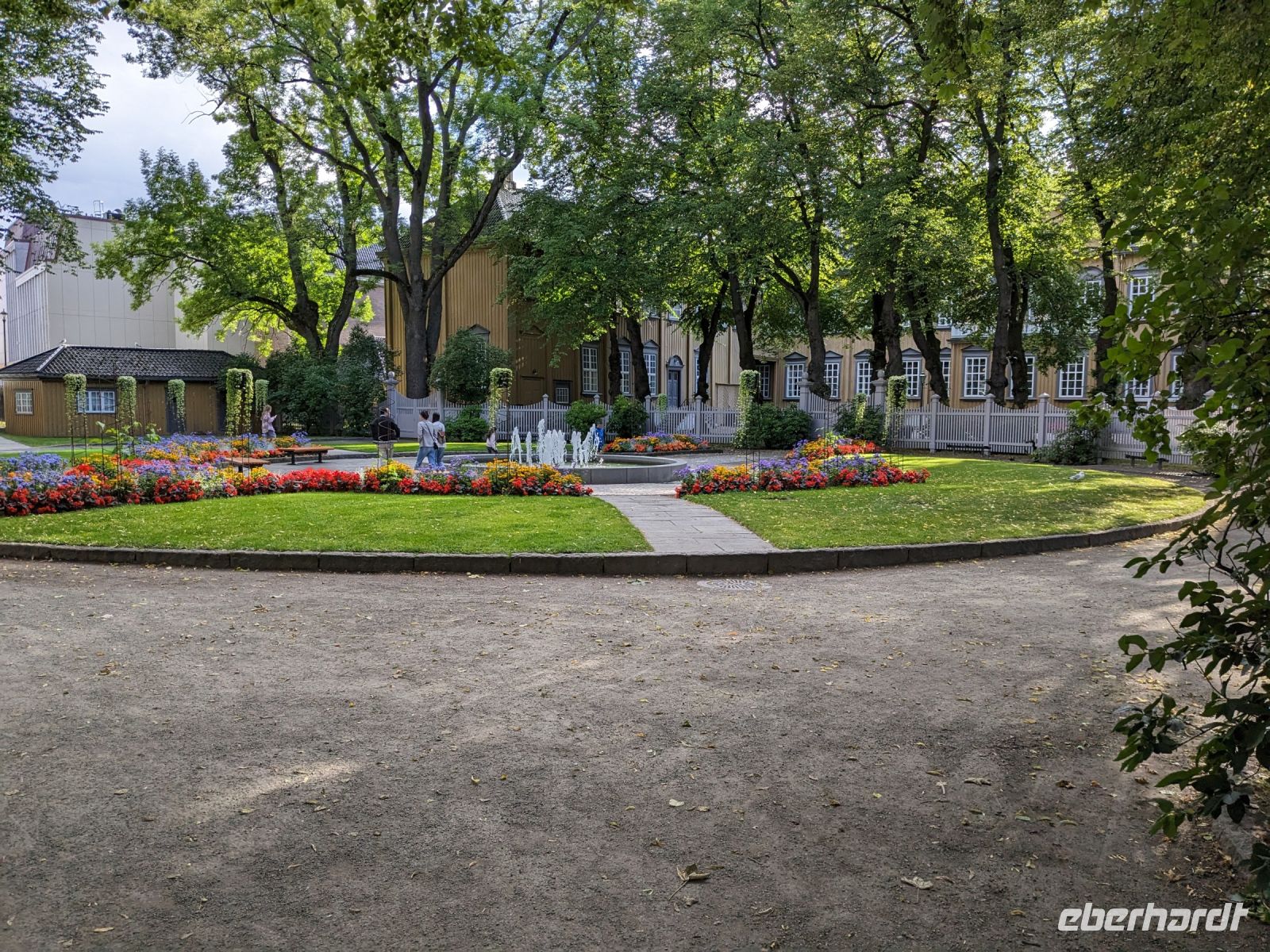 Nach dem Park setzten wir die Stadtrundfahrt im Bus fort und unsere Stadtführerin gab einen kurzen Abriss der Geschichte von Oslo. Durch Oslos Zentrum mit Domkirche, Blumenmarkt und der Einkaufsstraße Karl Johans Gate, dem Theater und dem historischen Universitätsgebäude, an dem der deutsche Baumeister Karl Friedrich Schinkel mitwirkte, fuhren wir vorbei, bevor wir das Königlichen Schloss zu Gesicht bekamen, das im klassizistischen Stil erbaut wurde und seit 1849 Königssitz ist. Schließlich kamen wir noch durch das älteste erhaltene Viertel Oslos, markiert durch die Häuser und offiziellen Gebäude der steinernen Altstadt. Nachdem die überwiegend aus Holzhäusern bestehende Stadt 1624 fast völlig abgebrannt war, befahl der damals herrschende Dänenkönig Christian IV. Neubauten aus Stein mit dazwischen gerade verlaufenden, einander rechtwinklig kreuzenden Straßen. Das hat dem Altstadtviertel seinen Namen „Kvadraturen“ eingetragen. Zudem erhielt die neue Stadt den Namen des Königs und hieß von da ab für 300 Jahre Kristiania, bis 1924 der alte Name wieder angenommen wurde.