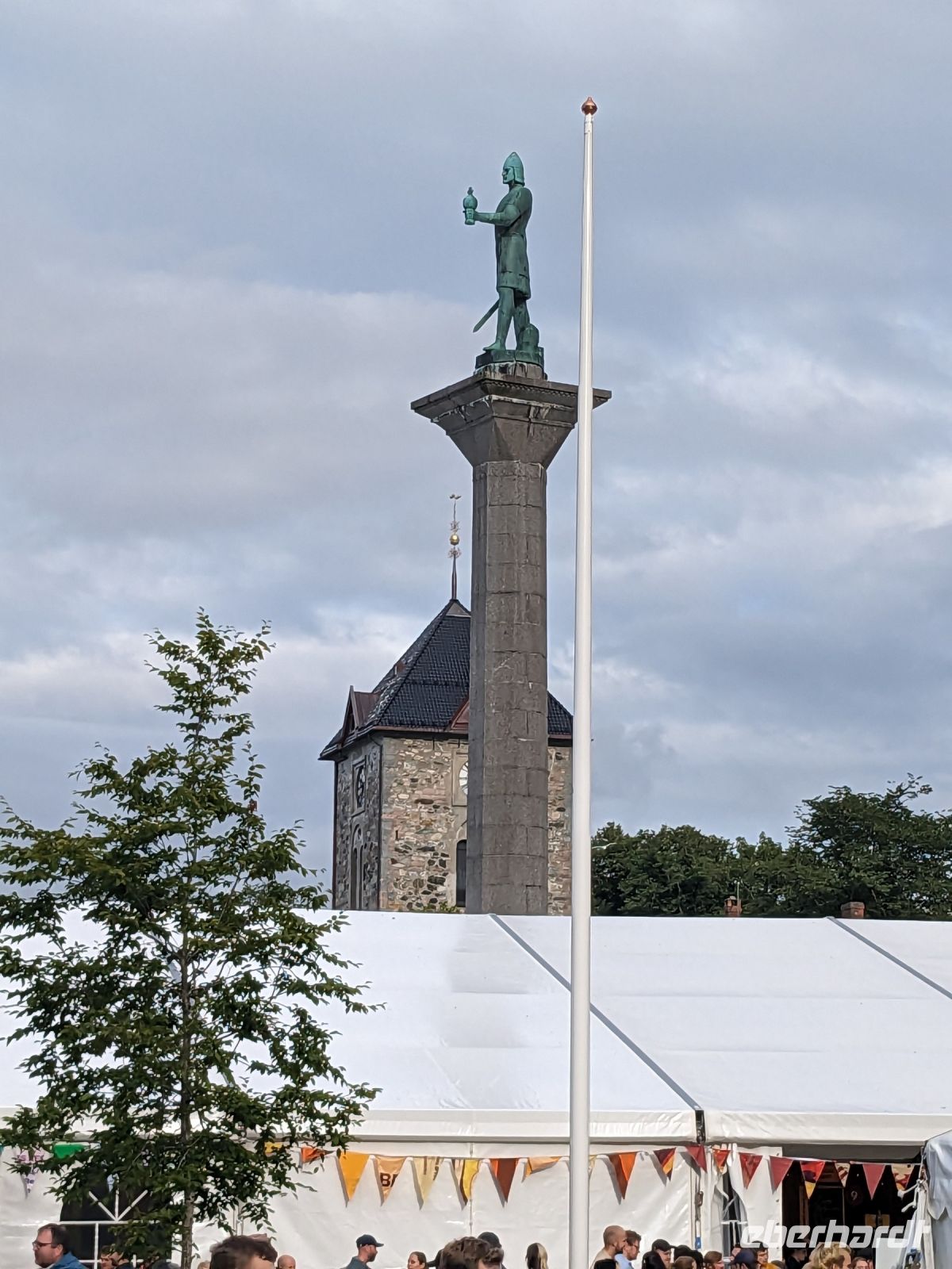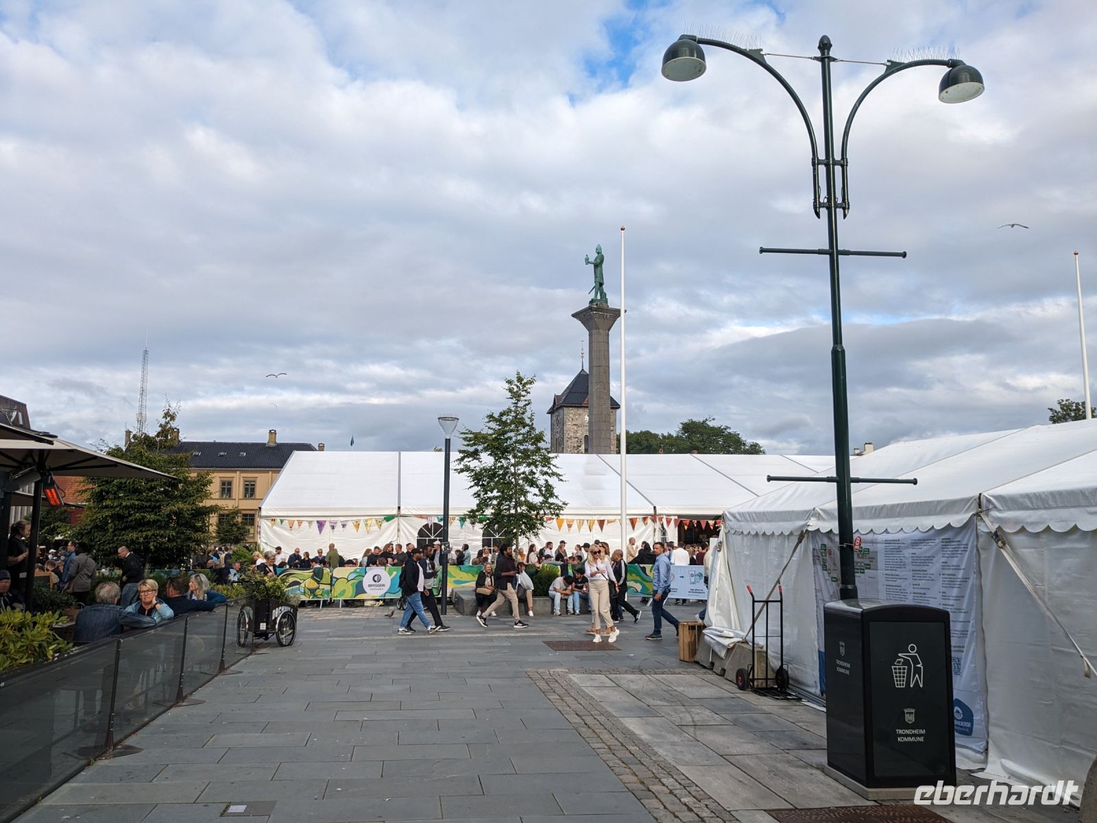 Schließlich erreichten wir den zentralen Markt, in dessen Mitte die Olavs-Säule steht, die allerdings nicht Olav den Heiligen ehrt, sondern einen seiner Vorgänger, König Olav I. Tryggvason, der als erster versucht hatte, in Norwegen das Christentum einzuführen. Viel war allerdings vom Markt nicht zu sehen, da alles durch die Zelte eines großen Bierfestivals verdeckt wurde, das einen der Höhepunkte der jährlich Ende Juli/Anfang August stattfindenden Olavstage darstellt, Trondheims bedeutendstes Stadtfest. Direkt am Markt, lag das Restaurant, in dem wir unser Abendessen einnahmen und von dem wir zurück ins Hotel marschierten