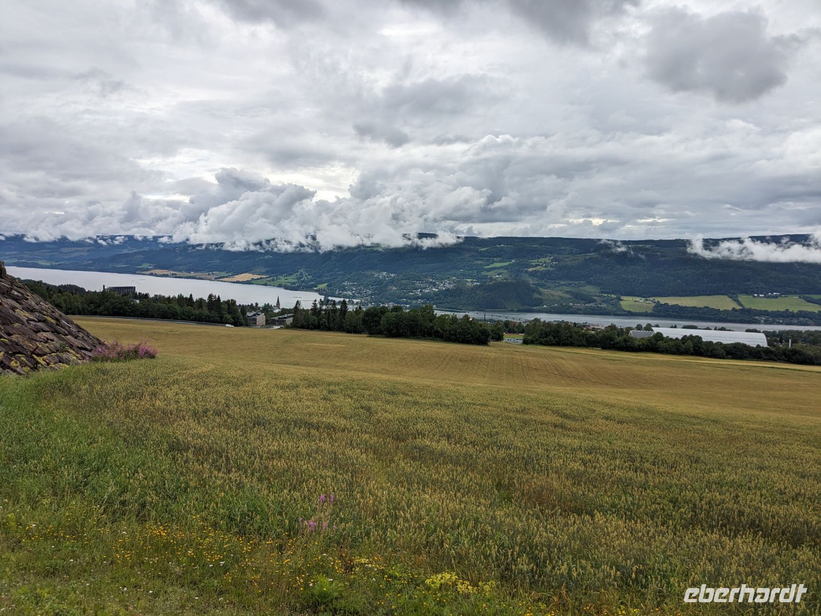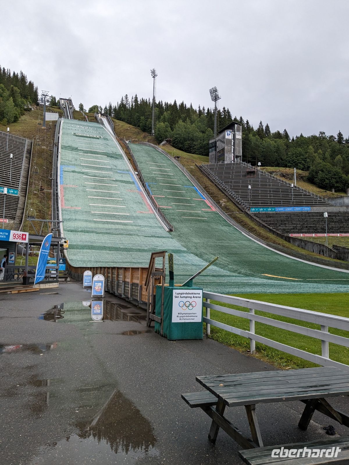 Den nächsten Halt auf unserem Weg nach Süden machten wir in Lillehammer, der Stadt der Winter-Olympiade von 1994. Die damals errichteten Schanzenanlagen sind schon von weitem sichtbar und lohnen einen Fotostopp. Hier sahen wir nicht nur die Schanzen selbst, sondern auch die gesamte Anlage mit dem alten Pressecenter, der steinernen Fackel für das olympische Feuer und Teile des ehemaligen Olympischen Dorfes. Von den Schanzenanlagen hat man zudem einen herrlichen Blick über den ins Tal eingebetteten Mjösasee, Norwegens größten und tiefsten See.