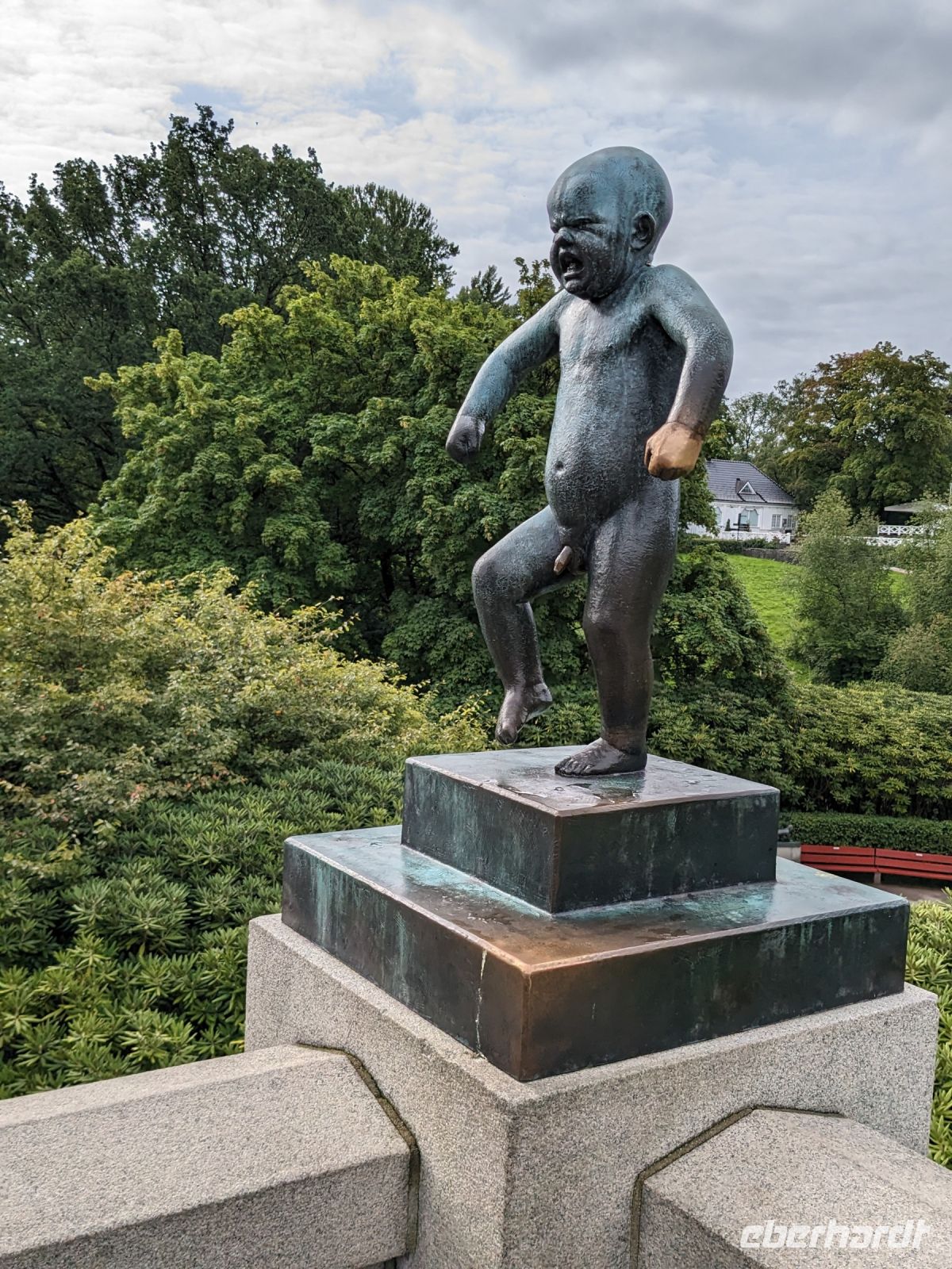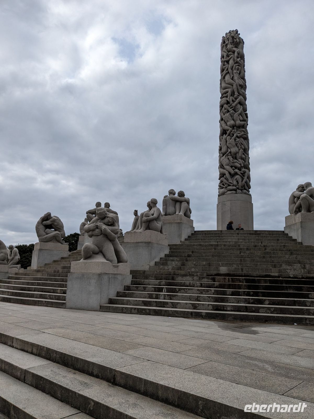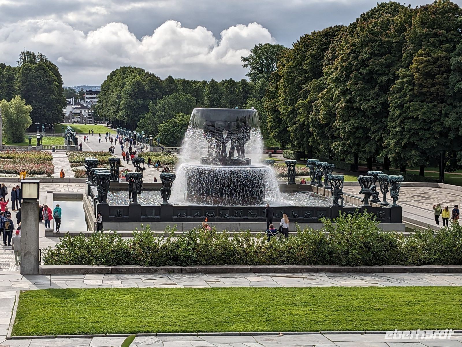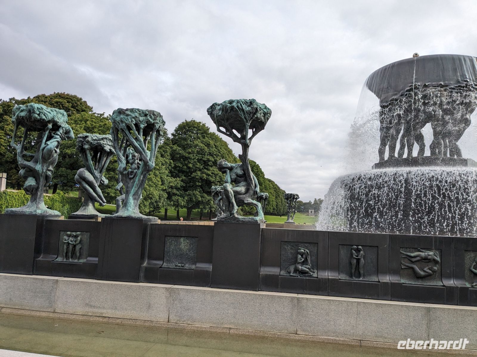 Reiseführerin Anna Gretha begrüßte uns am Treffpunkt neben dem oft als Hauptattraktion Oslos empfundenen Vigelandpark, dem mit fast 300 Hektar größten Stadtpark Norwegens. Gestaltet hat ihn zwischen 1907 und 1942 ein einziger Künstler mit seinen Ideen und Bildwerken. Gustav Vigeland, bedeutendster Bildhauer Norwegens, gestaltete den Park mit Figuren und Installationen, die seine Ideen zum „Zyklus des Lebens“ darstellen. Den ersten Höhepunkt und Auftakt unserer Runde durch den Park bildete der Hügel mit dem „Monolithen“. In harten Granit gehauen werden an einer einzigen Steinsäule in Reliefs mit über hundert Figuren die verschiedenen Lebensphasen des Menschenlebens zusammengefasst. Das Thema nahm Vigeland in allen Teilen seines Parkes immer wieder auf: der zentrale Brunnen zeigt die Lebensphasen mit menschlichen Begierden und Schwierigkeiten, das Zusammenleben und das Alleinsein oder auch die Auseinandersetzungen untereinander. Auf der Brücke im Park verkörpern Figuren die einzelnen Phasen des Lebens von der Geburt bis zum Tod.