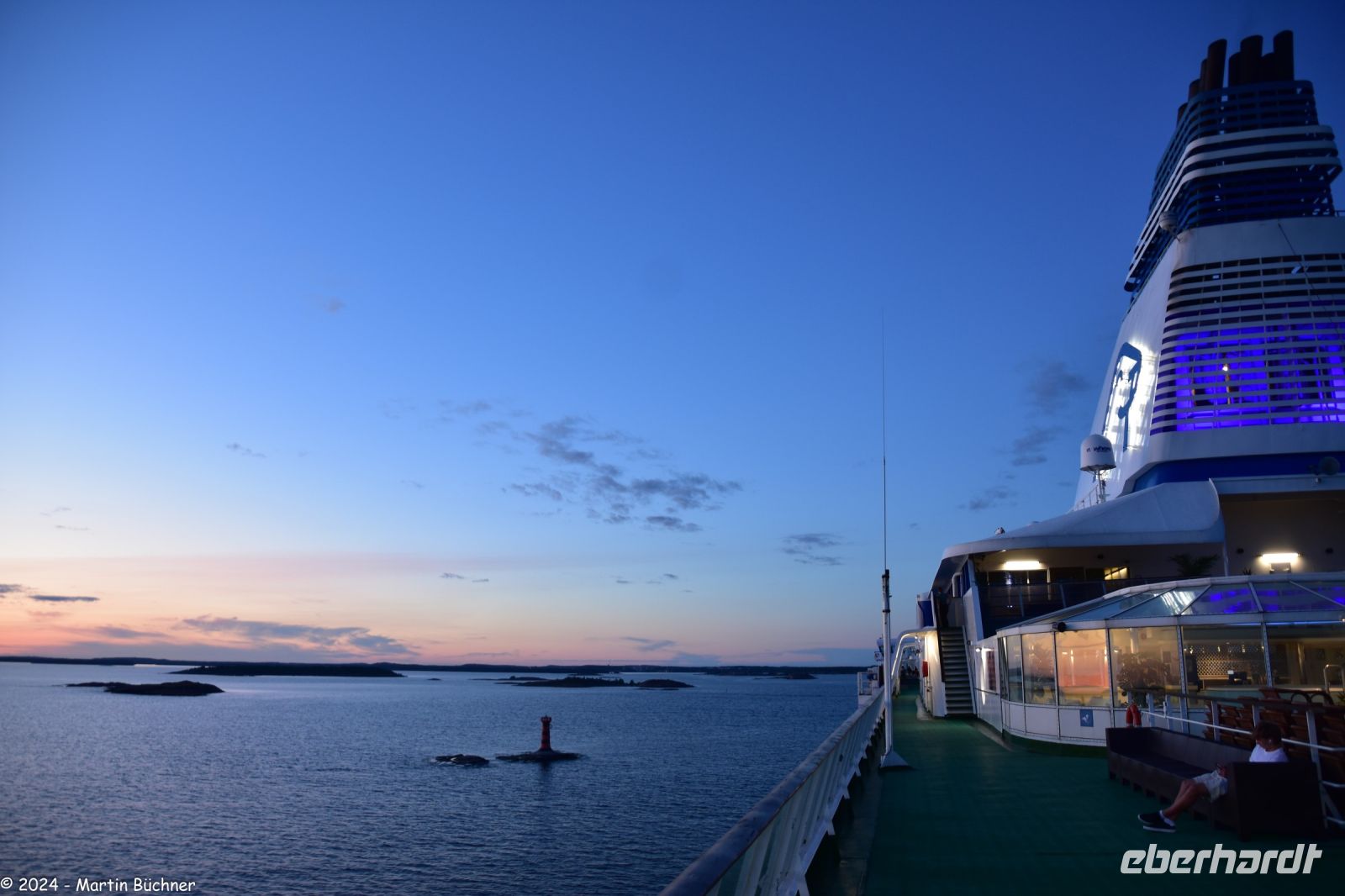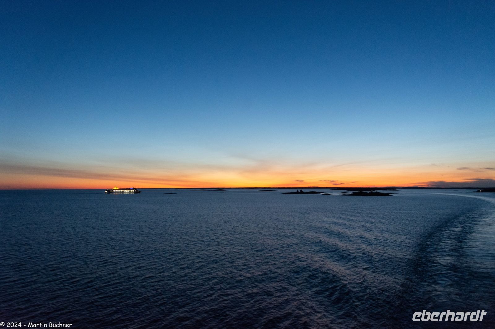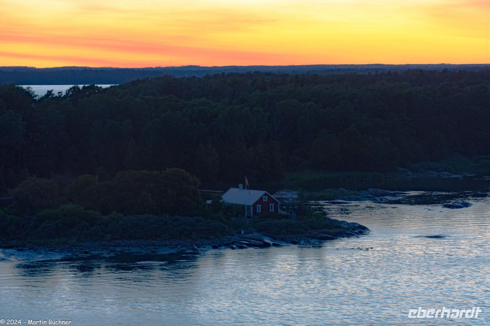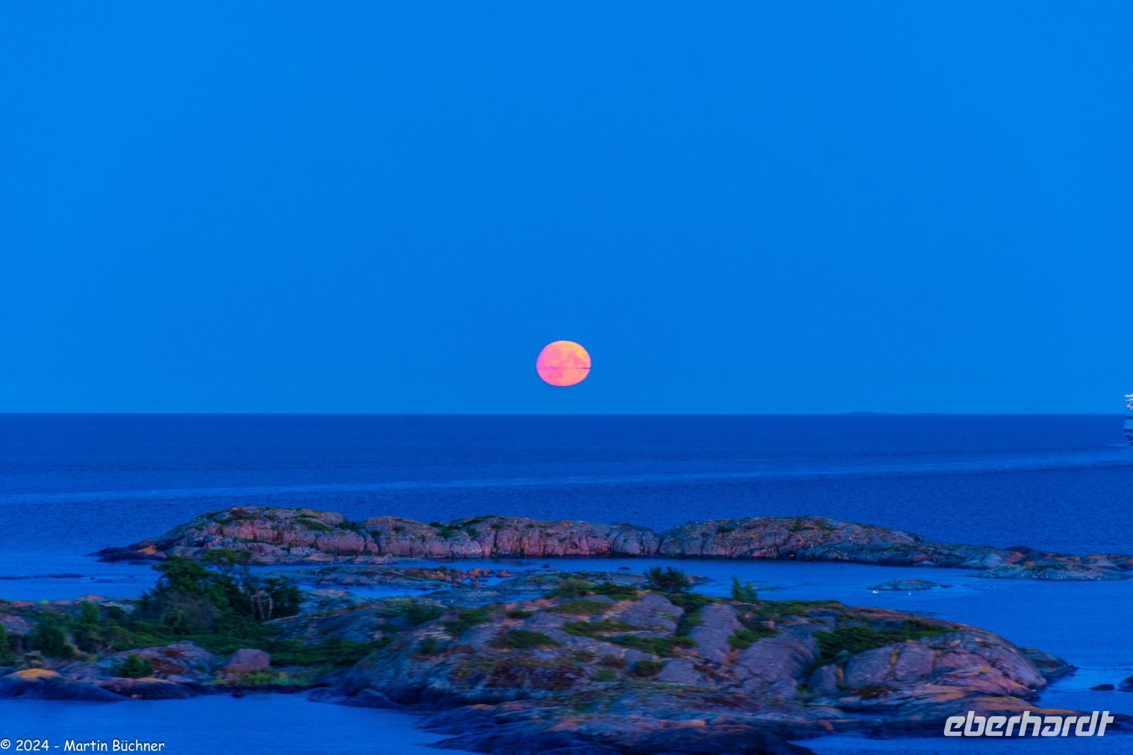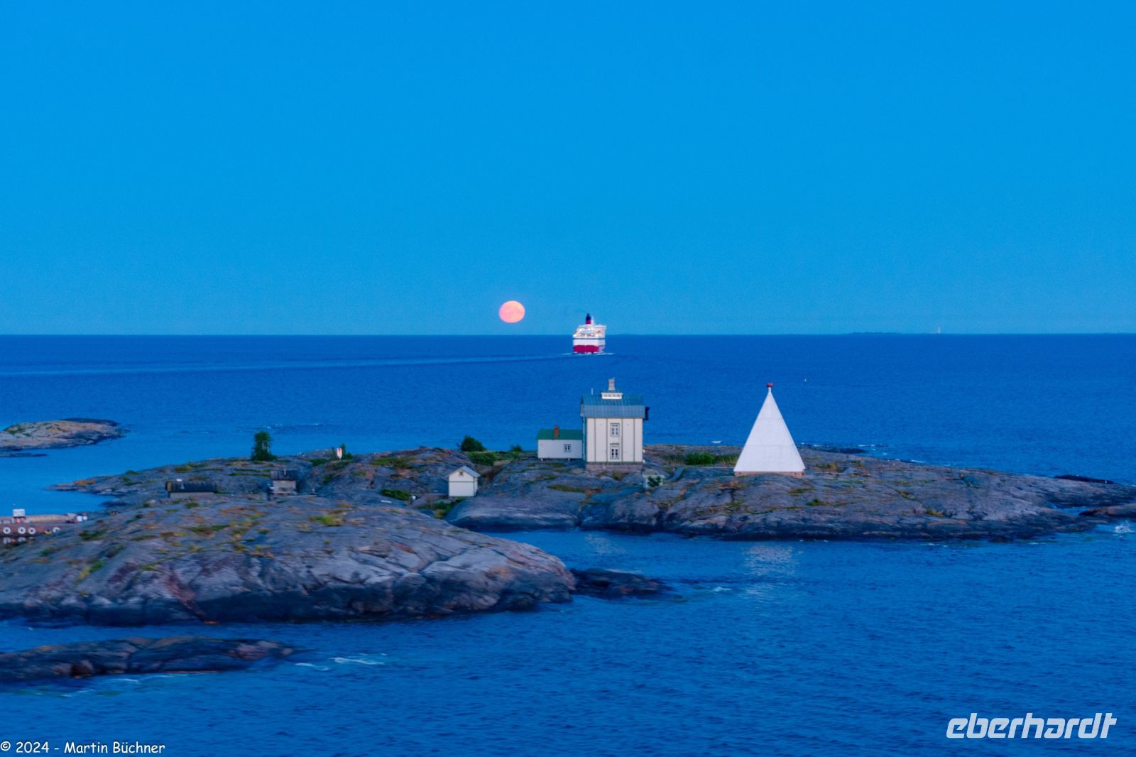 Ein passender Sonnenuntergang und ein riesiger, roter Vollmond runden das Erlebnis in den "Weißen Nächten" ab. Gegen Mitternacht, im Dämmerungslicht, erreichen wir die autonome, finnische Provinz Åland. Hafen und Hauptort sind Mariehamn.