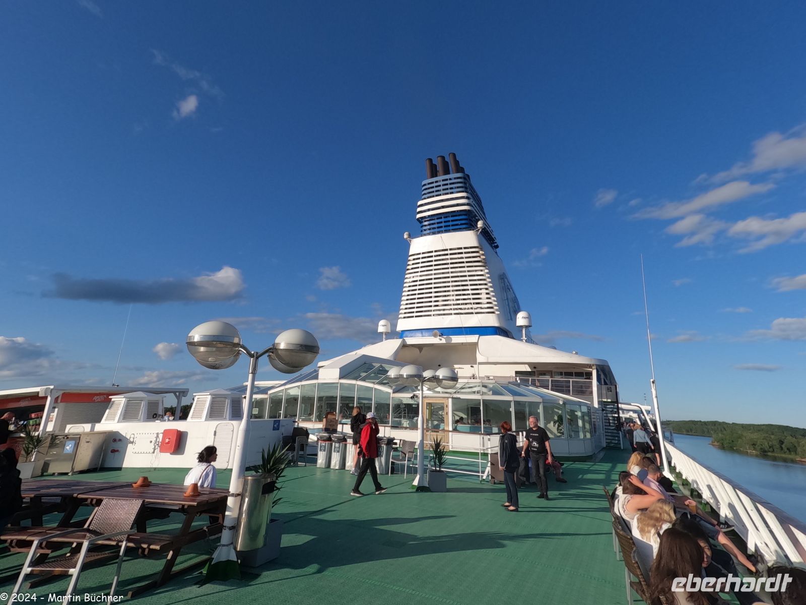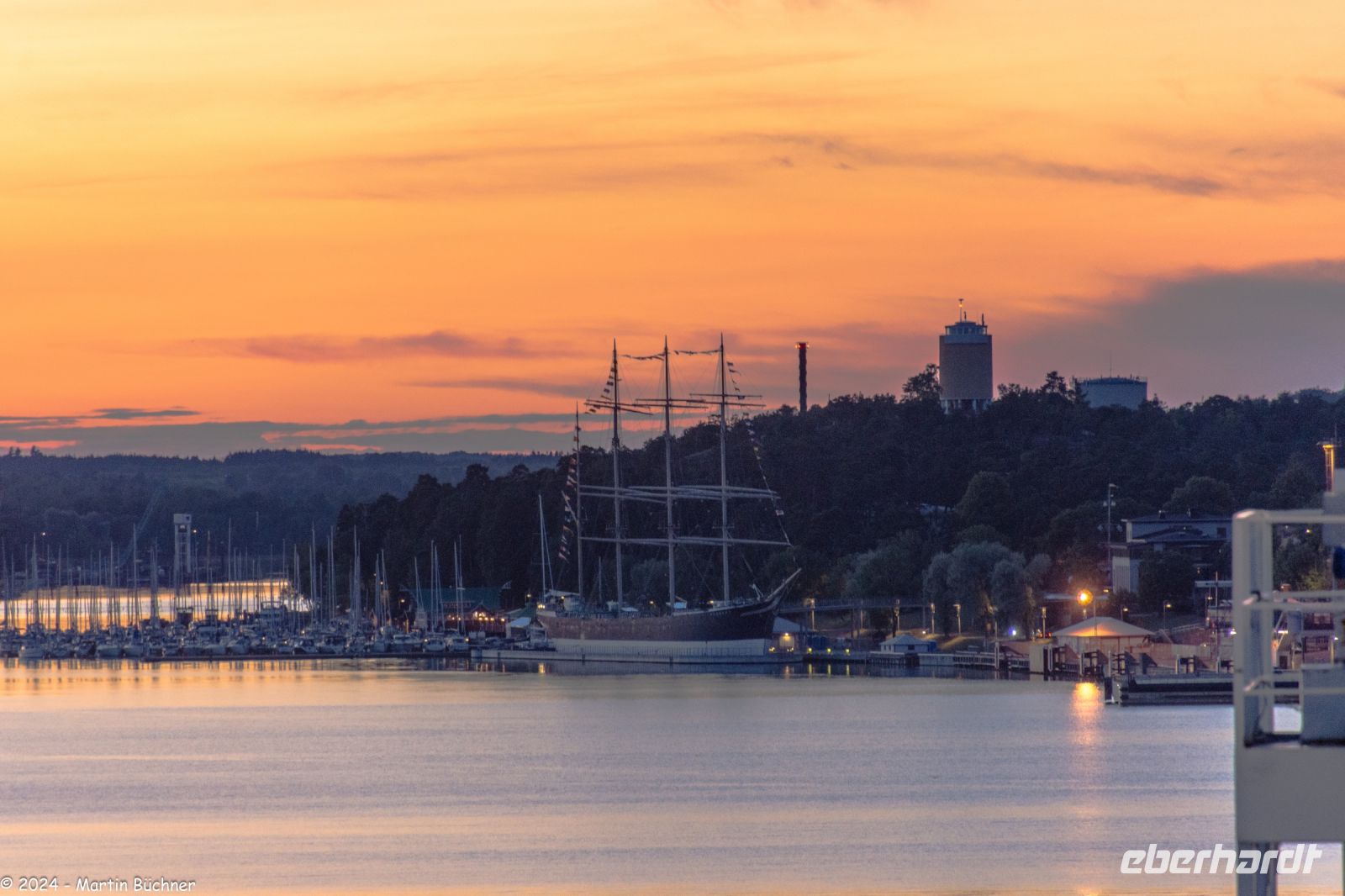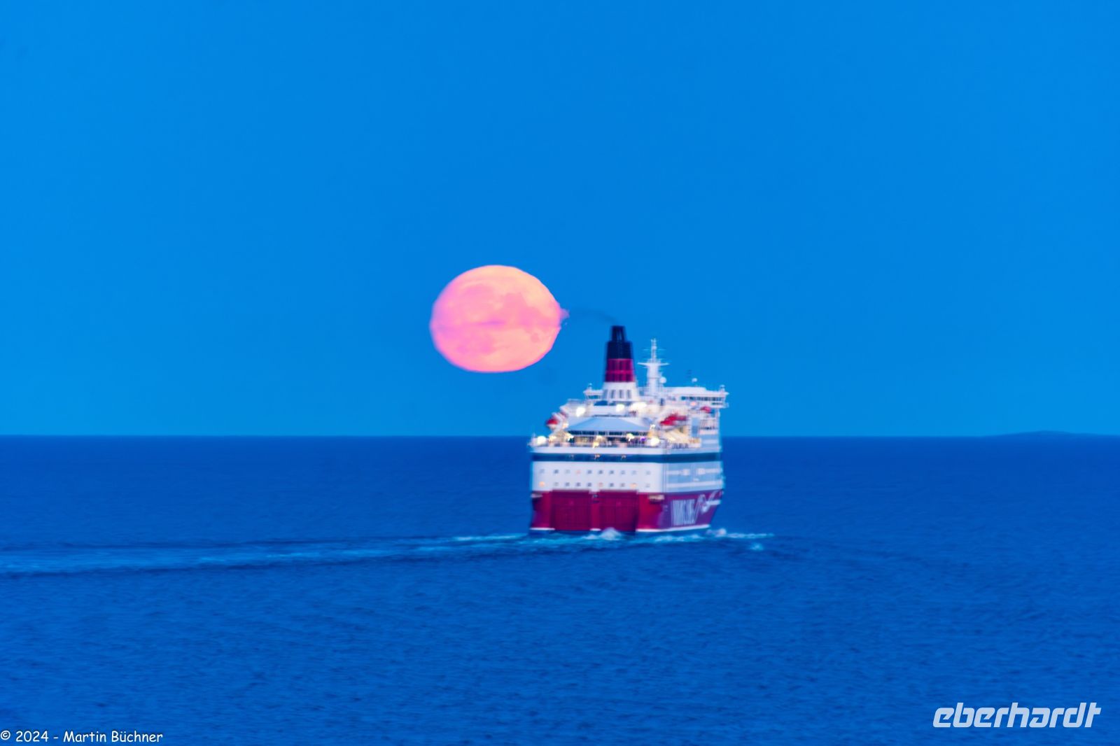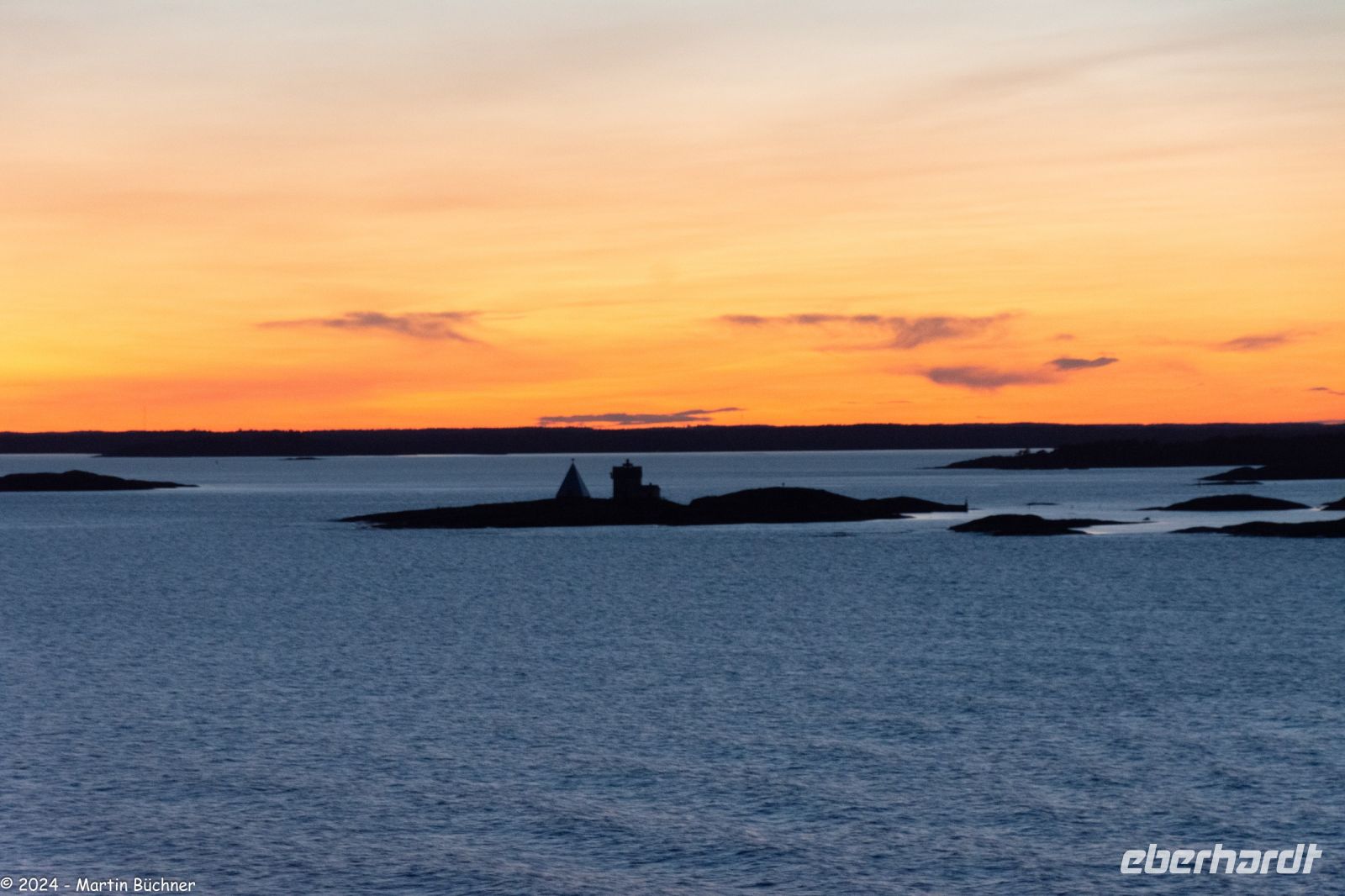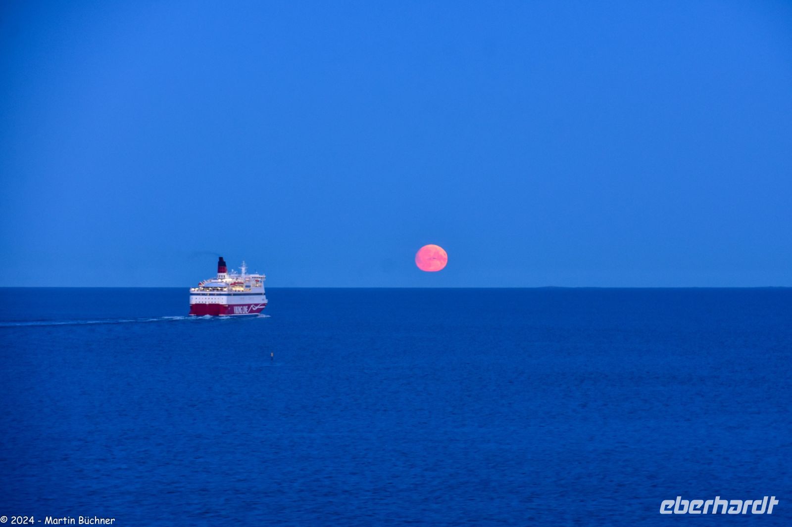 Ein passender Sonnenuntergang und ein riesiger, roter Vollmond runden das Erlebnis in den "Weißen Nächten" ab. Gegen Mitternacht, im Dämmerungslicht, erreichen wir die autonome, finnische Provinz Åland. Hafen und Hauptort sind Mariehamn.