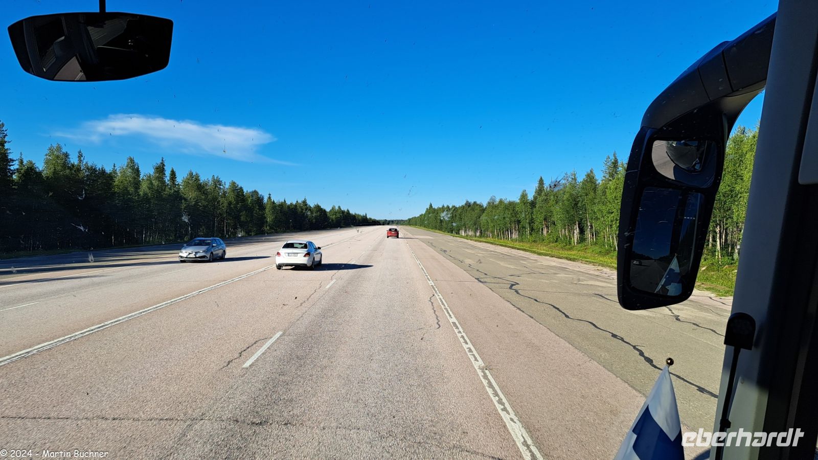 Von Mittelfinnland geht es über Oulu entlang des Nord-Endes des Bottnischen Meeresbusens. Bei Kemi biegt die E75 ab in Richtung Rovaniemi ab. Mit einer kleinen Zeremonie wagen wir den Schritt über den Polarkreis in die Arktis. Bei "arktischen Temperaturen" von 29°C besuchen wir ebenso den Weihnachtsmann und erledigen wichtige Weinachtspost 2024.
