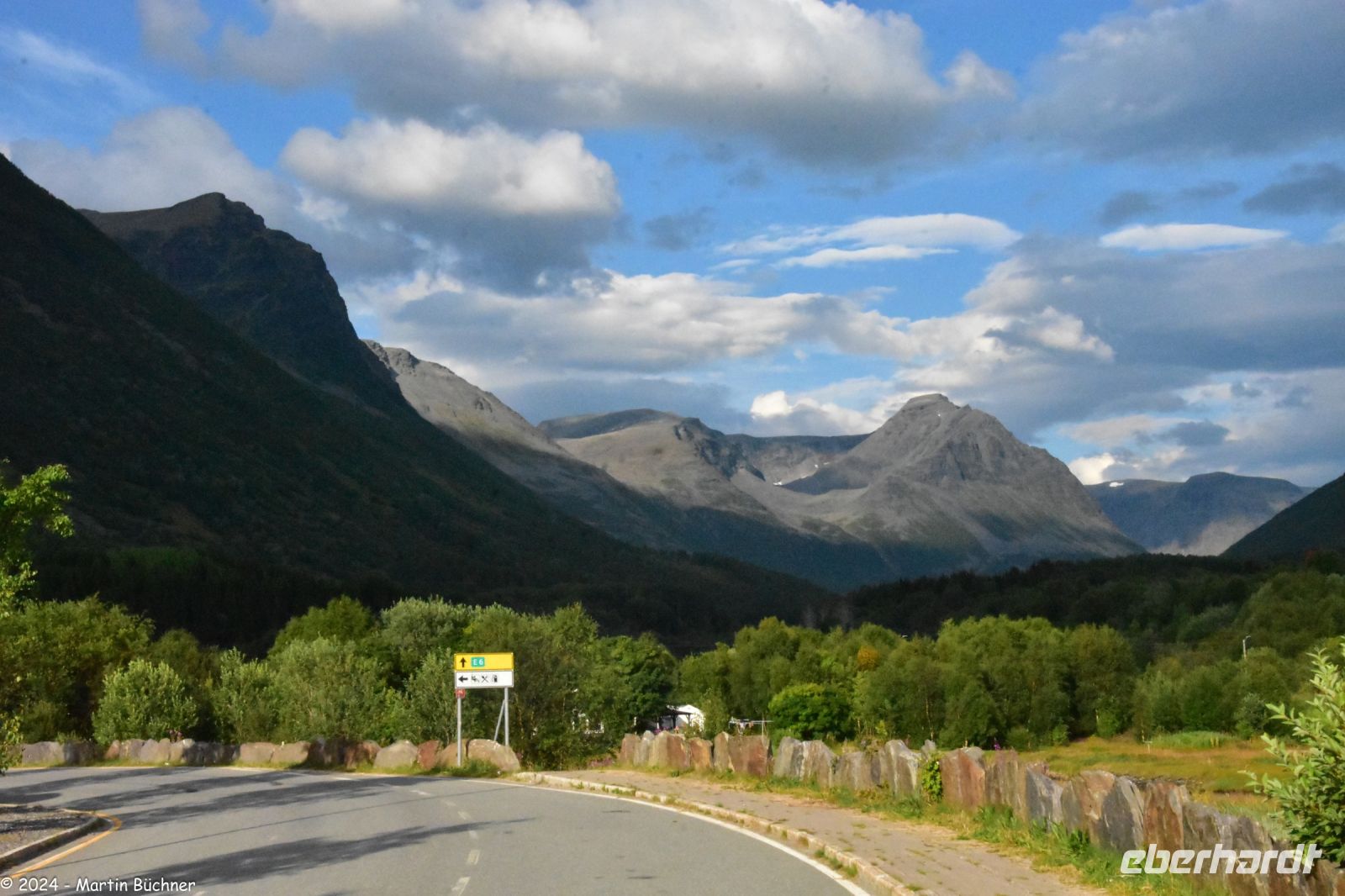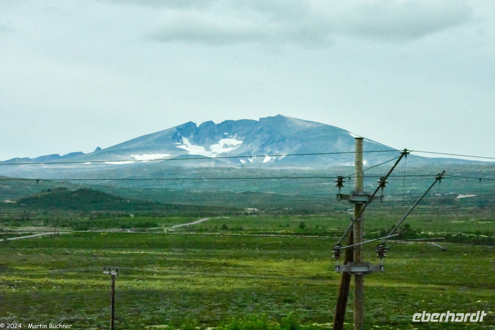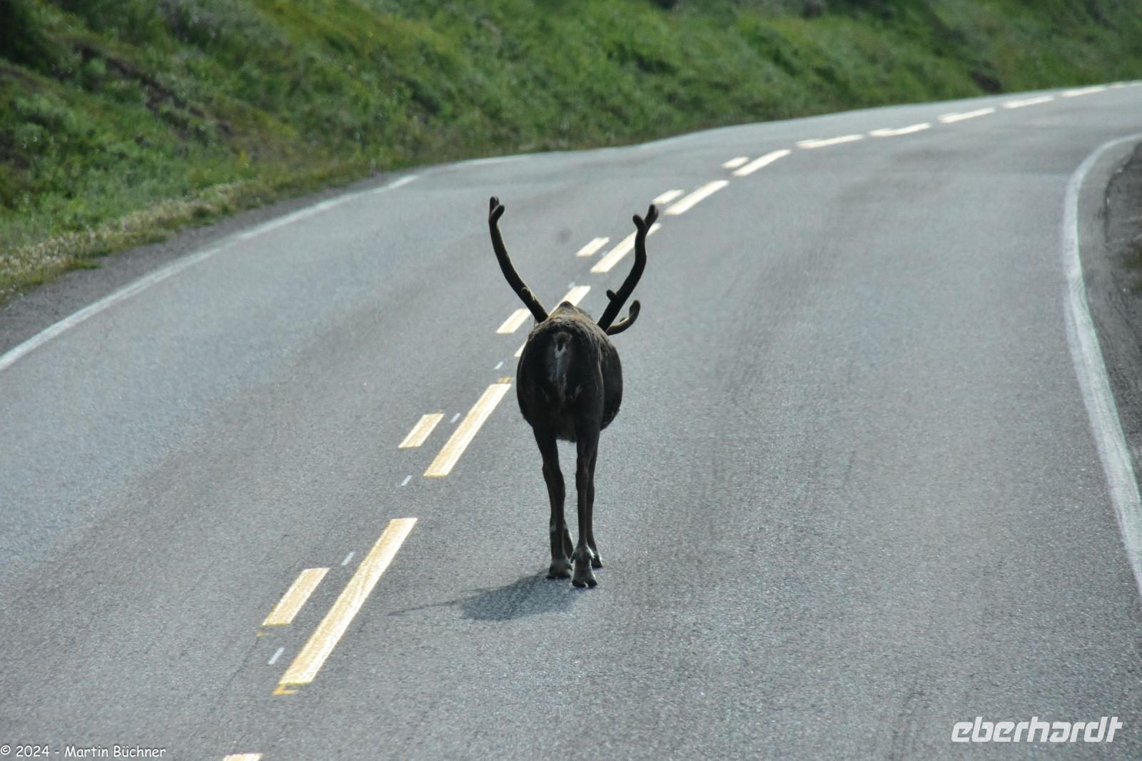 Zunächst folgen wir dem Oppdalen in Richtung Süden, über das Dovrefjell geht es in gut 1.000 Meter Höhe noch einmal durch eine Bergtundra. Ganz in der Nähe liegen die Snøhetta, mit über 2.200 Meter Höhe gehört er zu Norwegens höchsten Bergen. Bei tropischen Temperaturen und Menschenmengen verbergen sich leider die Moschusochsen, dafür bekommen wir Elche zu sehen. Erst zwei, dann gleich nochmal fünf (!) nebeneinander!