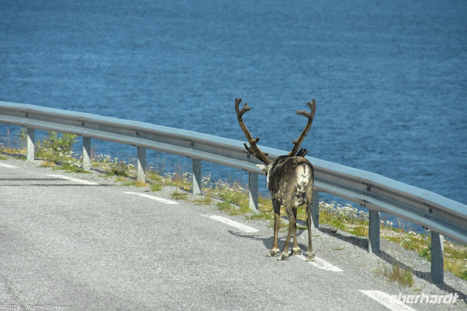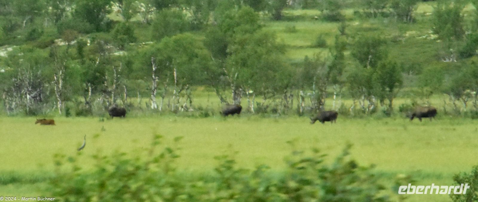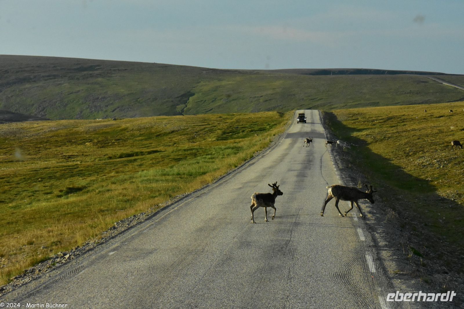 Zunächst folgen wir dem Oppdalen in Richtung Süden, über das Dovrefjell geht es in gut 1.000 Meter Höhe noch einmal durch eine Bergtundra. Ganz in der Nähe liegen die Snøhetta, mit über 2.200 Meter Höhe gehört er zu Norwegens höchsten Bergen. Bei tropischen Temperaturen und Menschenmengen verbergen sich leider die Moschusochsen, dafür bekommen wir Elche zu sehen. Erst zwei, dann gleich nochmal fünf (!) nebeneinander!