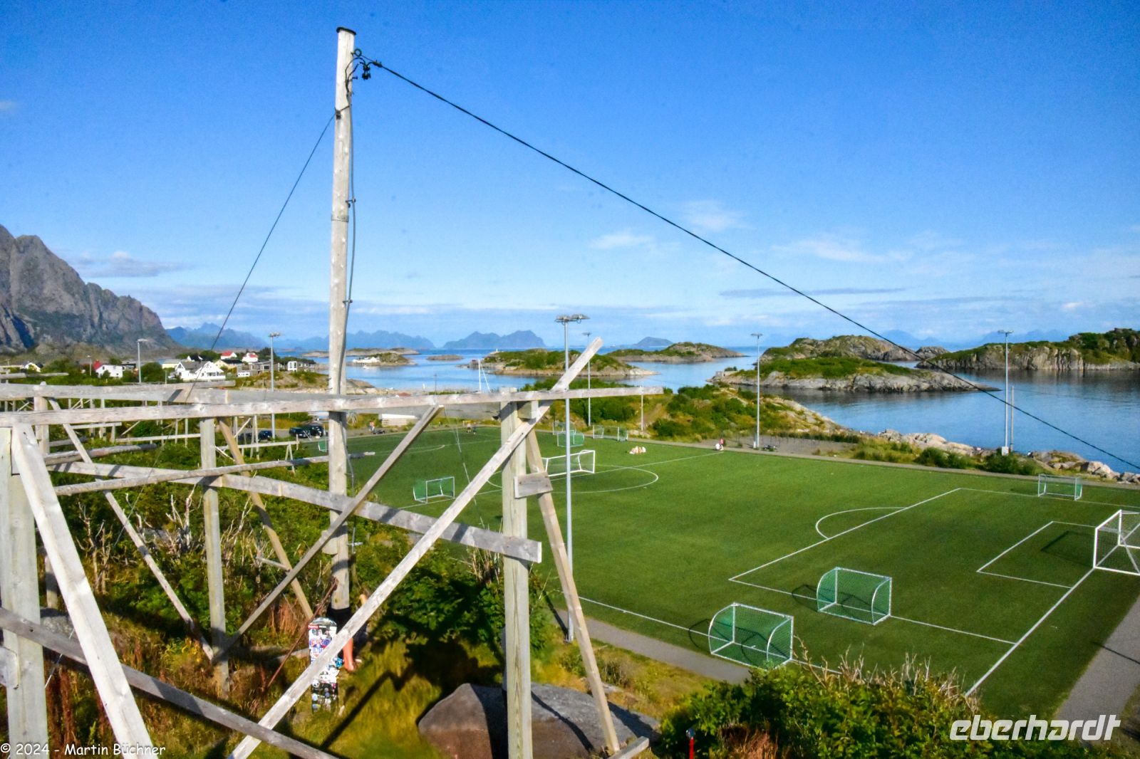 Später besuchen wir das Lofoten-Fischerdorf Henningsvær. Bei einem Spaziergang entdecken wir den malerischen Ort mit seinen typischen Rorbuer-Hütten, seinen Stockfisch-Trockengestellen und den legendären Fussballplatz im Ozean.