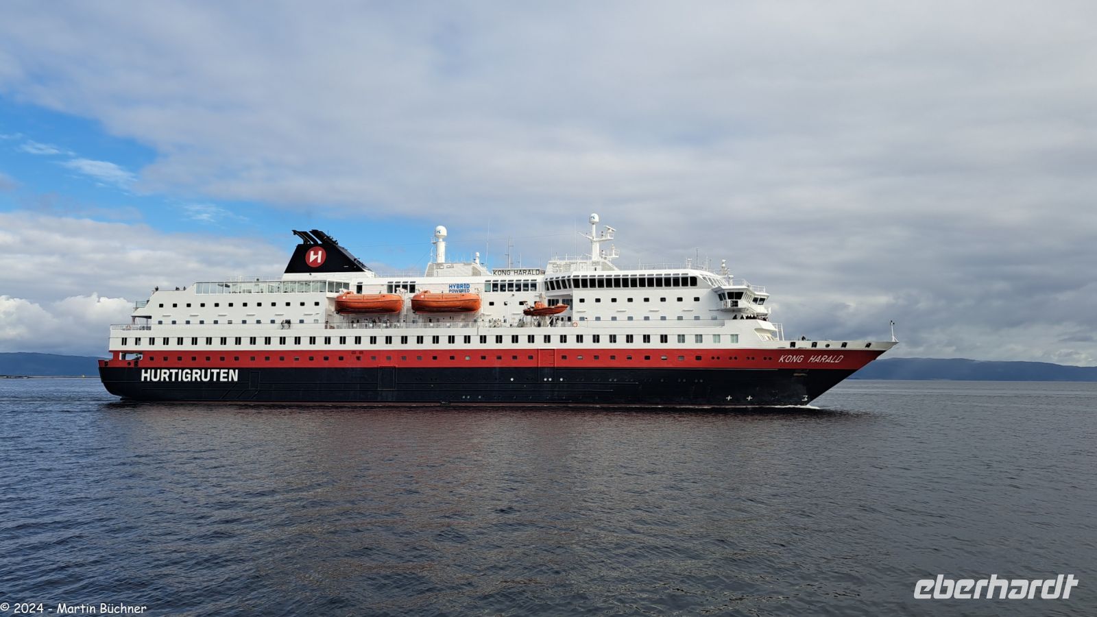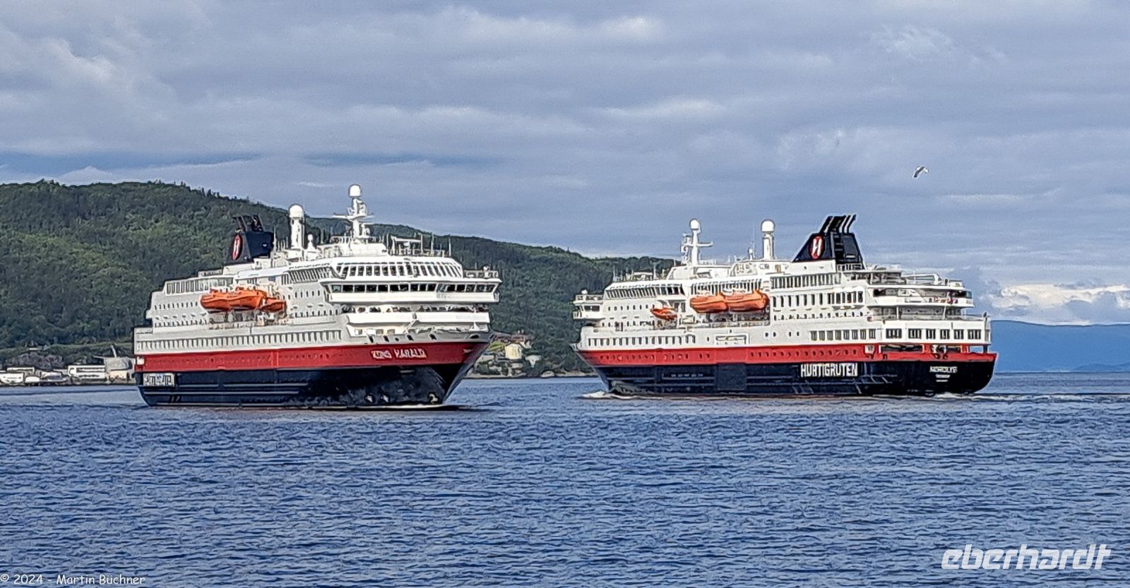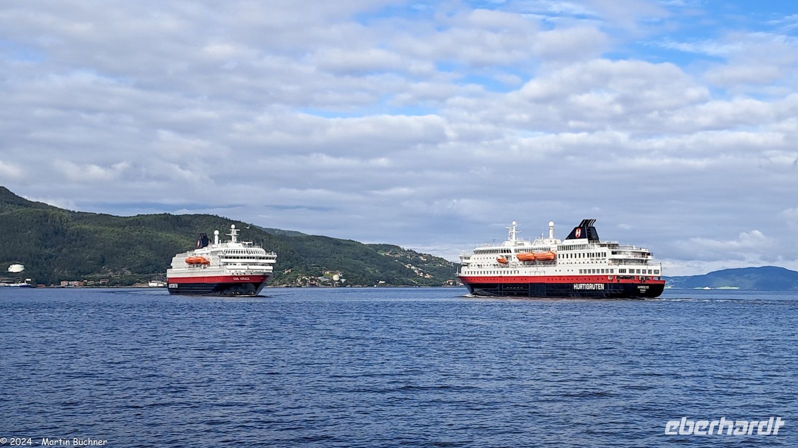 Am Morgen treffen sich planmäßig die beiden Hurtigrutenschiffe M/S Kong Harald und M/S Nordlys unweit unseres Hotels unmittelbar vor unseren Augen auf See. Folglich können wir das imposante Grußritual beider Schiffe erleben.
