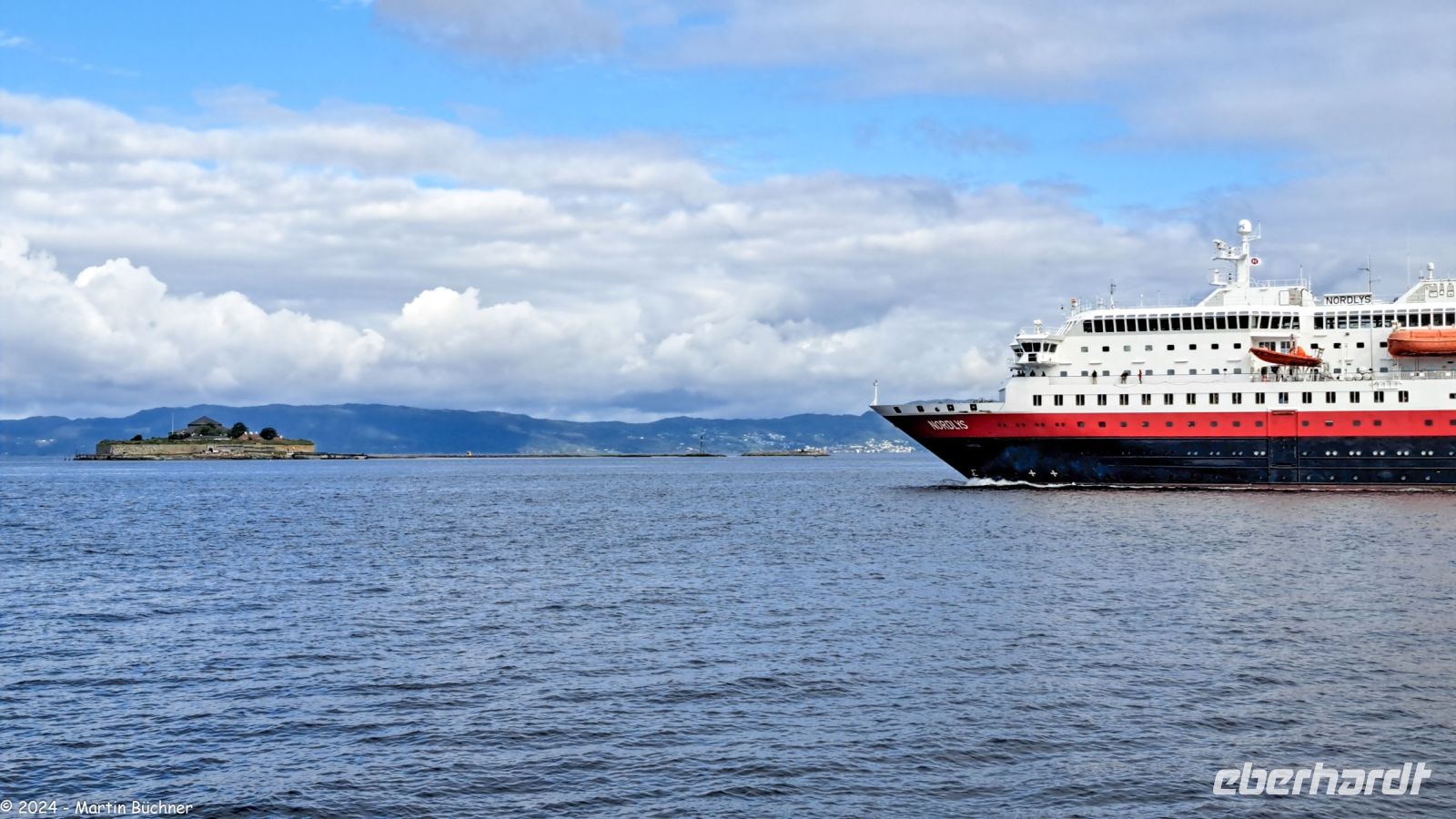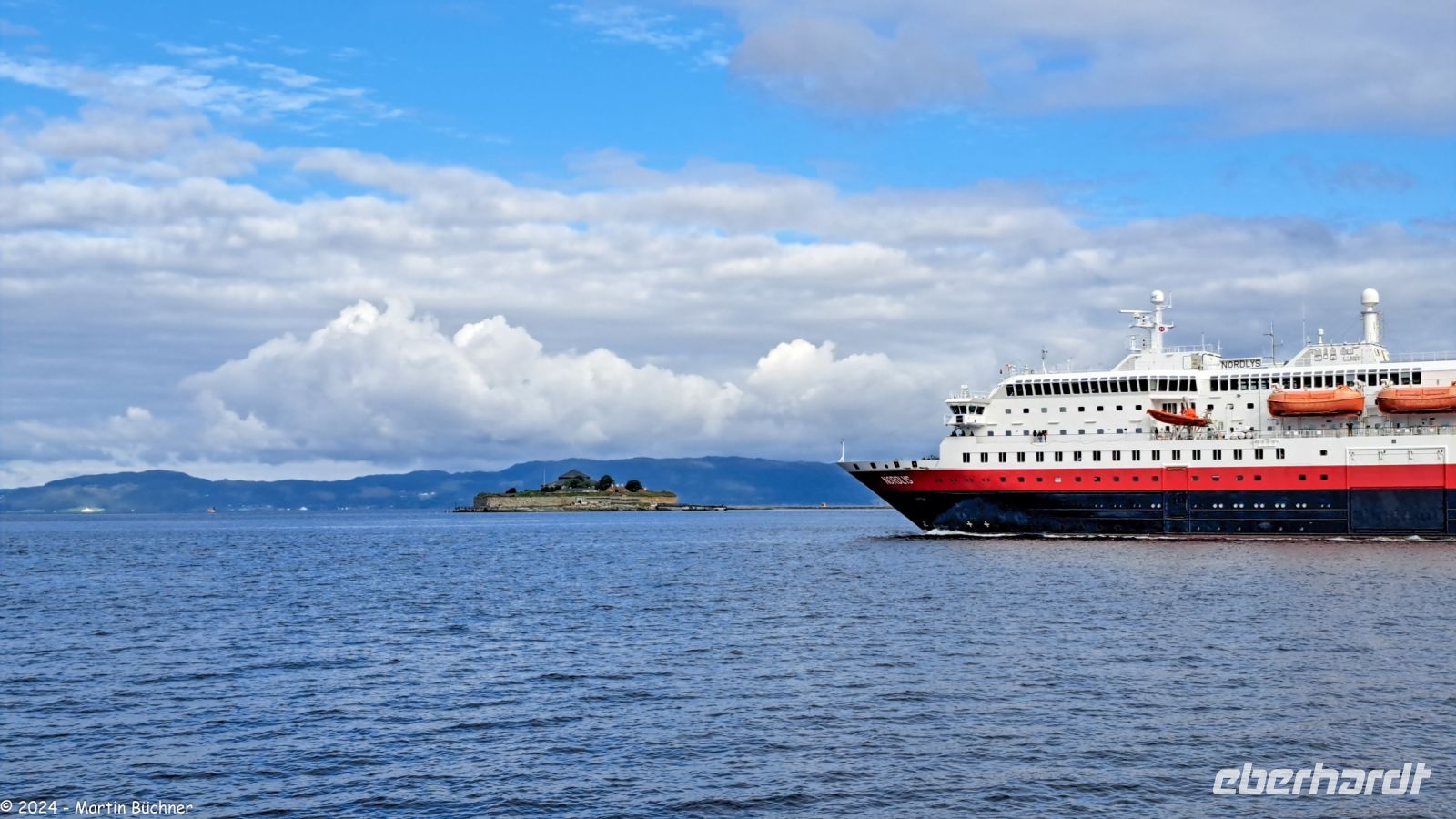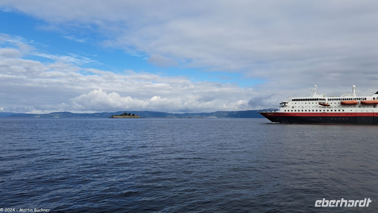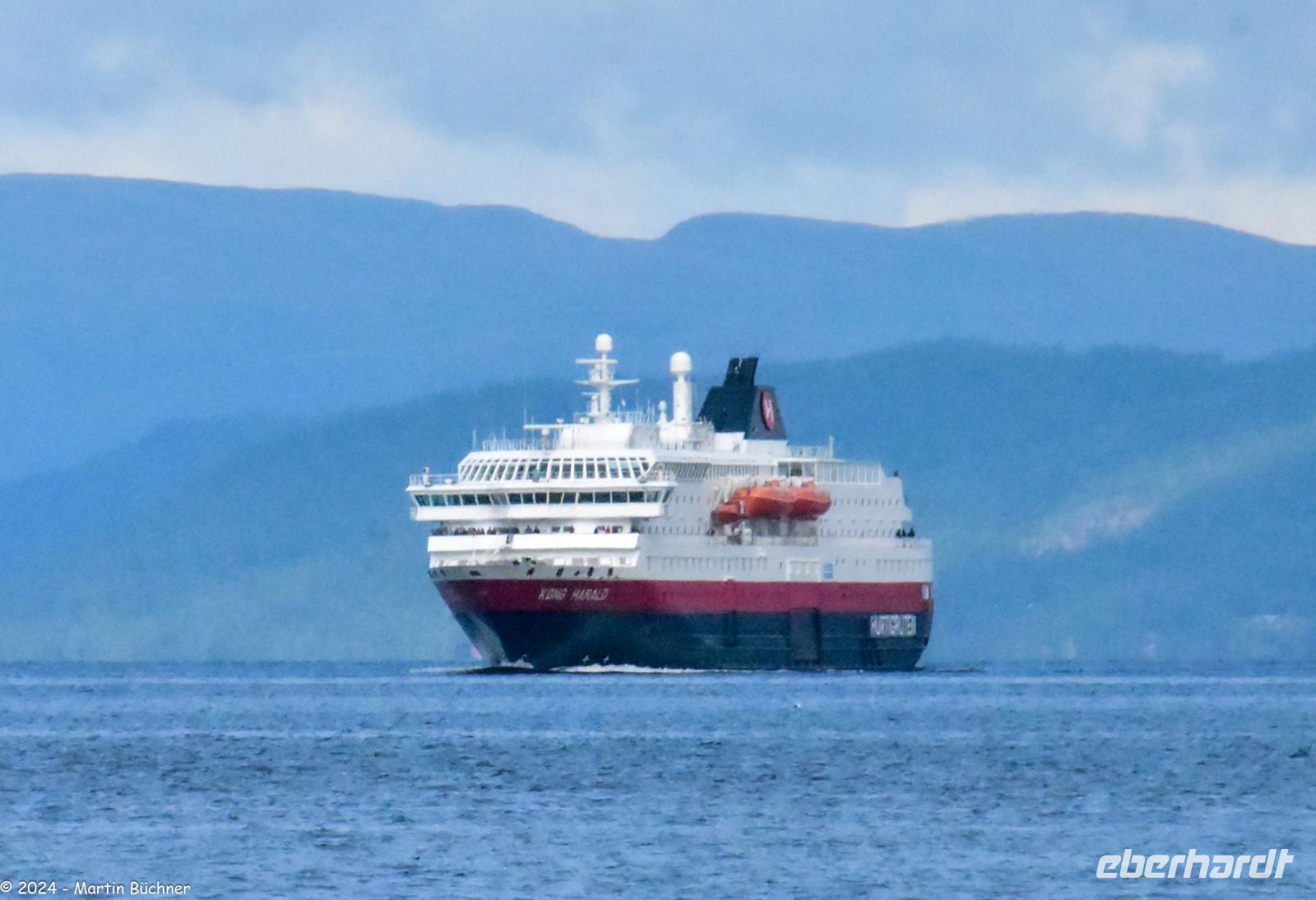 Am Morgen treffen sich planmäßig die beiden Hurtigrutenschiffe M/S Kong Harald und M/S Nordlys unweit unseres Hotels unmittelbar vor unseren Augen auf See. Folglich können wir das imposante Grußritual beider Schiffe erleben.