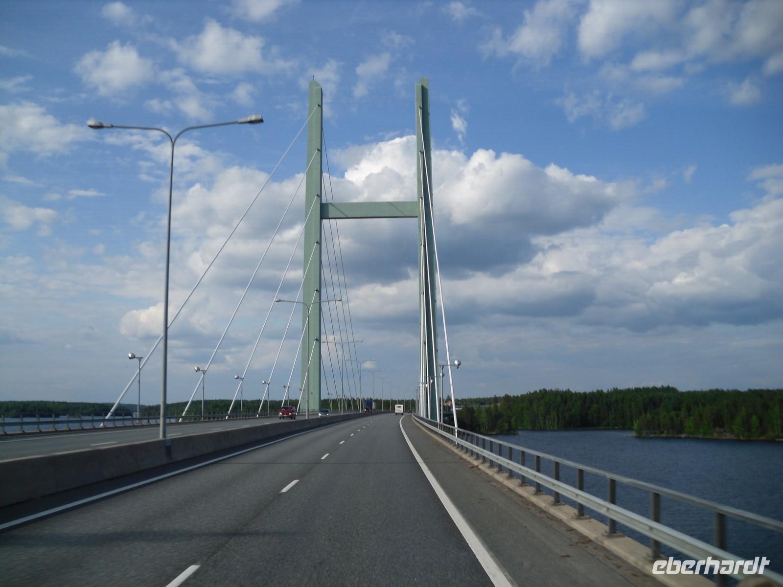 9 Uhr legen wir in Göteborg an und die Fahrt aus der Stadt führt uns erst einmal über die Hängebrücke zum Tunnel über Boras, Jönköping, entlang des Vätternsees nach Gränna. Hier