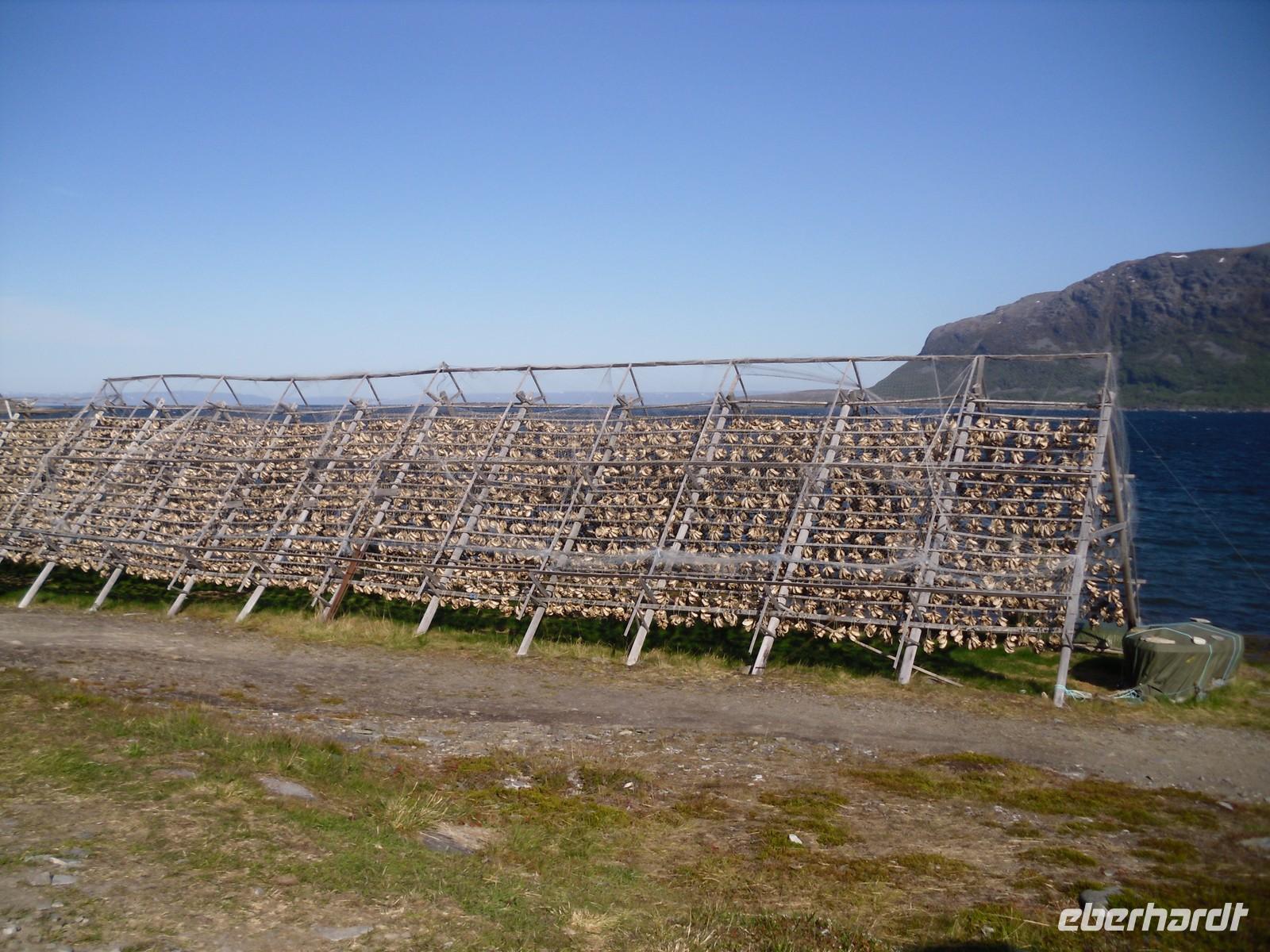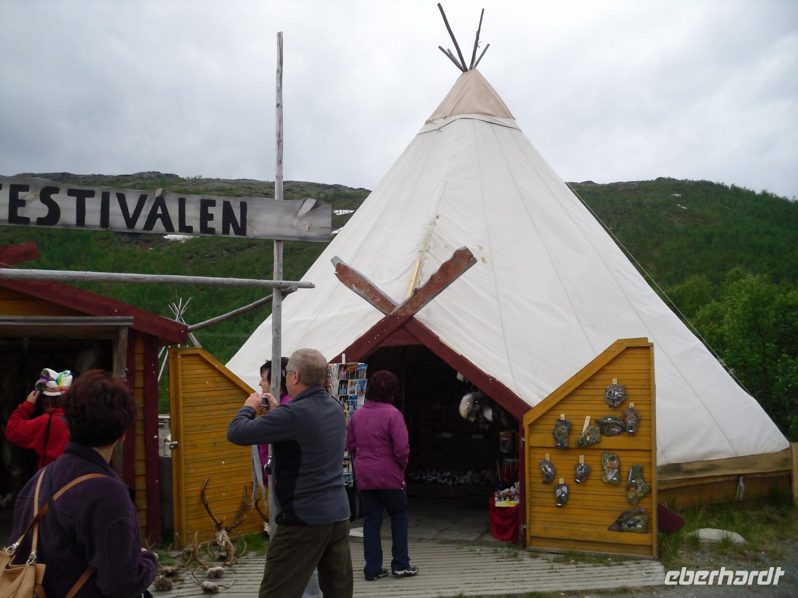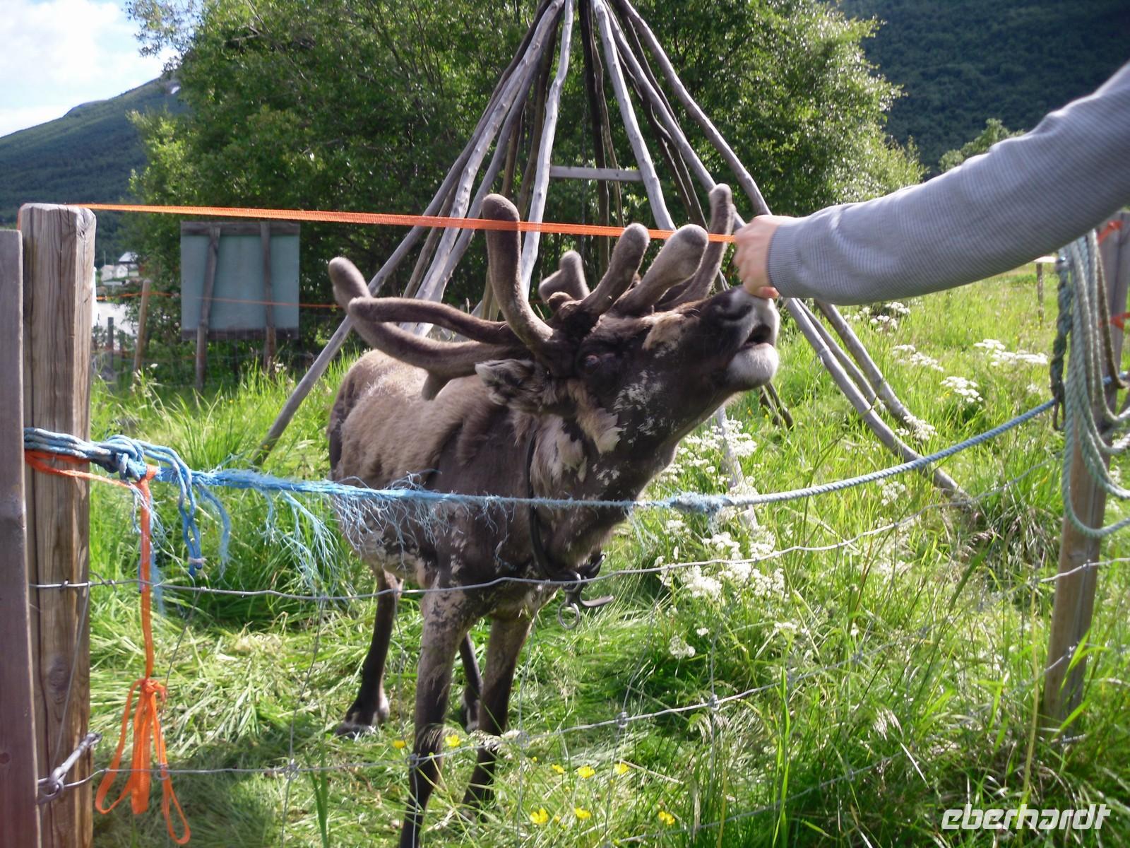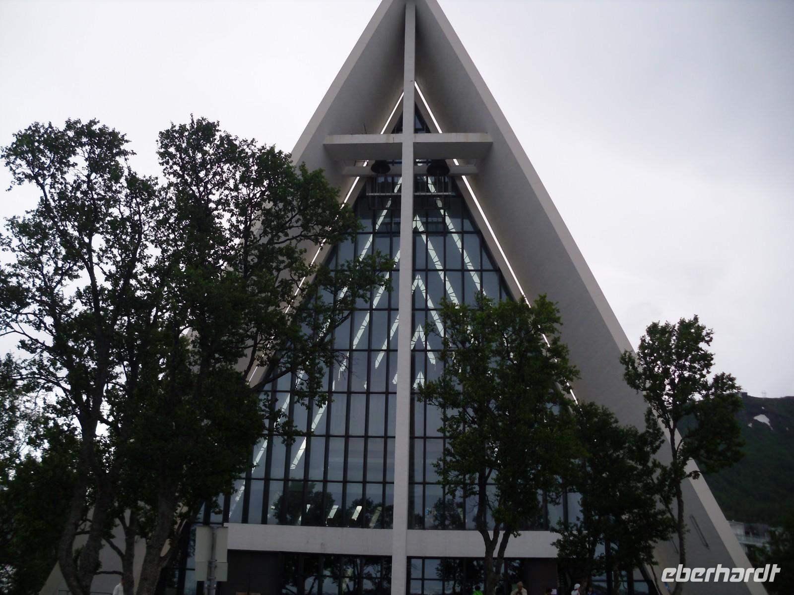 Heute Morgen besichtigen wir die fantastische Eismeerkathedrale, ihr Bau erinnert an die mächtigen Trockenfischgestelle in Nordnorwegen. Wir setzen unsere Fahrt heute im Regen fort, auch haben wir es etwas kälter als die letzten Tage. So kommt uns ein nächster Stopp bei den Samen an der E6 ganz recht. Im großen Zelt lodert ein wärmendes Feuer, auch die Rentiersuppe übern Feuer können wir kosten. Es wird fleißig Fotografiert und eingekauft, es gibt Rentiersalami. Über die Tjeldsundbrücke fahren wir hinein nach Harstad, immer noch bei Regen. Zur Halbinsel Trondenes führt uns der Weg, hier besichtigen wir die alte Steinkirche mit der noch im Original erhaltenen Eingangstür mit eingelassener Elle. Wegen der bevorstehenden Mitsommernacht findet hier zu später Stunde noch ein Konzert statt und dafür wird schon mal kräftig an der Orgel