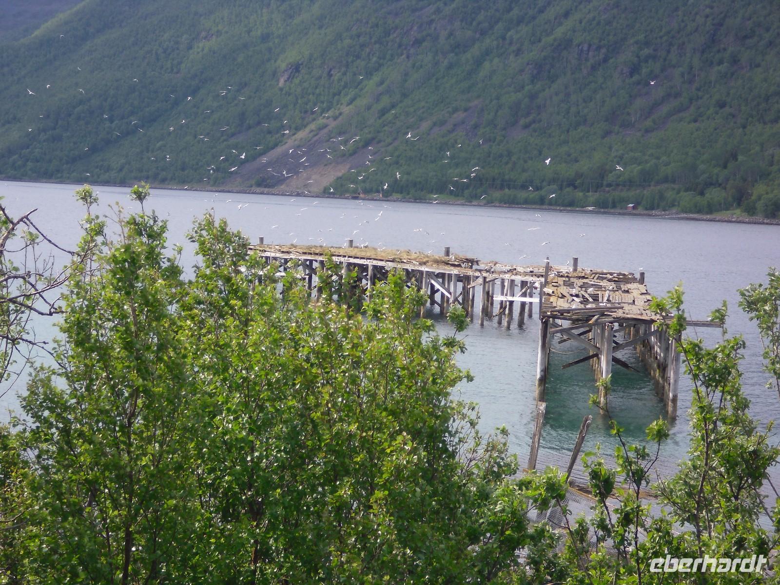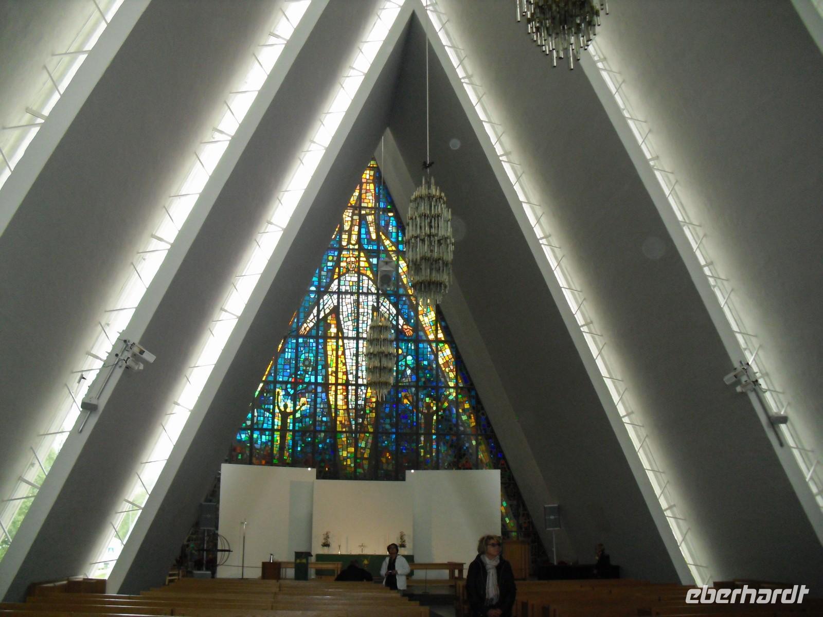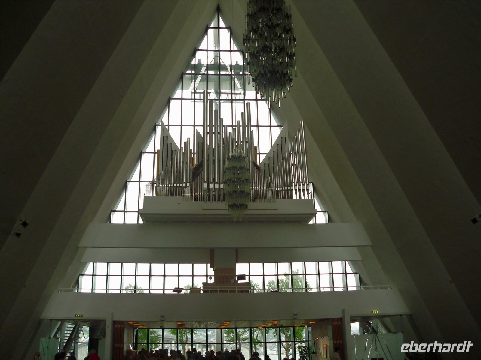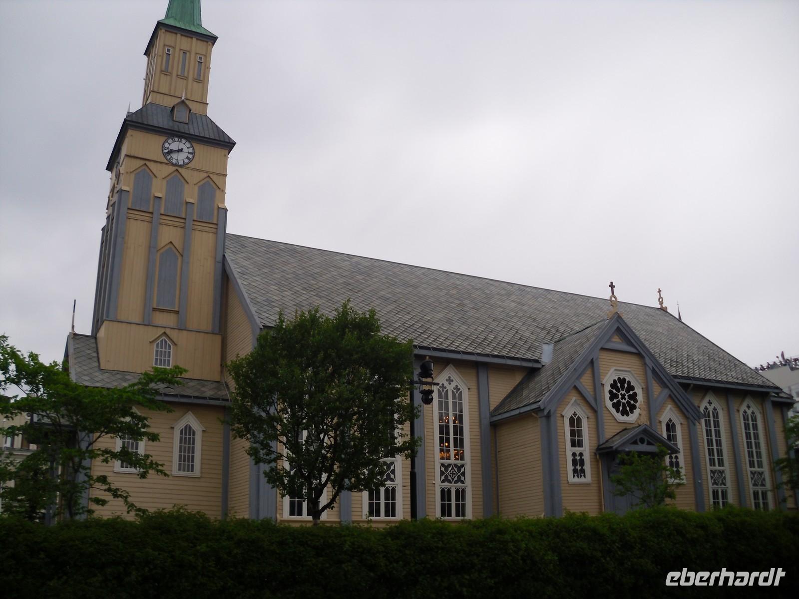 Heute Morgen besichtigen wir die fantastische Eismeerkathedrale, ihr Bau erinnert an die mächtigen Trockenfischgestelle in Nordnorwegen. Wir setzen unsere Fahrt heute im Regen fort, auch haben wir es etwas kälter als die letzten Tage. So kommt uns ein nächster Stopp bei den Samen an der E6 ganz recht. Im großen Zelt lodert ein wärmendes Feuer, auch die Rentiersuppe übern Feuer können wir kosten. Es wird fleißig Fotografiert und eingekauft, es gibt Rentiersalami. Über die Tjeldsundbrücke fahren wir hinein nach Harstad, immer noch bei Regen. Zur Halbinsel Trondenes führt uns der Weg, hier besichtigen wir die alte Steinkirche mit der noch im Original erhaltenen Eingangstür mit eingelassener Elle. Wegen der bevorstehenden Mitsommernacht findet hier zu später Stunde noch ein Konzert statt und dafür wird schon mal kräftig an der Orgel