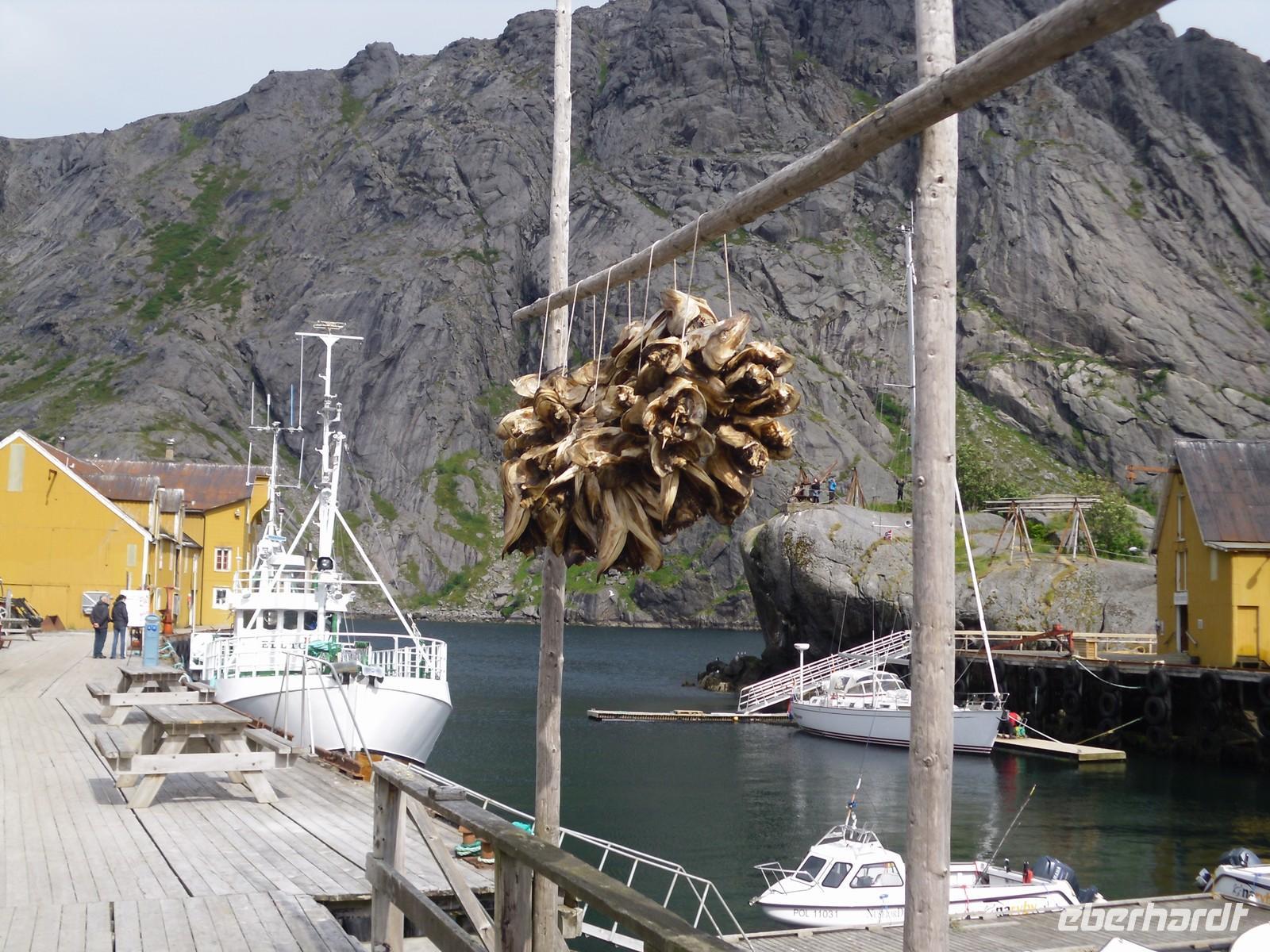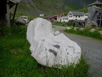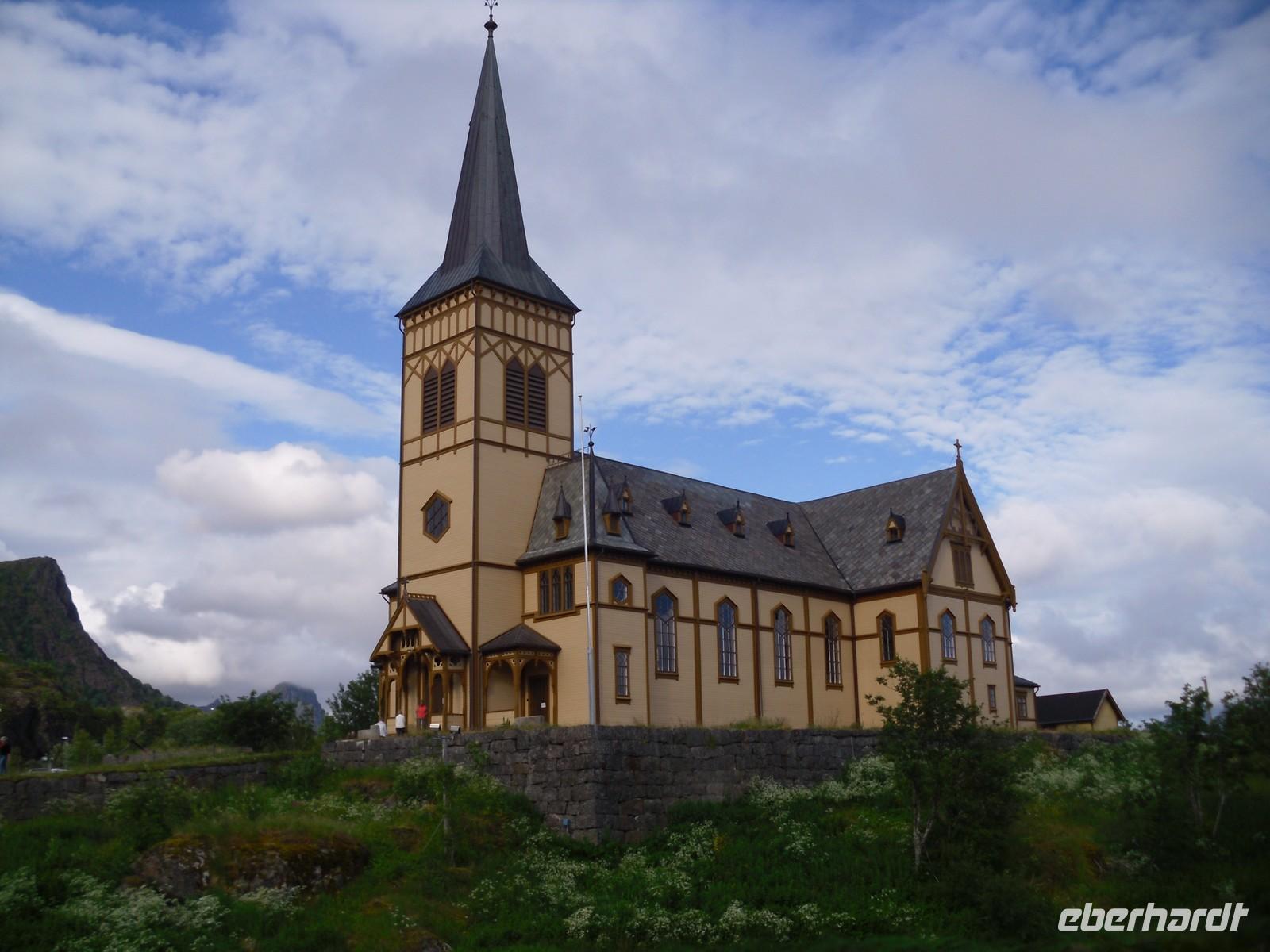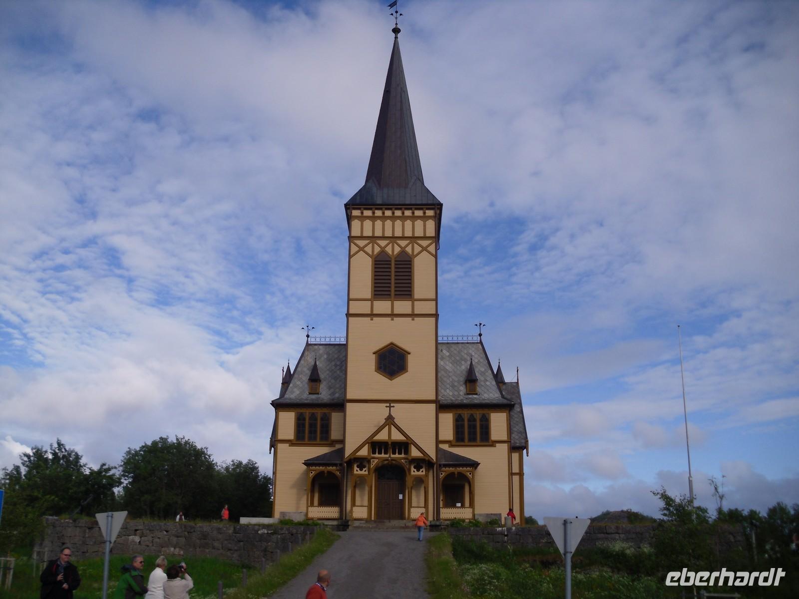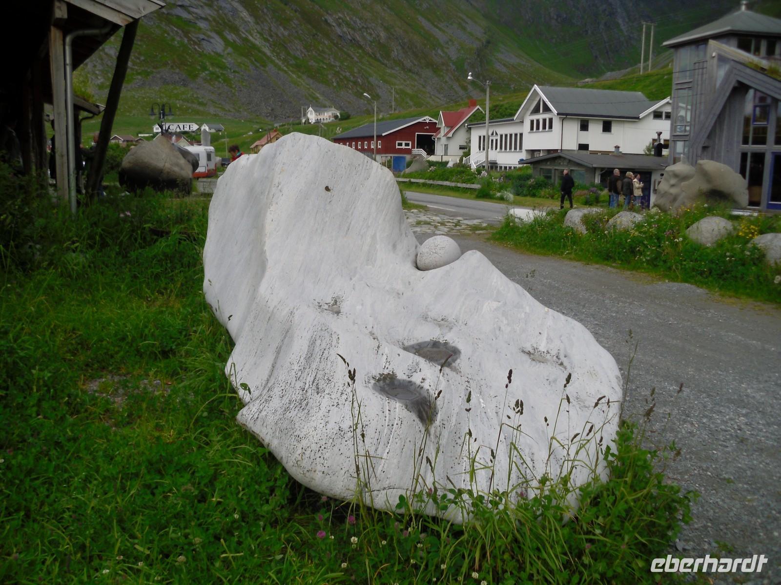 Der Besuch von Nußfjord mit einem Rundgang ohne Regen und einigen Sonnenstrahlen, die Filmvorführung zur Lofotfischerei und das Picknick, das alles erleben wir am Nachmittag. Ein kurzer Stopp führt uns noch nach Vikten, ein hübscher Ort mit herrlichen rundgeschliffenen Steinen und Glas-und Keramikwerkstätten. Auf unserer Rückfahrt sehen wir noch die Lofot Kathedrale in Kabelvag, sie wird fotografiert, ja rein schauen können wir nicht, es ist geschlossen.