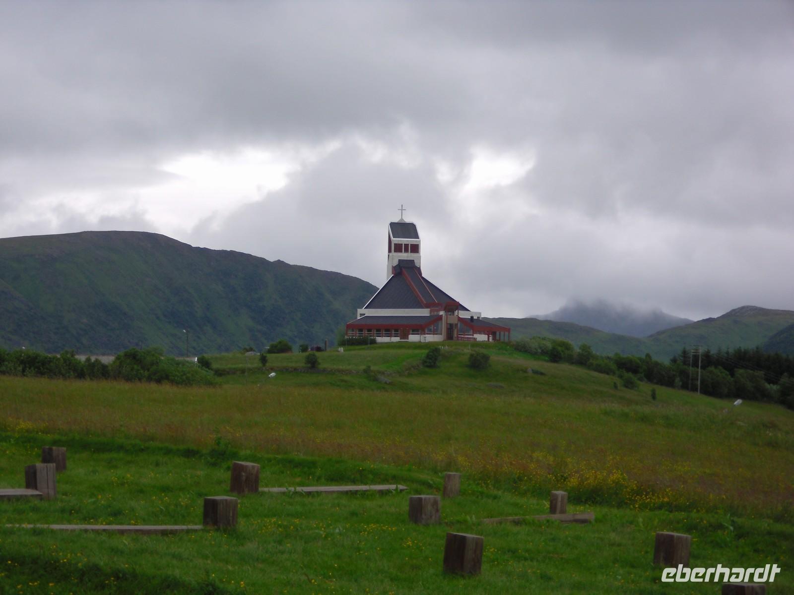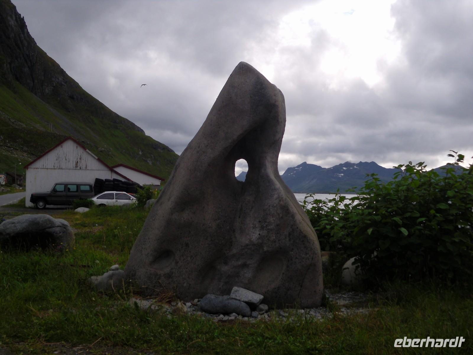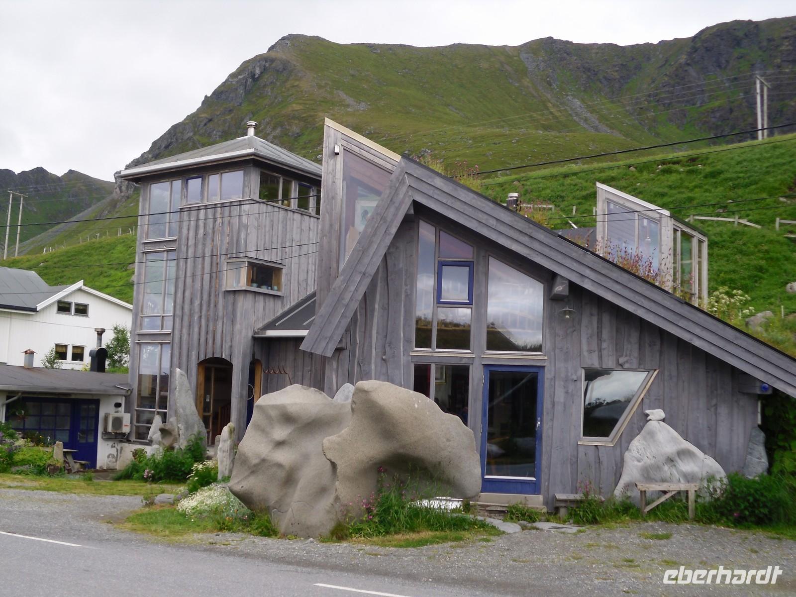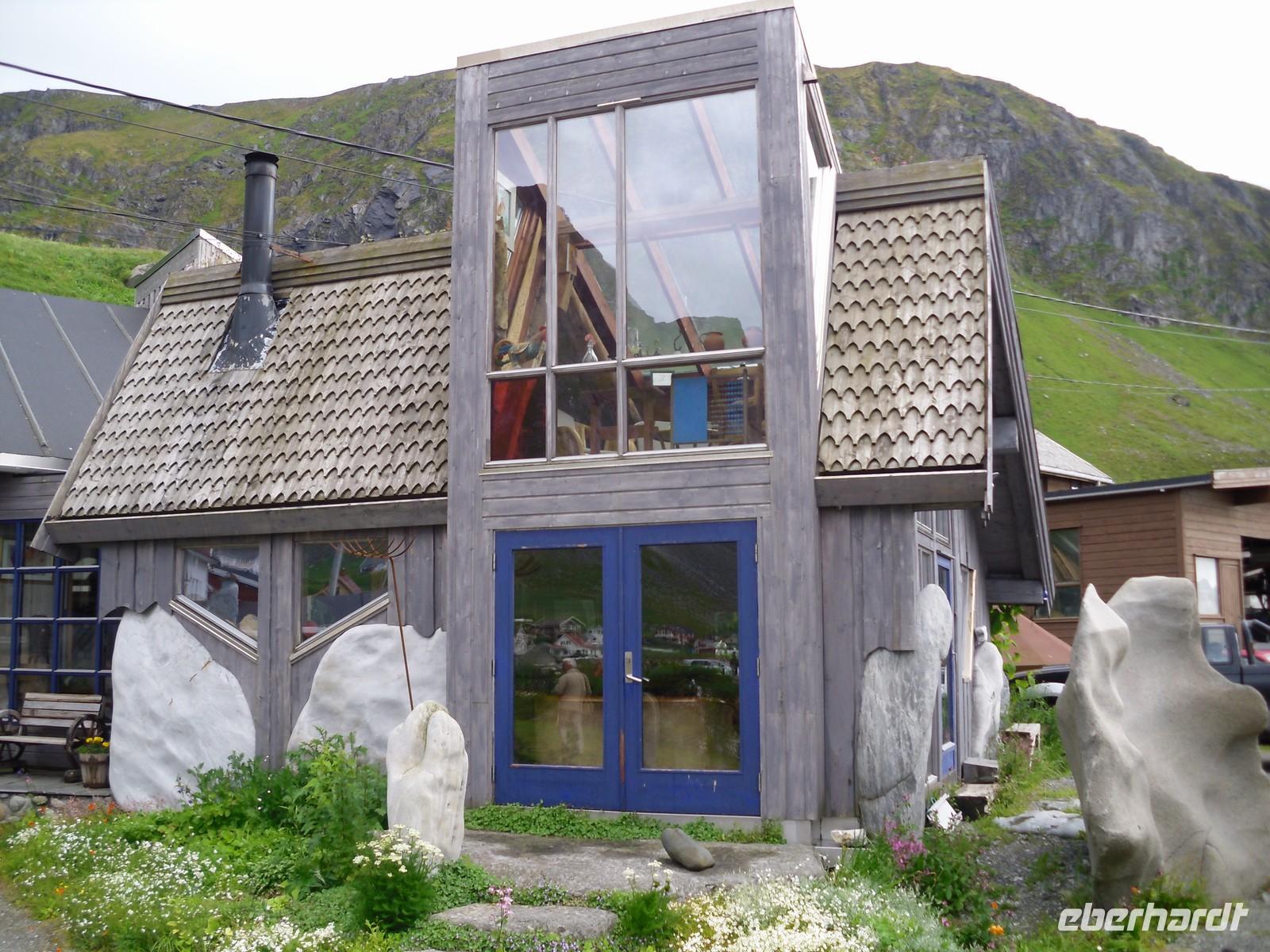 Der Besuch von Nußfjord mit einem Rundgang ohne Regen und einigen Sonnenstrahlen, die Filmvorführung zur Lofotfischerei und das Picknick, das alles erleben wir am Nachmittag. Ein kurzer Stopp führt uns noch nach Vikten, ein hübscher Ort mit herrlichen rundgeschliffenen Steinen und Glas-und Keramikwerkstätten. Auf unserer Rückfahrt sehen wir noch die Lofot Kathedrale in Kabelvag, sie wird fotografiert, ja rein schauen können wir nicht, es ist geschlossen.