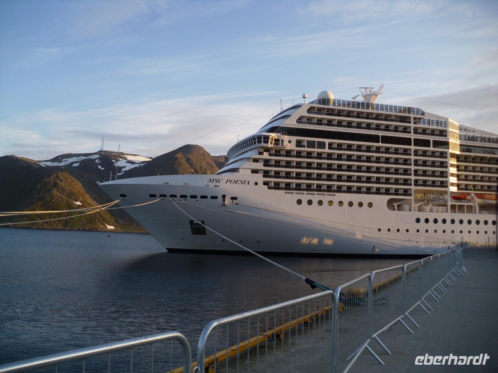 Durch den Nordkaptunnel gelangen wir auf die Insel Mageroya und übernachten heute in Honningsvag im Rica Hotel. Hier liegt das große Kreuzfahrtschiff MSC Poesia im Hafen.