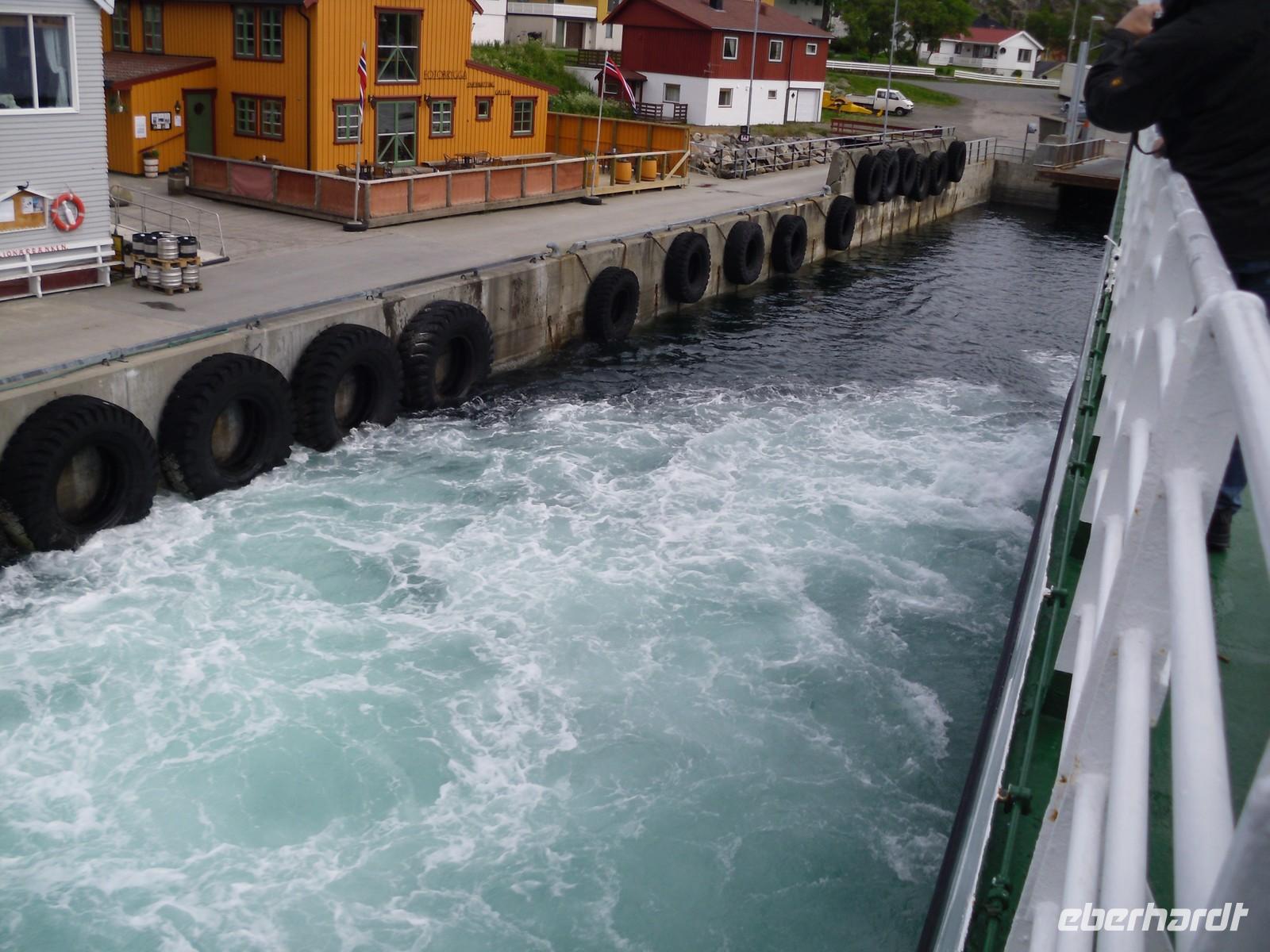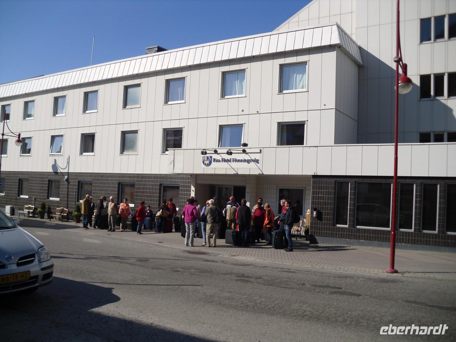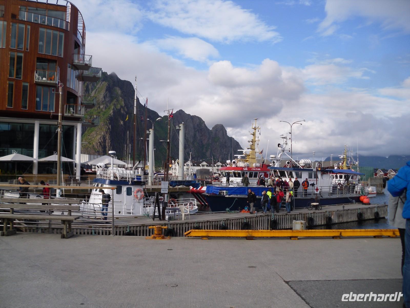 Wendemanöver des Schiffes im Trollfjorden oben draußen auf Deck. In Svolvär werden wir schon von Rene und Thomas, unseren zuverlässigen Bus Chauffeuren, erwartet. Da das Thon Hotel unmittelbar neben dem Fährhafen ist, können wir gleich zu Fuß hinüber gehen. Bei strömenden Regen macht der ein oder andere Gast noch einen kurzen Erkundungsgang durch die Stadt.