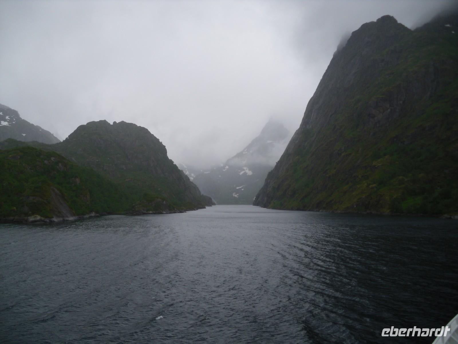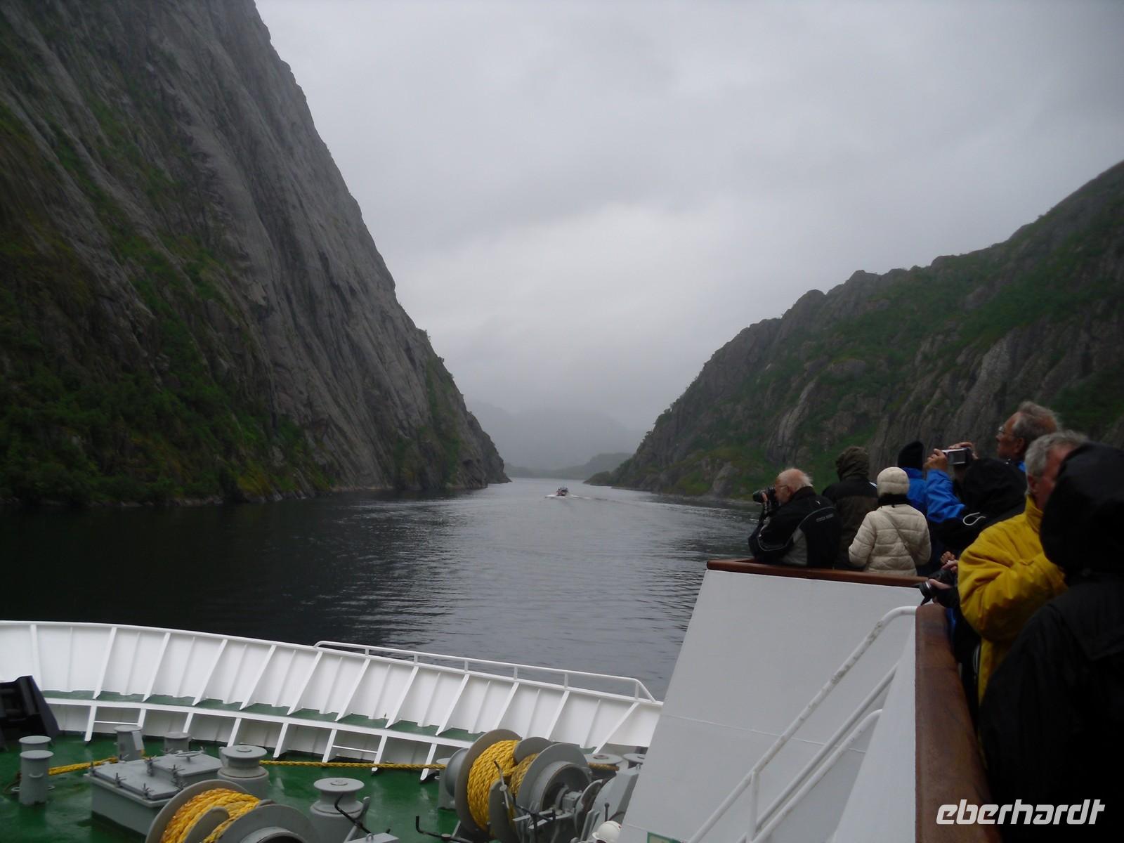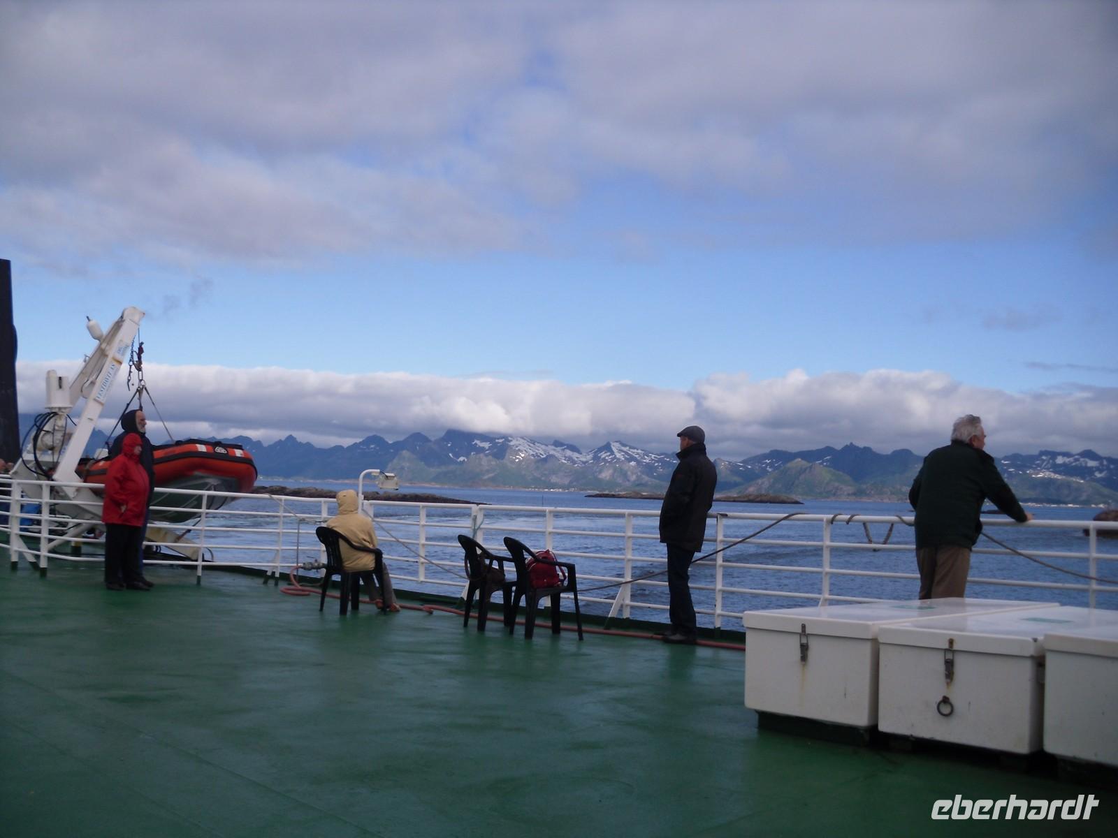 Unser Bus bringt alle Gäste zum Fährhafen nach Risöyhamn, denn ab hier beginnt für uns heute die Schönste Seereise der Welt- wir gehen mit einem Schiff der Hurtigrute bis nach Svolvär. Auch während der Seereise müssen wir immer wieder mit Wind und Regenschauern kämpfen. Aber wir sind gut gerüstet und so erleben wir auch die Fahrt durch den Raftsundet und das
