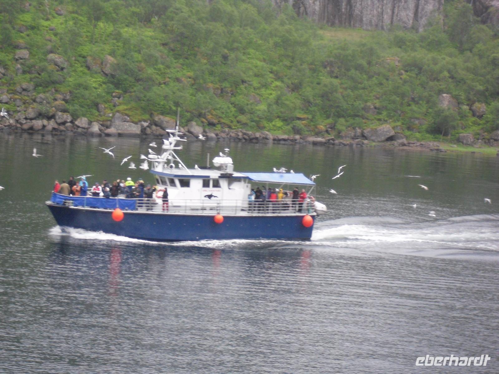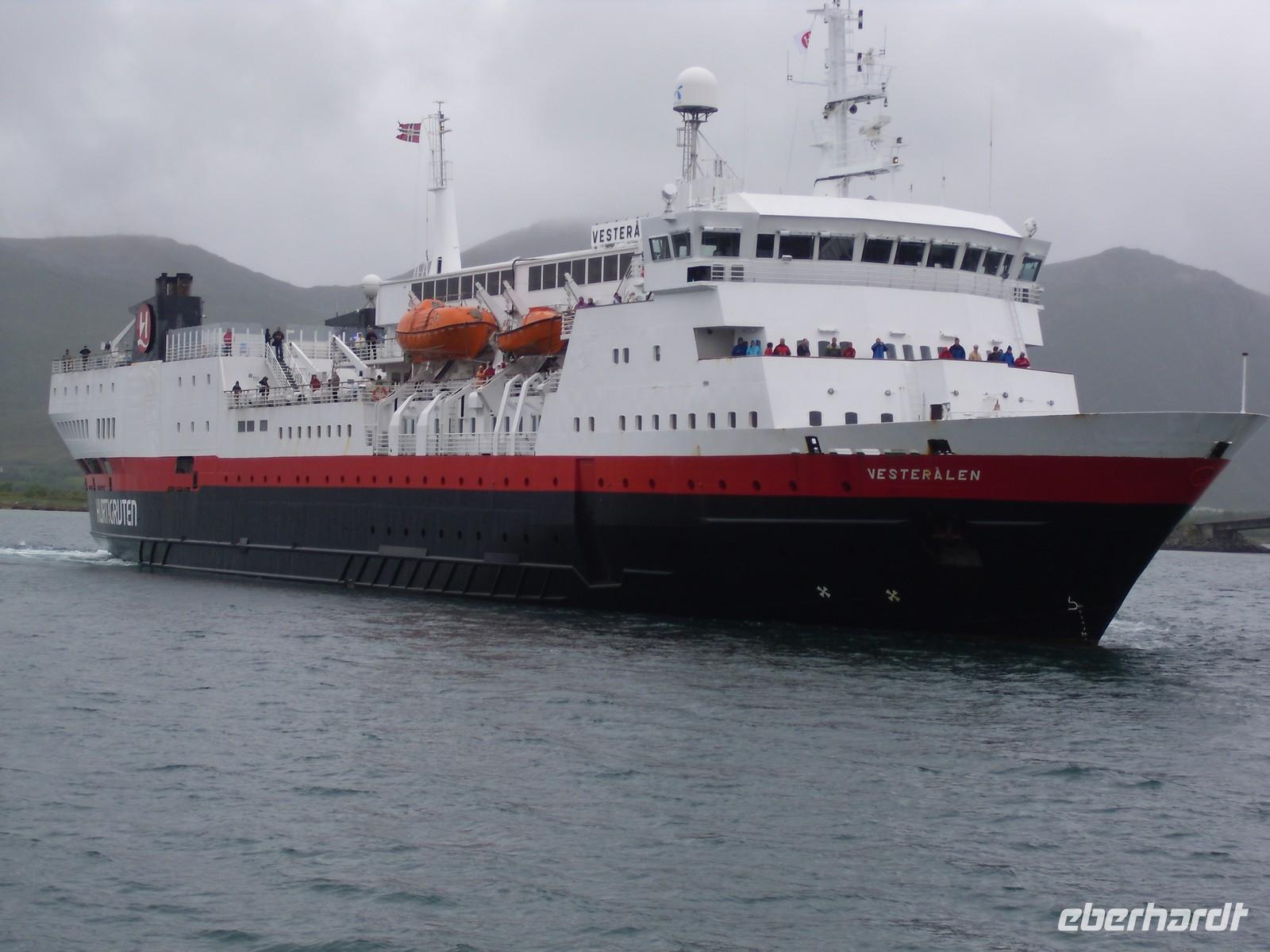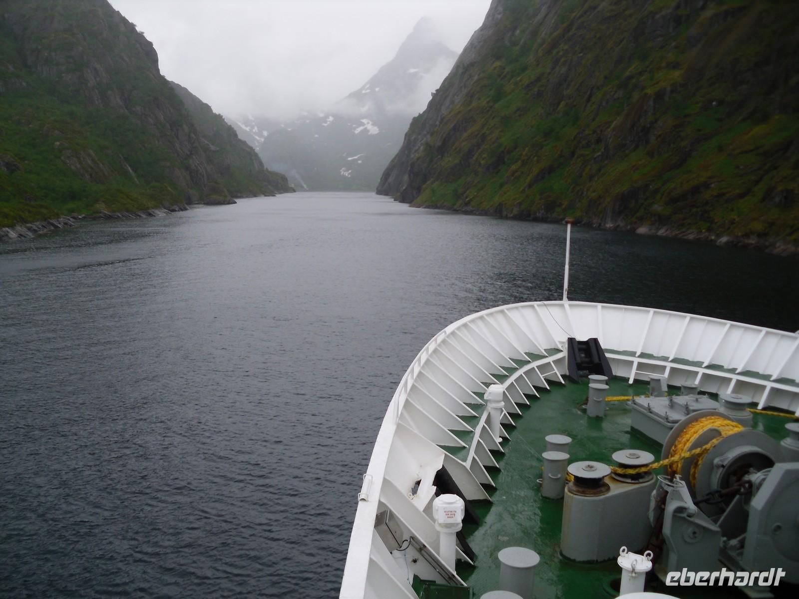 Unser Bus bringt alle Gäste zum Fährhafen nach Risöyhamn, denn ab hier beginnt für uns heute die Schönste Seereise der Welt- wir gehen mit einem Schiff der Hurtigrute bis nach Svolvär. Auch während der Seereise müssen wir immer wieder mit Wind und Regenschauern kämpfen. Aber wir sind gut gerüstet und so erleben wir auch die Fahrt durch den Raftsundet und das