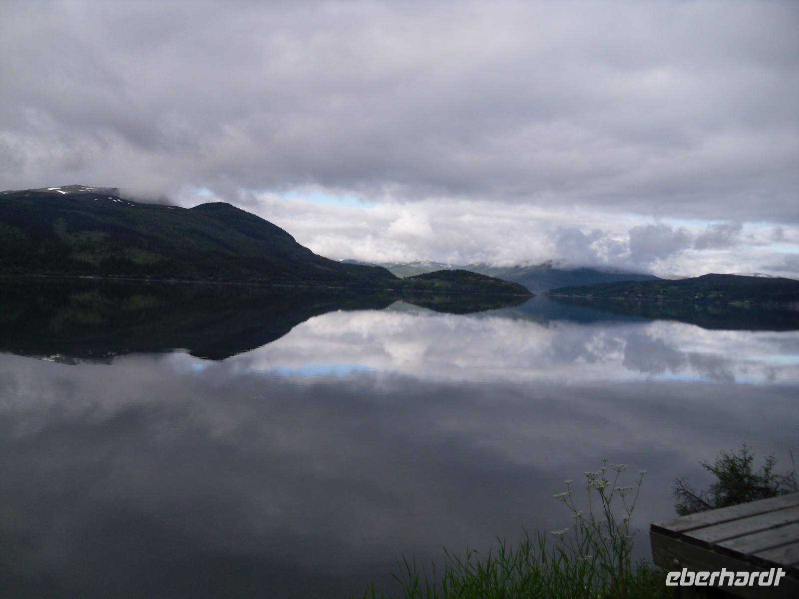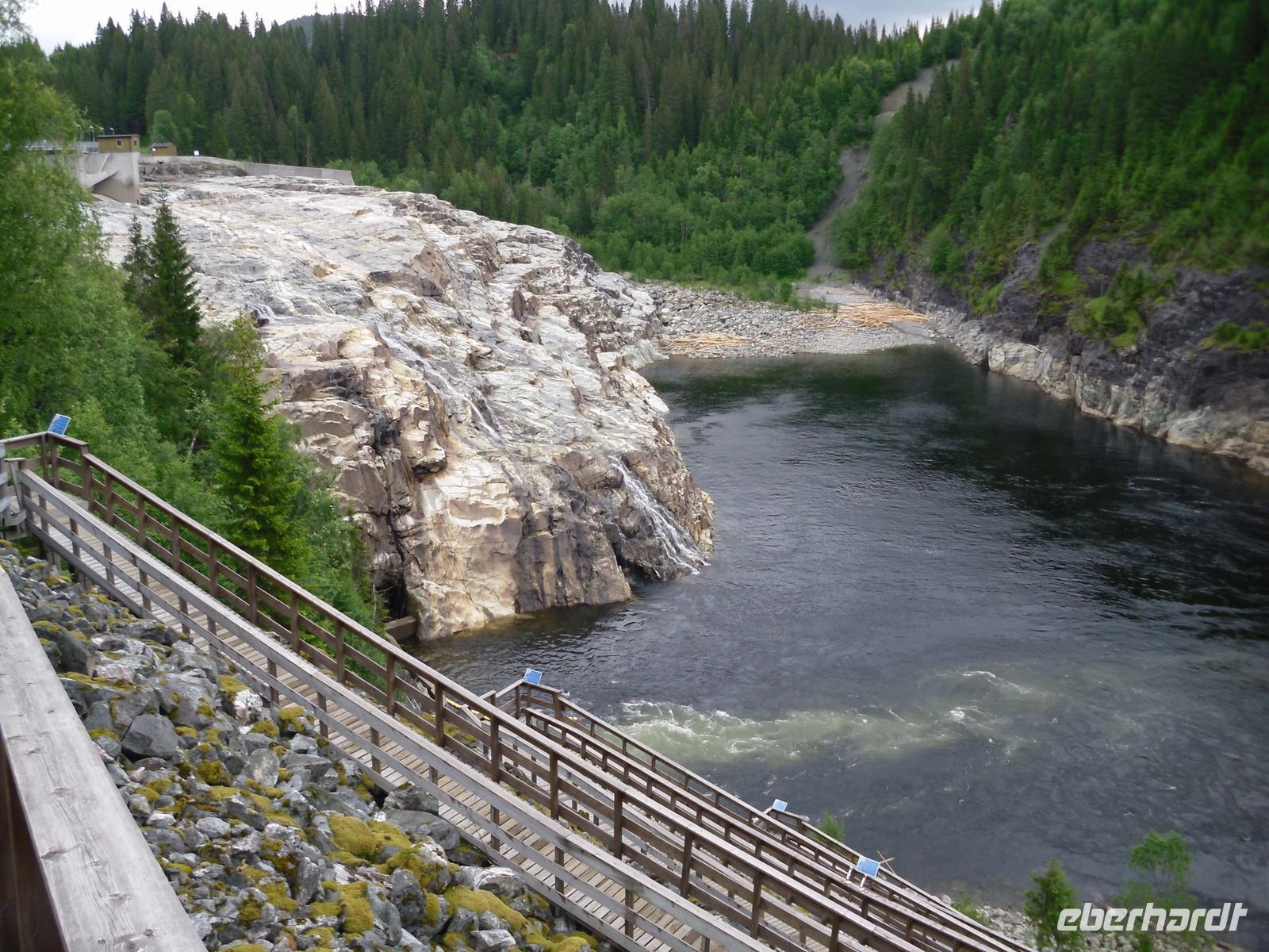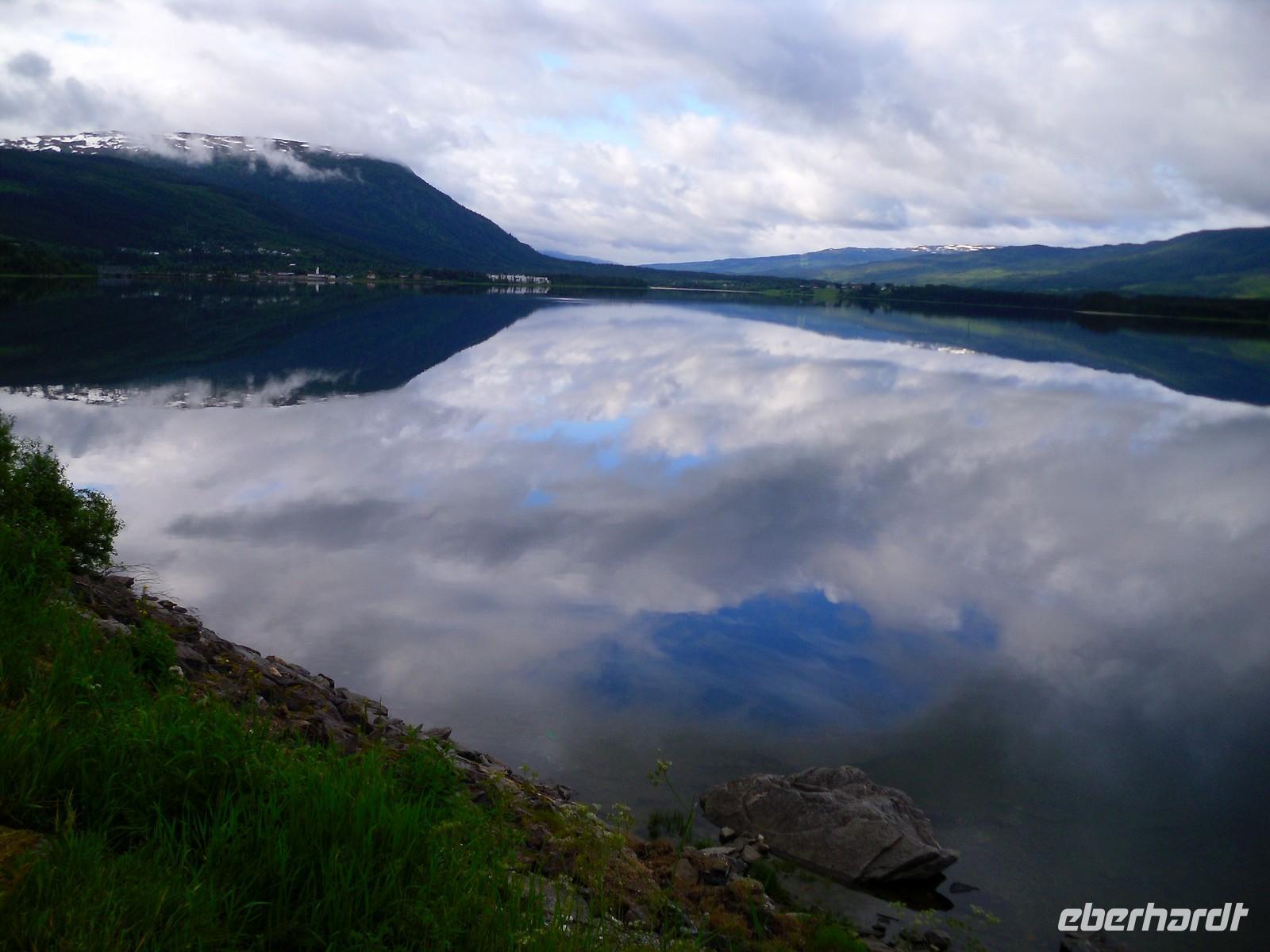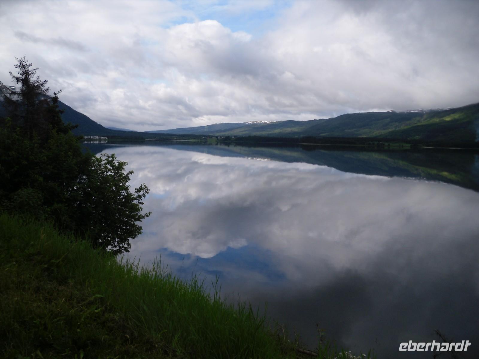 Nach einem guten Frühstück am Samstagmorgen, starten wir bei kühlem, aber trockenem Wetter in Richtung Süden. Eine tolle Spiegelung im Fjord, gerahmt von einer fantastischen Naturkulisse, wird bei einem kurzen Fotostopp aufs Bild gebannt. Unsere Gäste sind während dieser Rundreise ständig Schussbereit, es ist ein herrlicher Anblick. Am Wasserfall Laksfors gönnen wir uns die nächste Pause, natürlich zum Fotografieren, Tolletieren, Einkaufen und Kaffeetrinken. Das Wetter hält aus und so kommen wir trocken durch diese Pause. Unterwegs gibt es heute immer mal einen kurzen Schauer, aber im Bus stört es uns ja nicht. Endlich bekommen wir auf dieser Reise den König der Fische, den norwegischen Lachs, zu sehen.