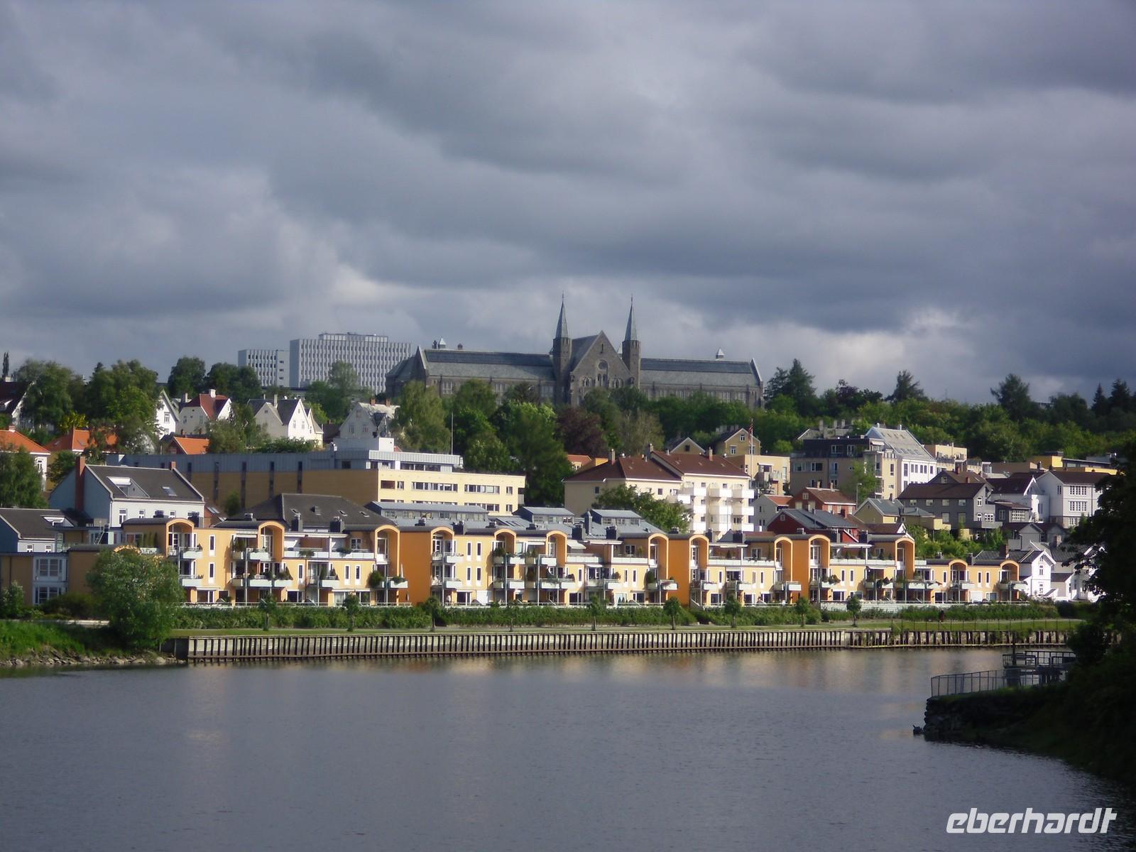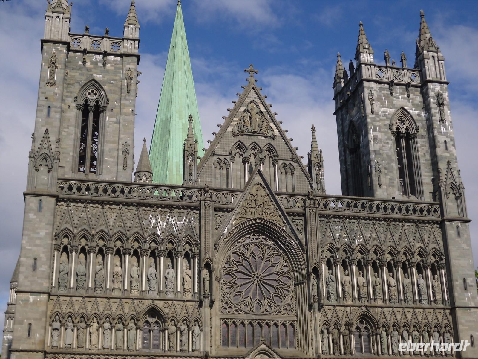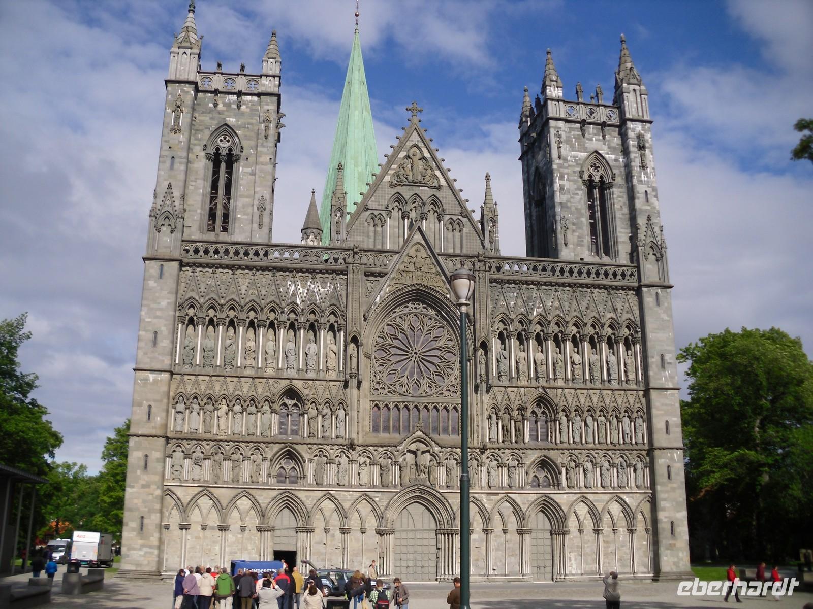In Namsen Laksakvarium besichtigen wir die Lachstreppe, schauen ins Lachsstudio hinein und am Ende gibt es noch einen Film und große Lachse im Akvarium zu sehen. Wir lassen uns die Fischsuppe und das Lachsbrötchen schmecken, danke unserem Reiseveranstalter Eberhardt, er hat den Eintritt heut für uns bezahlt. Vorbei an großen Seen, durch einige sehr lange Tunnel und schließlich entlang des Trondheimfjordes erreichen wir die Stadt am Fjord mit dem großartigen Nidarosdom. Unsere Reiseleiterin Susann Grundmann erwartet uns schon, sie ist eine