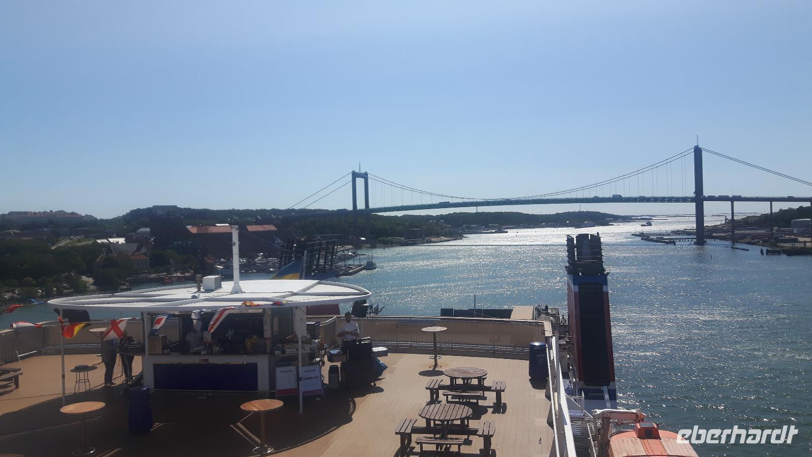 So langsam mussten wir an die Heimreise denken, zumindest an die erste Etappe... Zunächst hieß es Abschied nehmen von Norwegen, denn die südschwedische Hafenstadt Göteborg war unser heutiges Ziel. Da wir noch genügend Zeit hatten, unternahmen wir noch einen kleinen Abstecher in den Schärengarten nördlich von Göteborg - wir fuhren über die Inseln Orust und Tjörn, denn hier war man wahrlich mitten in der Wunderwelt der Schären! Beide Inseln sind miteinander verbunden und liegen etwa 60 Kilometer nördlich von Göteborg. Sie sind vom Festland aus über die imposante Tjörn-Brücke zu erreichen. Hier erlebten wir erneut eine idyllische Oase der Ruhe abseits der Großstädte - der gelungene Abschluss einer aufregenden Städtereise! In Göteborg erwartete uns dann bereits am Nachmittag die Fähre der „Stena Germanica", die pünktlich um 18.45 Uhr ablegte und die 437 Kilometer lange Seereise bis Kiel in Angriff nahm. Ein üppiges skandinavisches Schlemmerbuffet an Bord der Fähre rundete diesen letzten Abend ab.