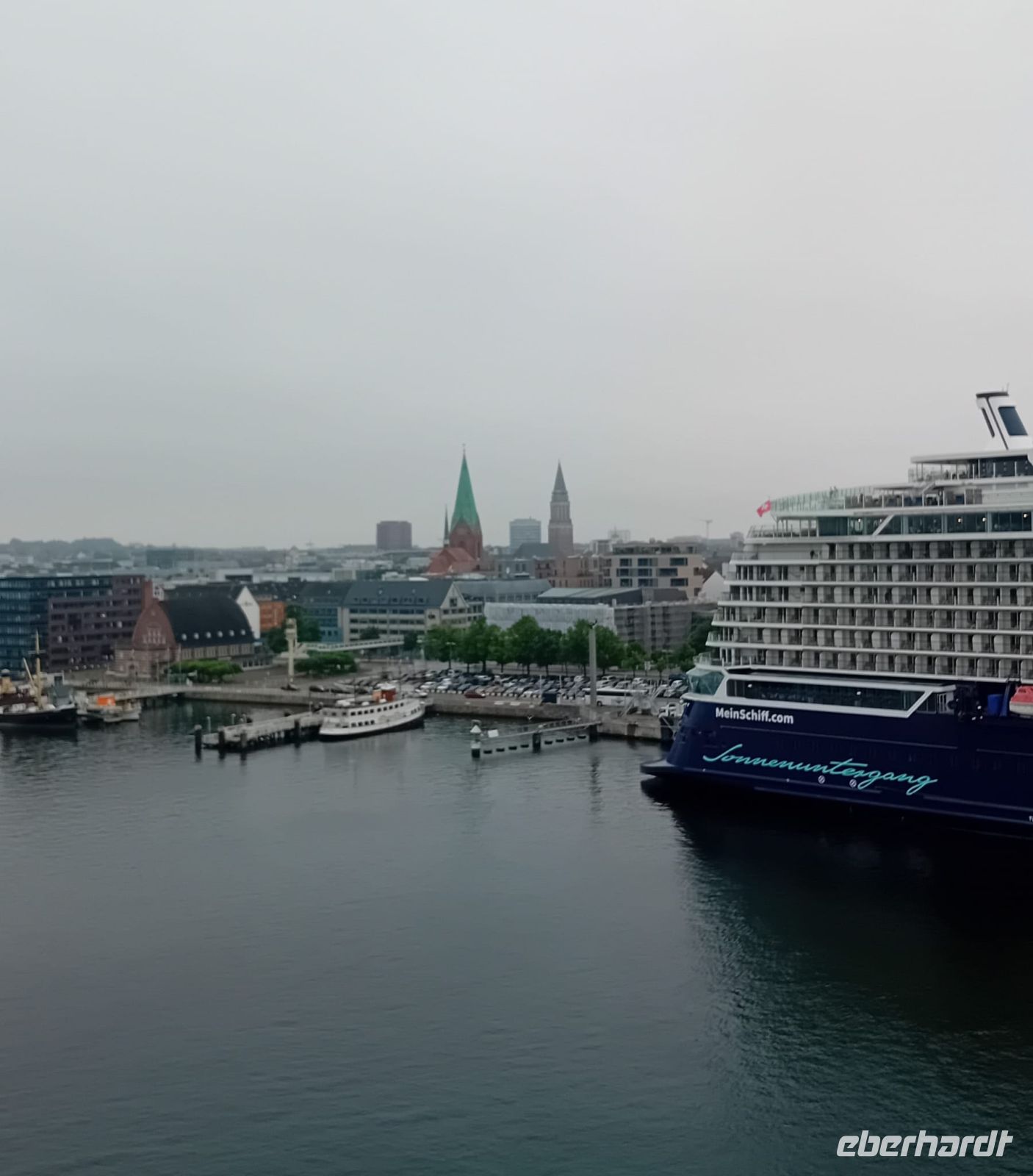 Nach einer ruhigen Überfahrt fuhren wir bei trübem Wetter in den Hafen von Kiel ein. Nach zehn Tagen wunderschönem, heißem Wetter im Norden fühlte sich der graue Himmel in Deutschland fast wie ein kleiner Schock an – als kämen wir aus einer ganz anderen Welt.