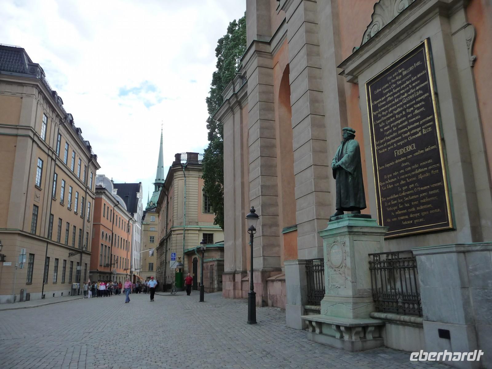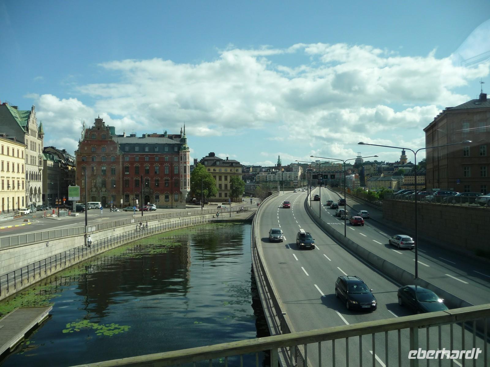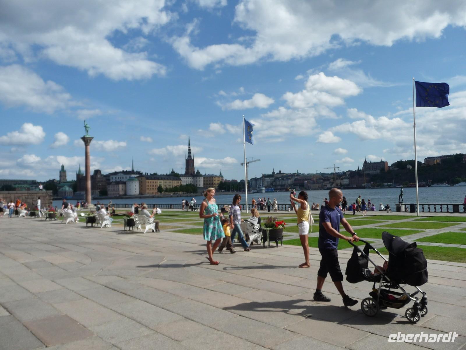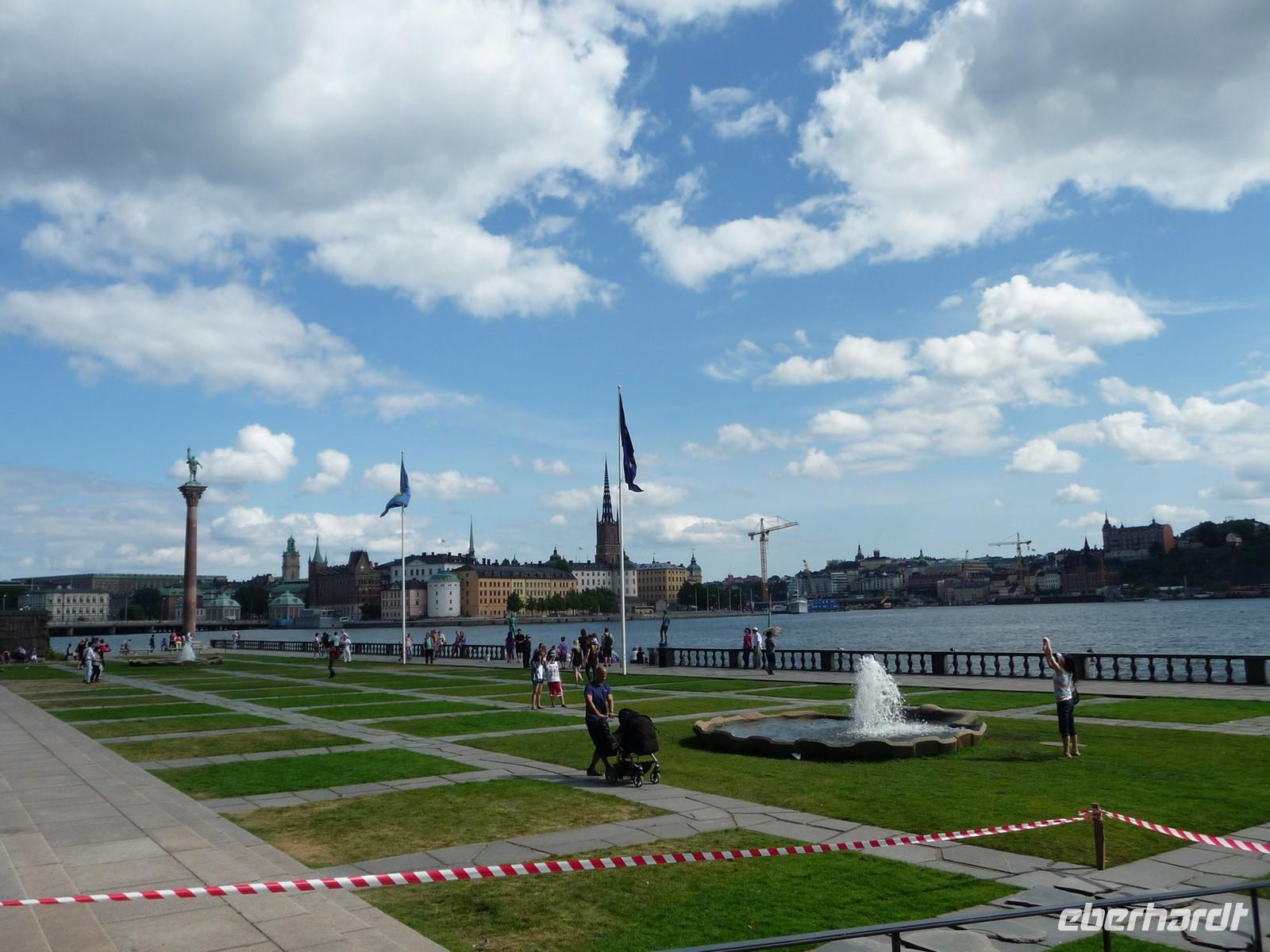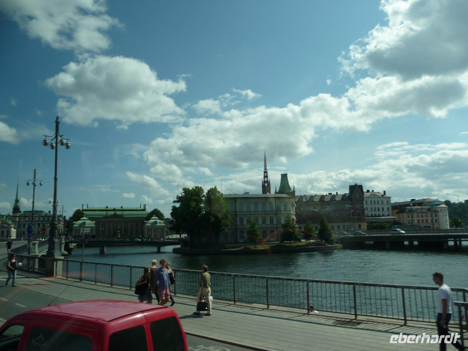 Auch der dritte Tag begrüßt uns mit Sonnenschein und wer Zeit hat spaziert vor oder nach dem Frühstück noch durch den kleinen Stadtpark von Linköping, hin zum Schloss, der sehenswerten Kirche und den Resten der Stadtmauer. 8:30 Uhr ist Gepäckladen und danach die Abfahrt nach Stockholm. Eine kurze Pause unterwegs und dann fahren wir auf der E 04 bis hinein ins Zentrum von Stockholm - 11:30 Uhr parken wir am Schloss. Wir wollen die Zeit nutzen und ich zeige den Gästen die Gassen der Altstadt, wo wir mit der Stadtführerin nicht hindurchgehen. Vorbei an der deutschen Kirche kommen wir so auch wieder zum Schloss, wo wir der Wachablösung zusehen können. Danach gönnen wir uns alle etwas Freizeit, machen Mittag am Bus und fahren 12:45 Uhr weiter zum Rathaus, wo wir uns mit Stadtführerin Erika treffen. Gemeinsam beginnen wir den geführten Stadtrundgang/
