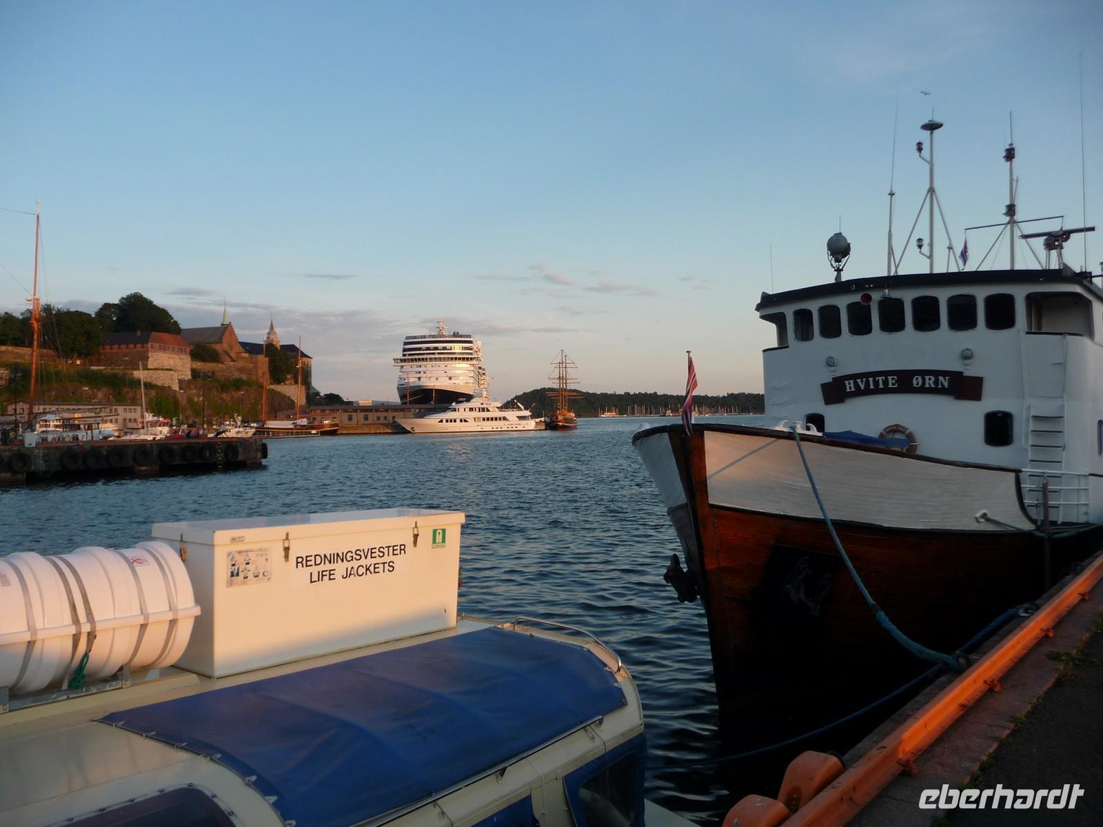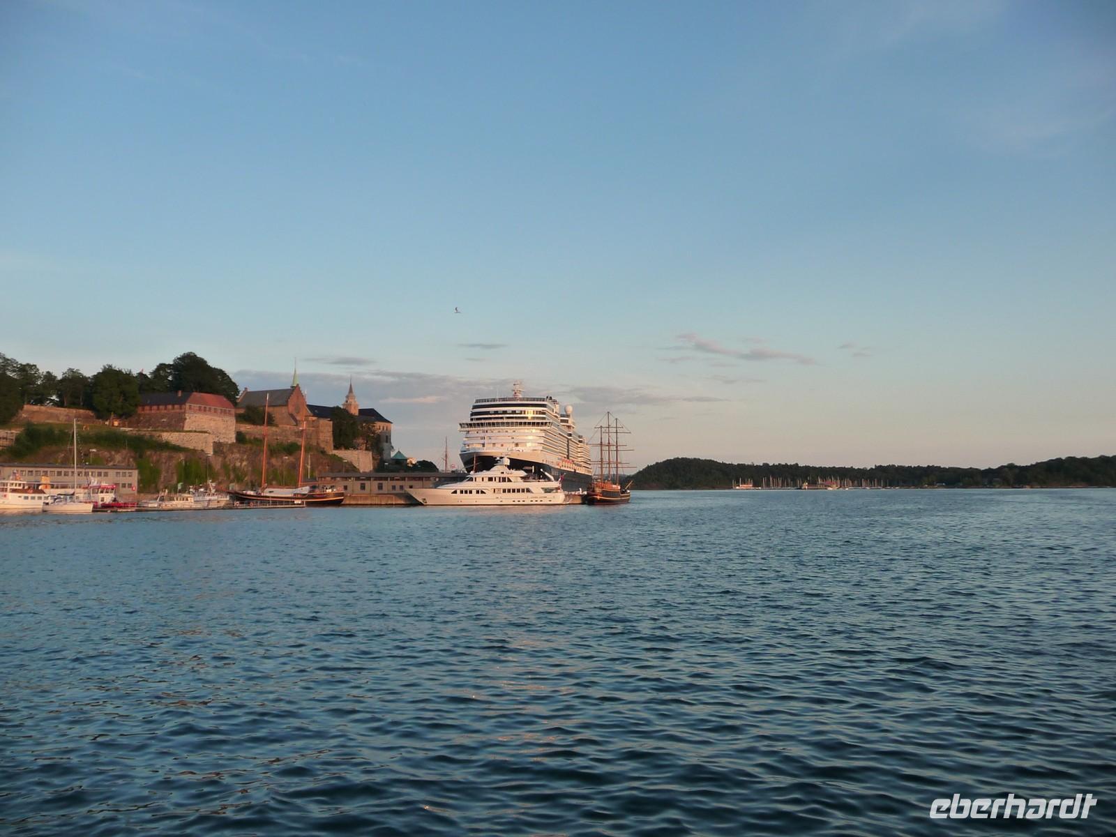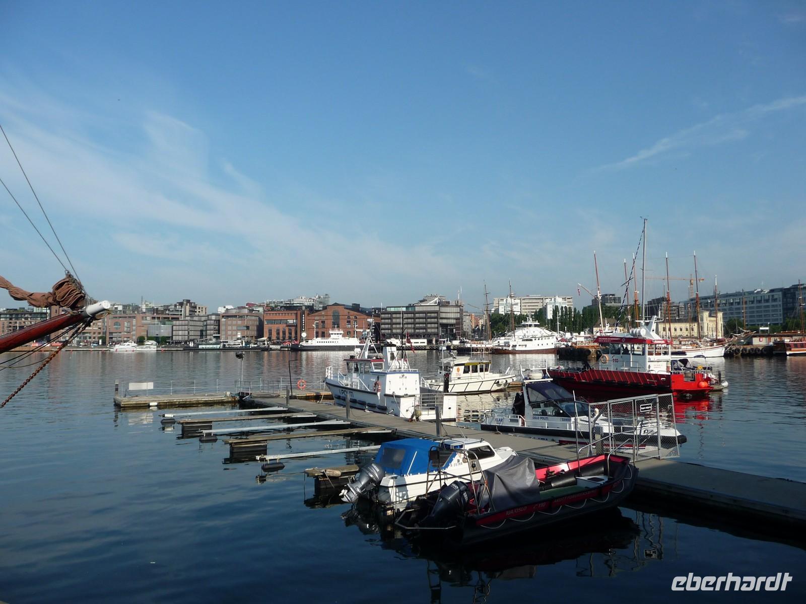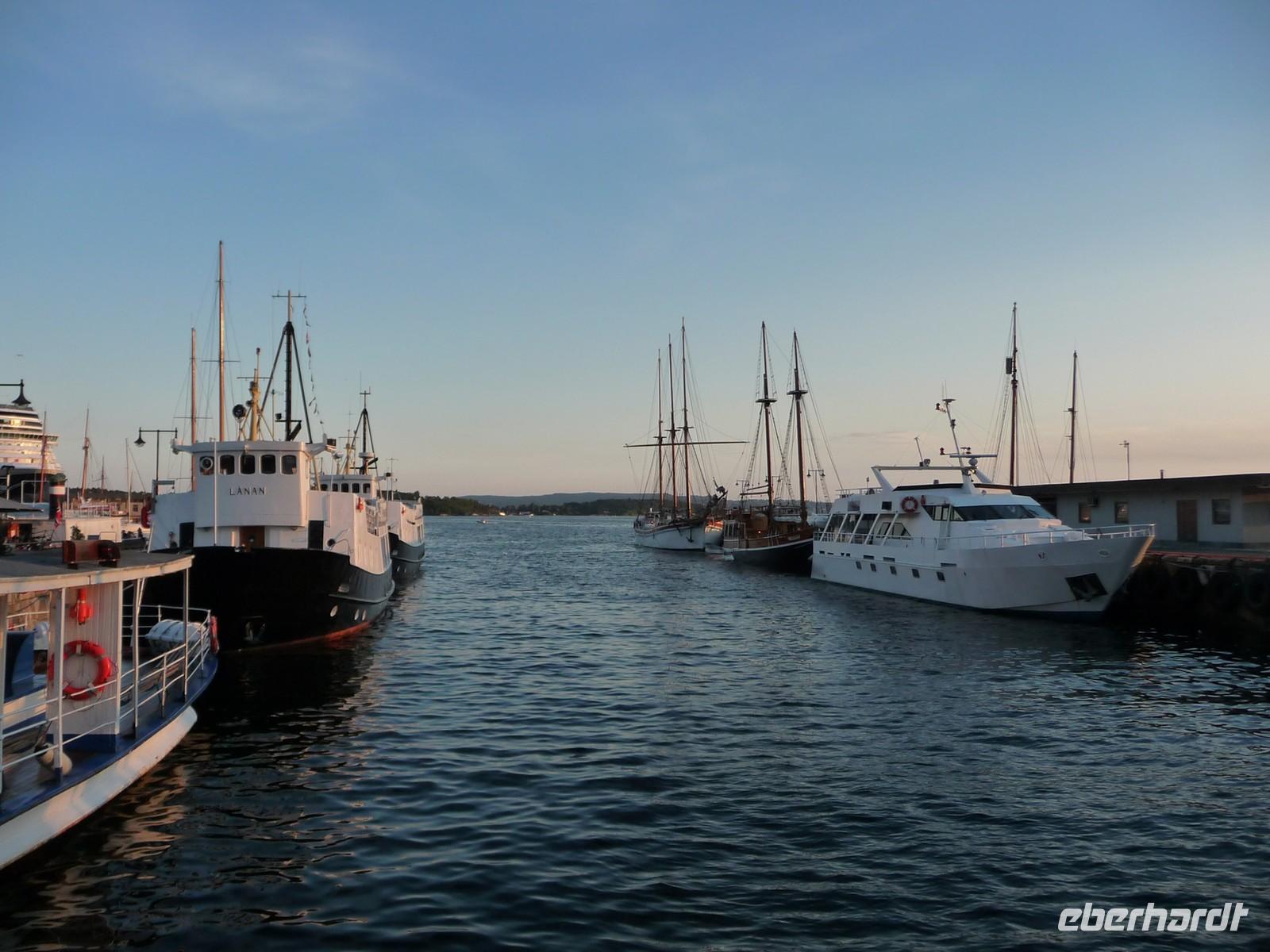 Die anschließende Weiterfahrt nach Oslo, mit einer Rast am Rastplatz vor dem Ortseingang, führt uns gegen 17:30 Uhr nach Oslo hinein und wir unternehmen doch noch die Auffahrt zum Holmenkollen - die Grenzkontrolle hat viel Zeit gekostet - schade!. So bleibt nur Zeit für die Besichtigung von 18:00 bis 18:30 Uhr. Zu wenig Zeit um noch mit der Bahn ganz hinauf in dieses imposante Bauwerk zu fahren, die beste Aussicht auf die Stadt müssen wir uns für den nächsten Besuch aufheben. 19 Uhr ist Check Inn im Hotel Rica Victoria - auch hier ganz im Zentrum der Stadt Oslo. Und so sind nach dem Abendessen nur ein paar Schritte bis zur Uferpromenade des Osloer Hafens.