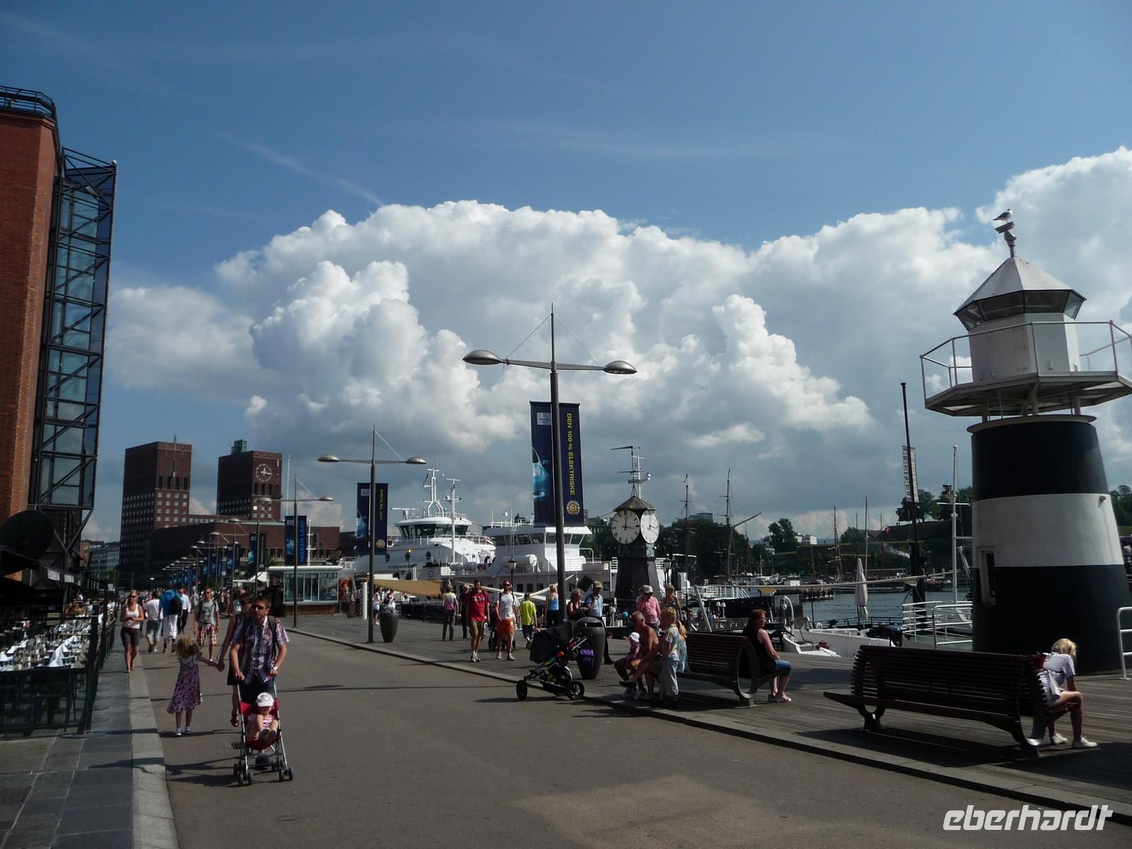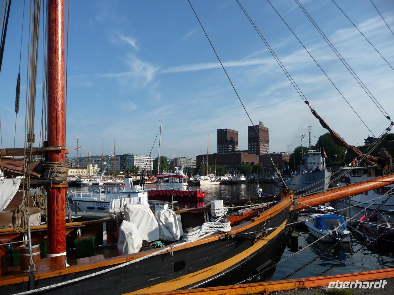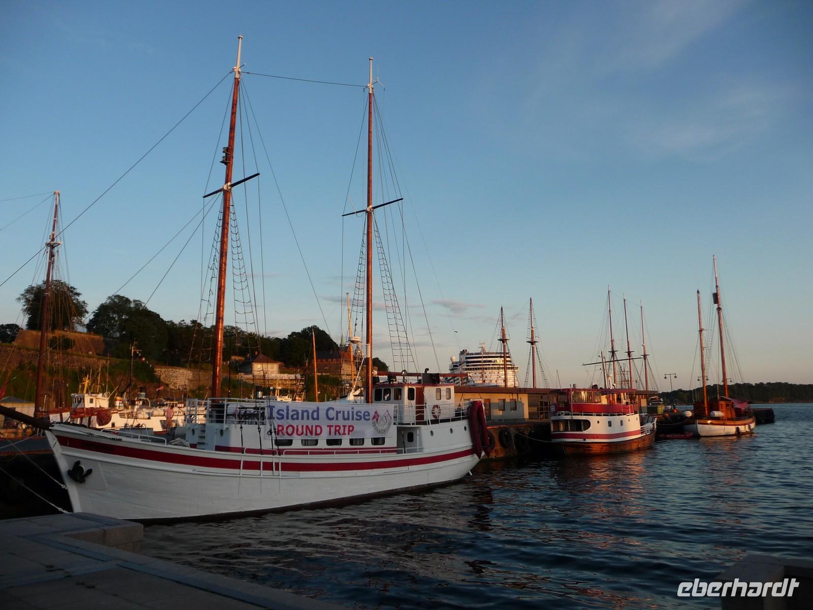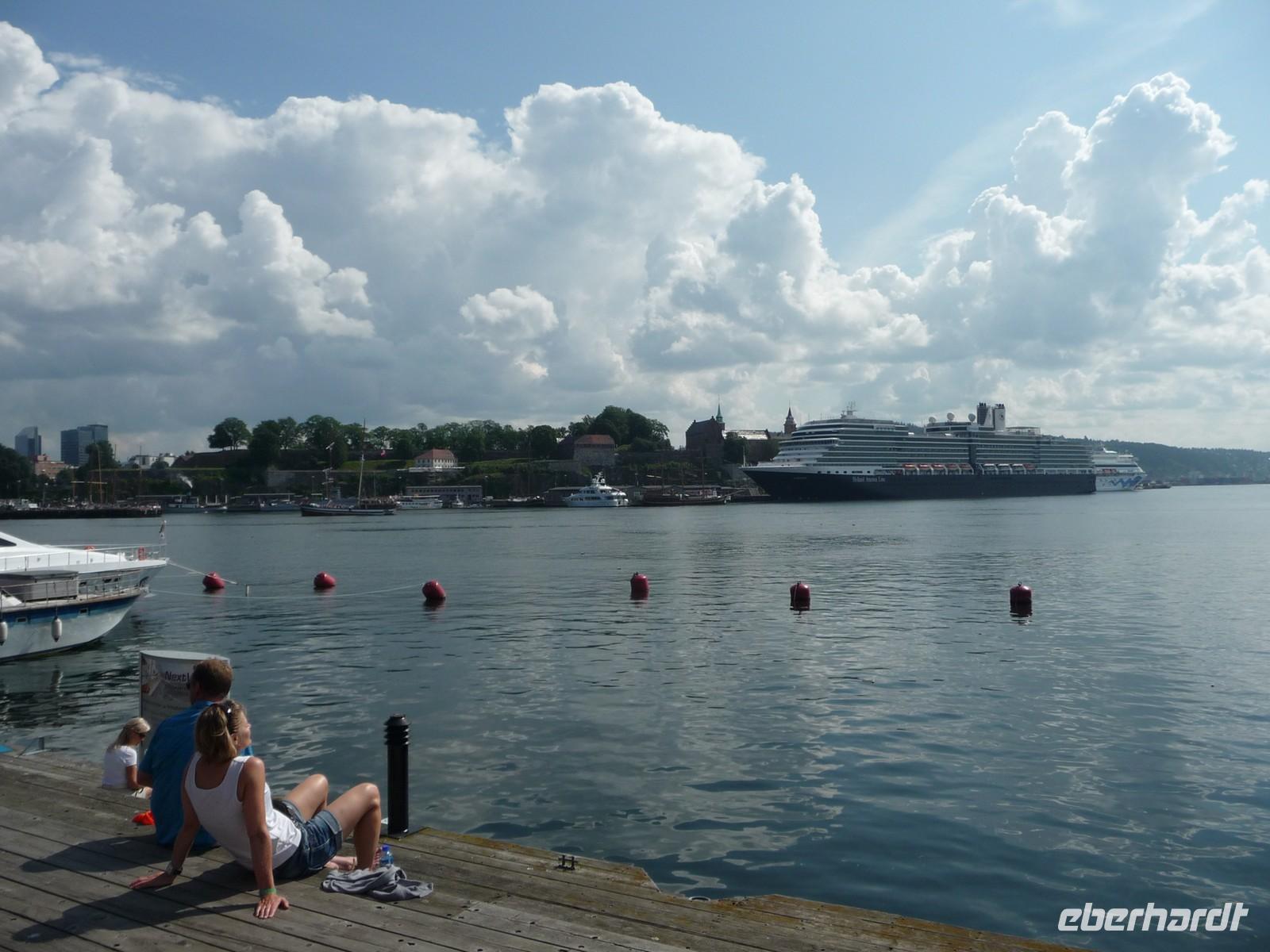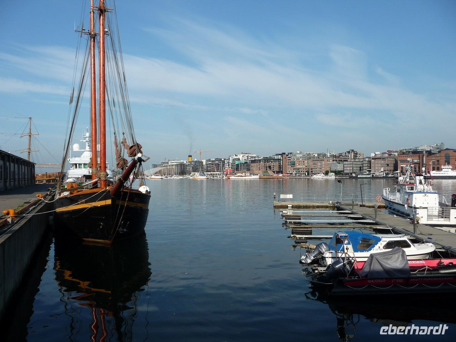 Die anschließende Weiterfahrt nach Oslo, mit einer Rast am Rastplatz vor dem Ortseingang, führt uns gegen 17:30 Uhr nach Oslo hinein und wir unternehmen doch noch die Auffahrt zum Holmenkollen - die Grenzkontrolle hat viel Zeit gekostet - schade!. So bleibt nur Zeit für die Besichtigung von 18:00 bis 18:30 Uhr. Zu wenig Zeit um noch mit der Bahn ganz hinauf in dieses imposante Bauwerk zu fahren, die beste Aussicht auf die Stadt müssen wir uns für den nächsten Besuch aufheben. 19 Uhr ist Check Inn im Hotel Rica Victoria - auch hier ganz im Zentrum der Stadt Oslo. Und so sind nach dem Abendessen nur ein paar Schritte bis zur Uferpromenade des Osloer Hafens.
