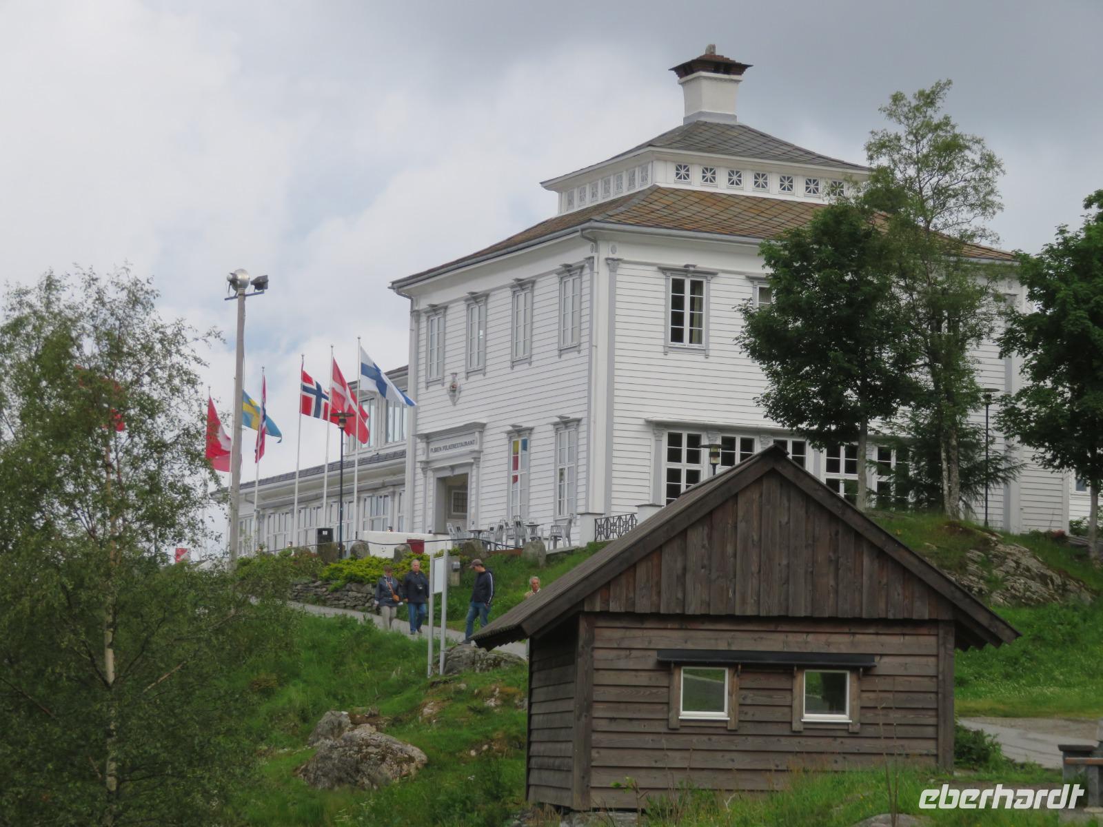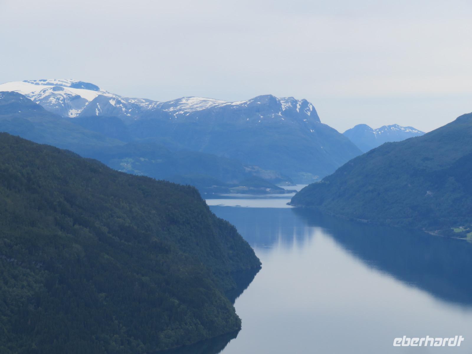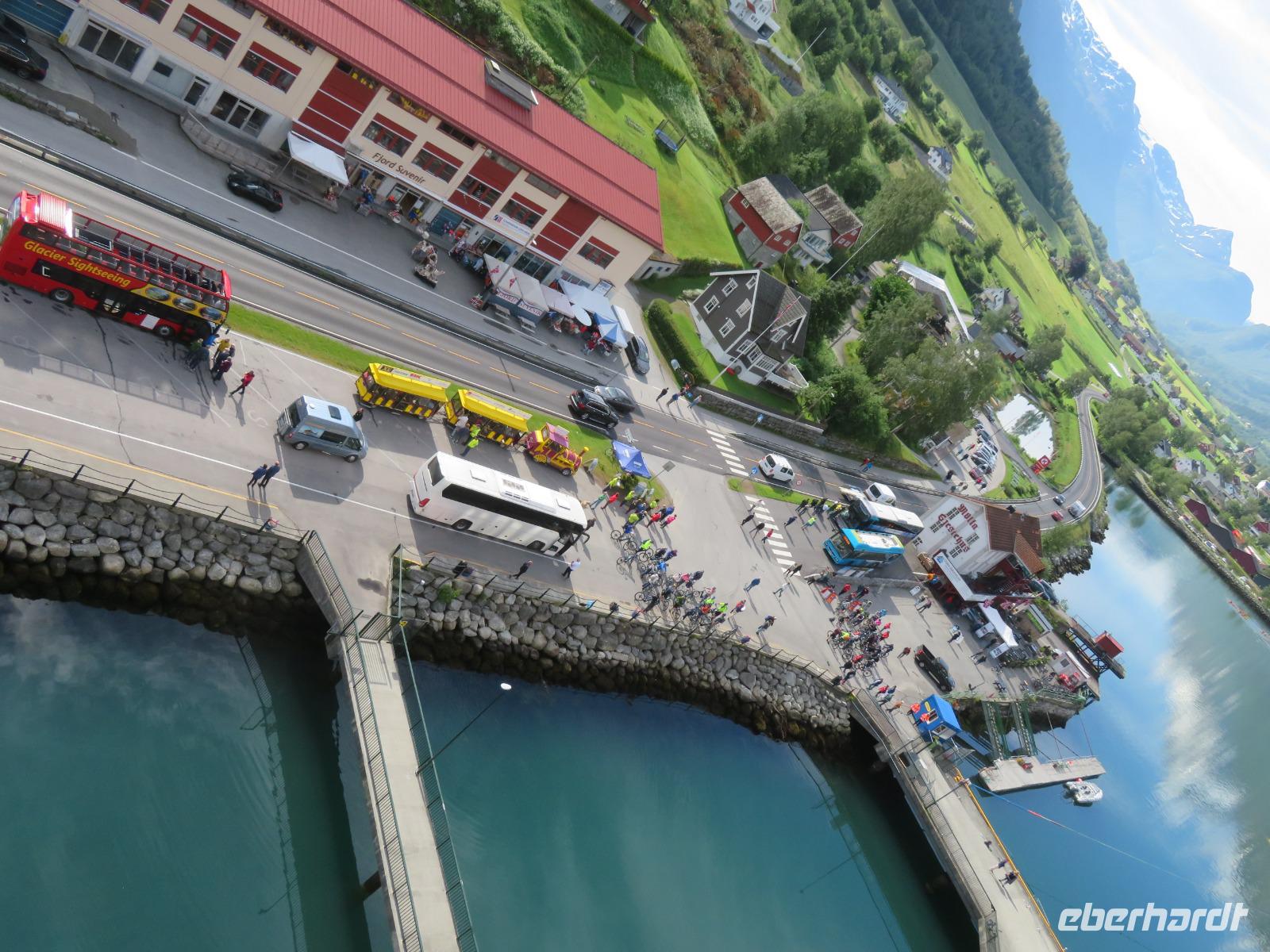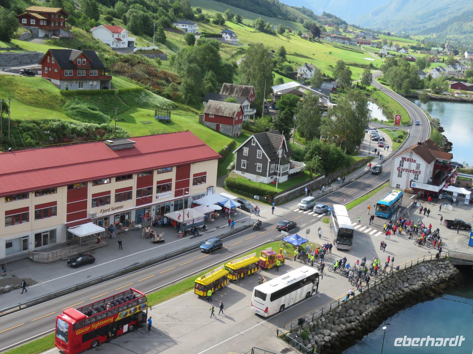 Die Ausflugsbusse standen bereit es ging eine Serpentinenstraße hinauf zur „Adlerkehre". Hier in einer Höhe von ca. 600 m macht nicht nur die Straße eine besonders enge Kurve, man hat hier einen imposanten Blick auf den Fjord, der hier ebenfalls eine Biegung macht. Unvergessliche Aussichten auf die steilen Felswände und die schneebedeckten Gipfel sind garantiert.