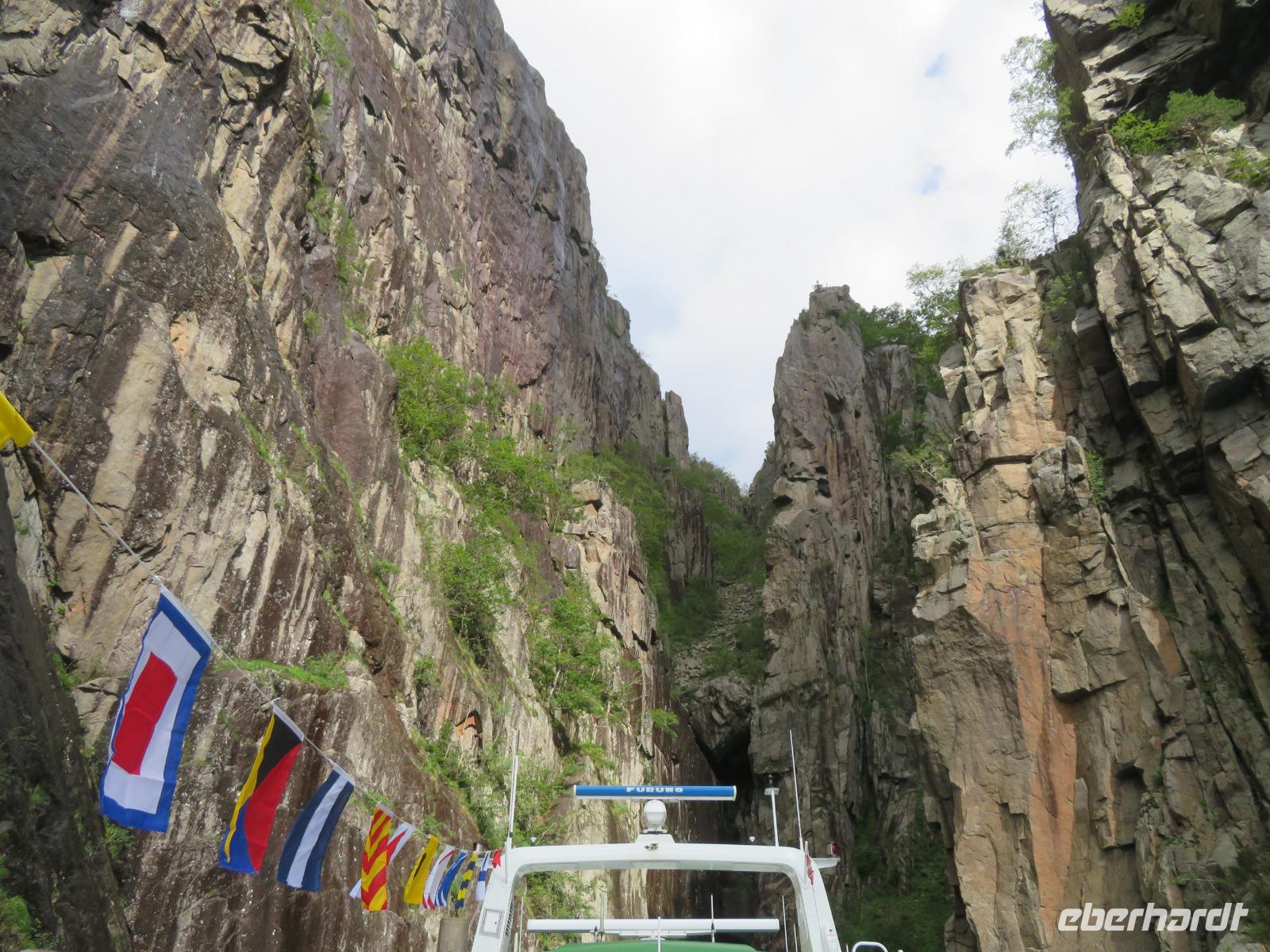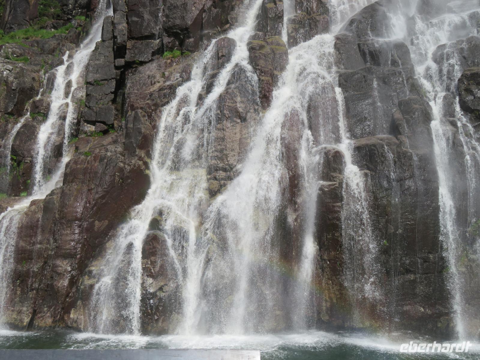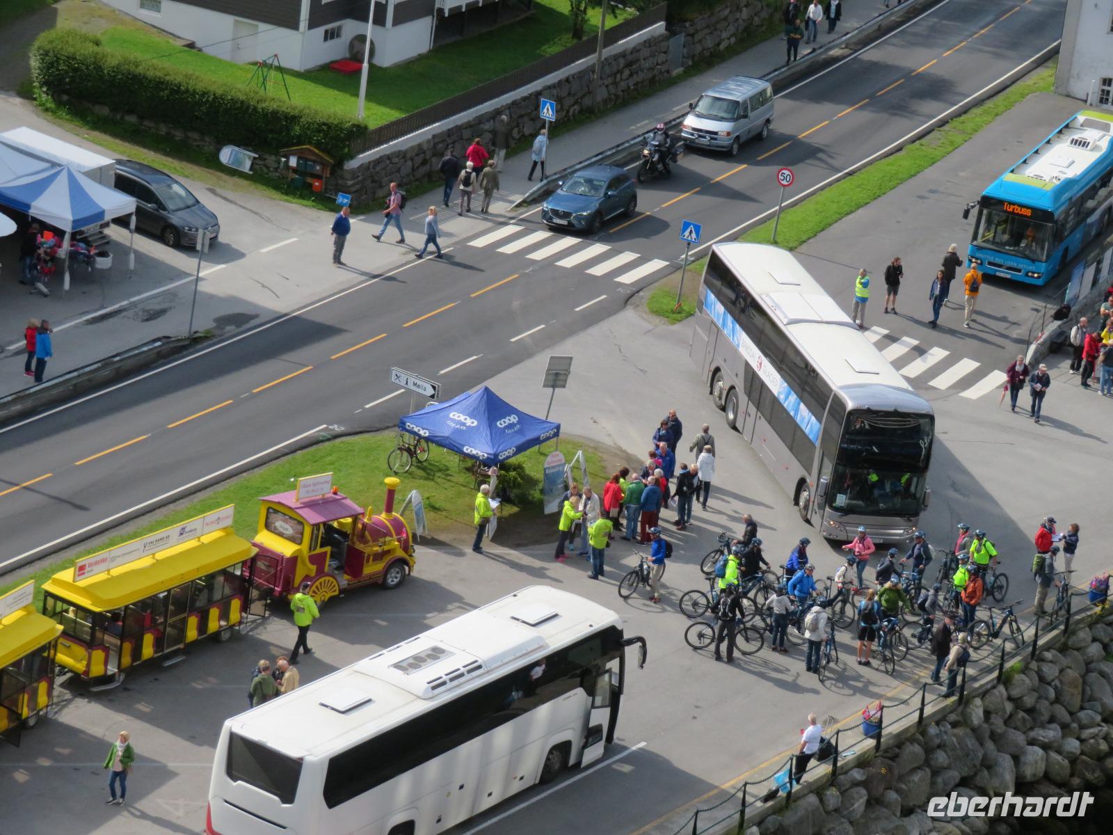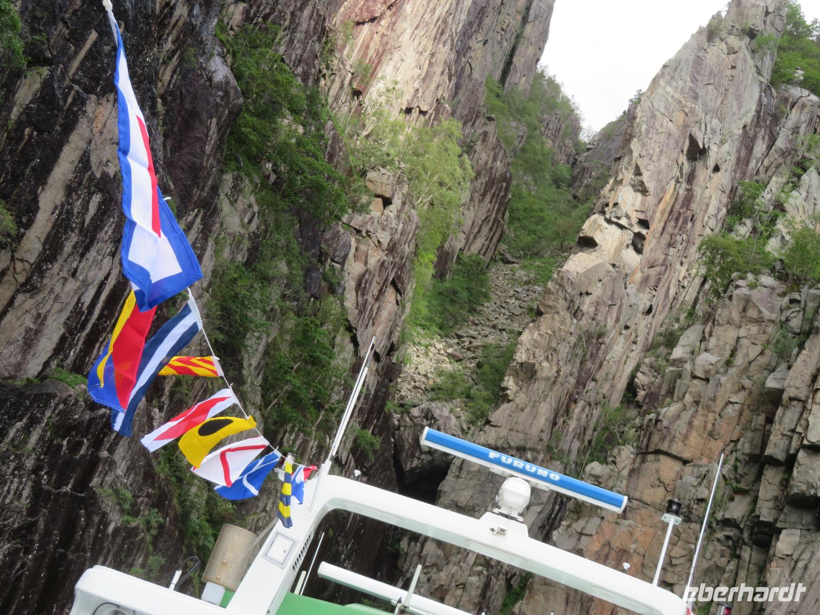 Die Ausflugsbusse standen bereit es ging eine Serpentinenstraße hinauf zur „Adlerkehre". Hier in einer Höhe von ca. 600 m macht nicht nur die Straße eine besonders enge Kurve, man hat hier einen imposanten Blick auf den Fjord, der hier ebenfalls eine Biegung macht. Unvergessliche Aussichten auf die steilen Felswände und die schneebedeckten Gipfel sind garantiert.