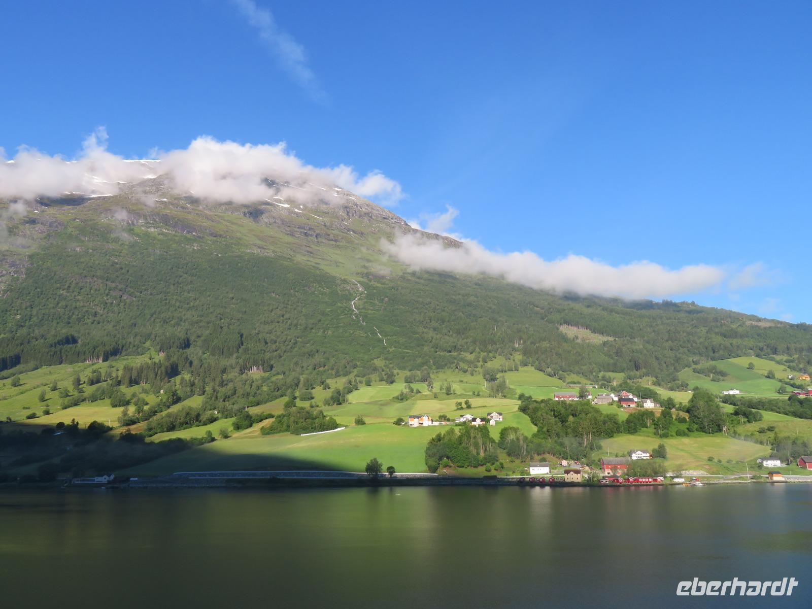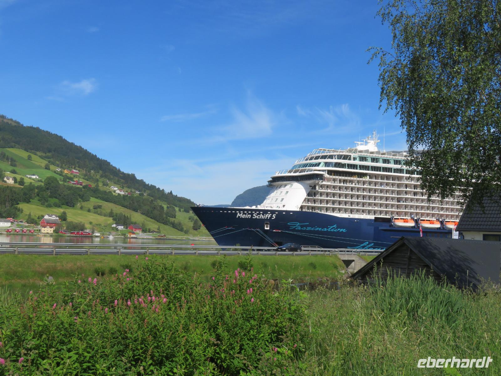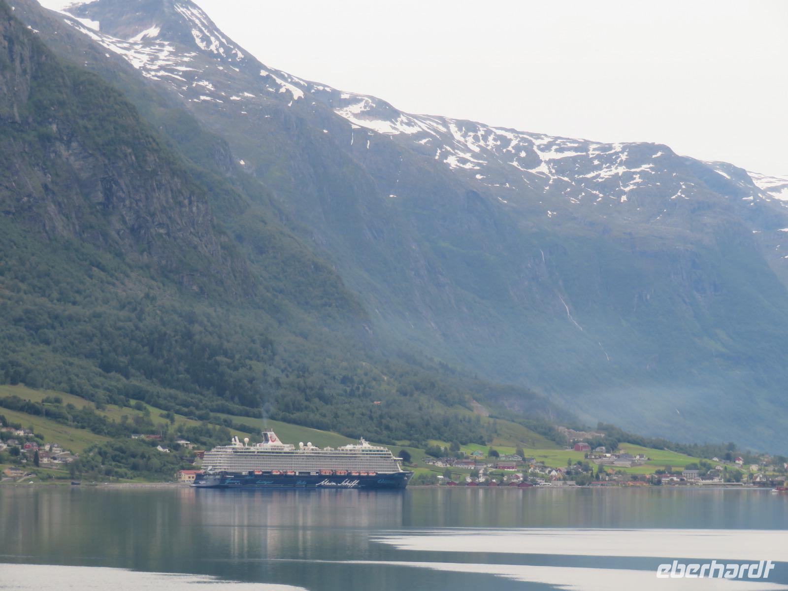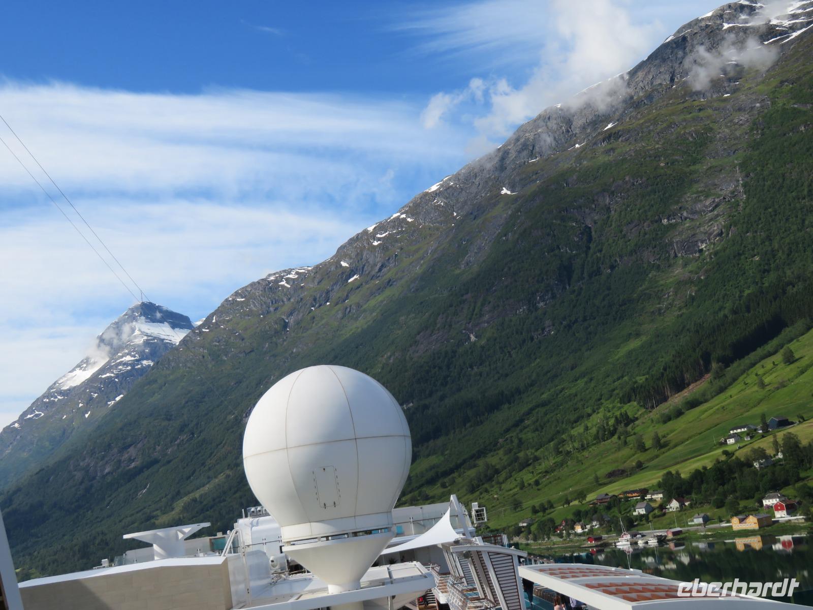 Es ist unglaublich wir liegen mit unserer „Mein Schiff 5" inmitten tiefer Fjorde, grüner Wiesen, üppiger Vegetation, kleiner Bäche und hoher Berggipfel. Die Gebirgslandschaft in den Alpen kann nicht schöner sein.