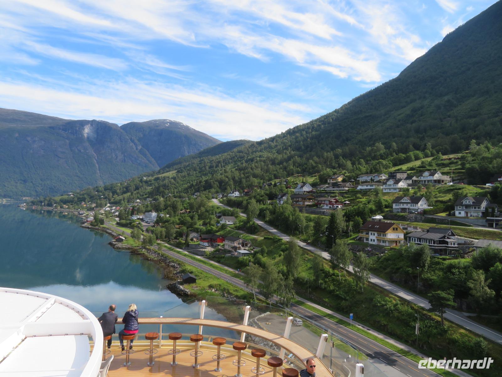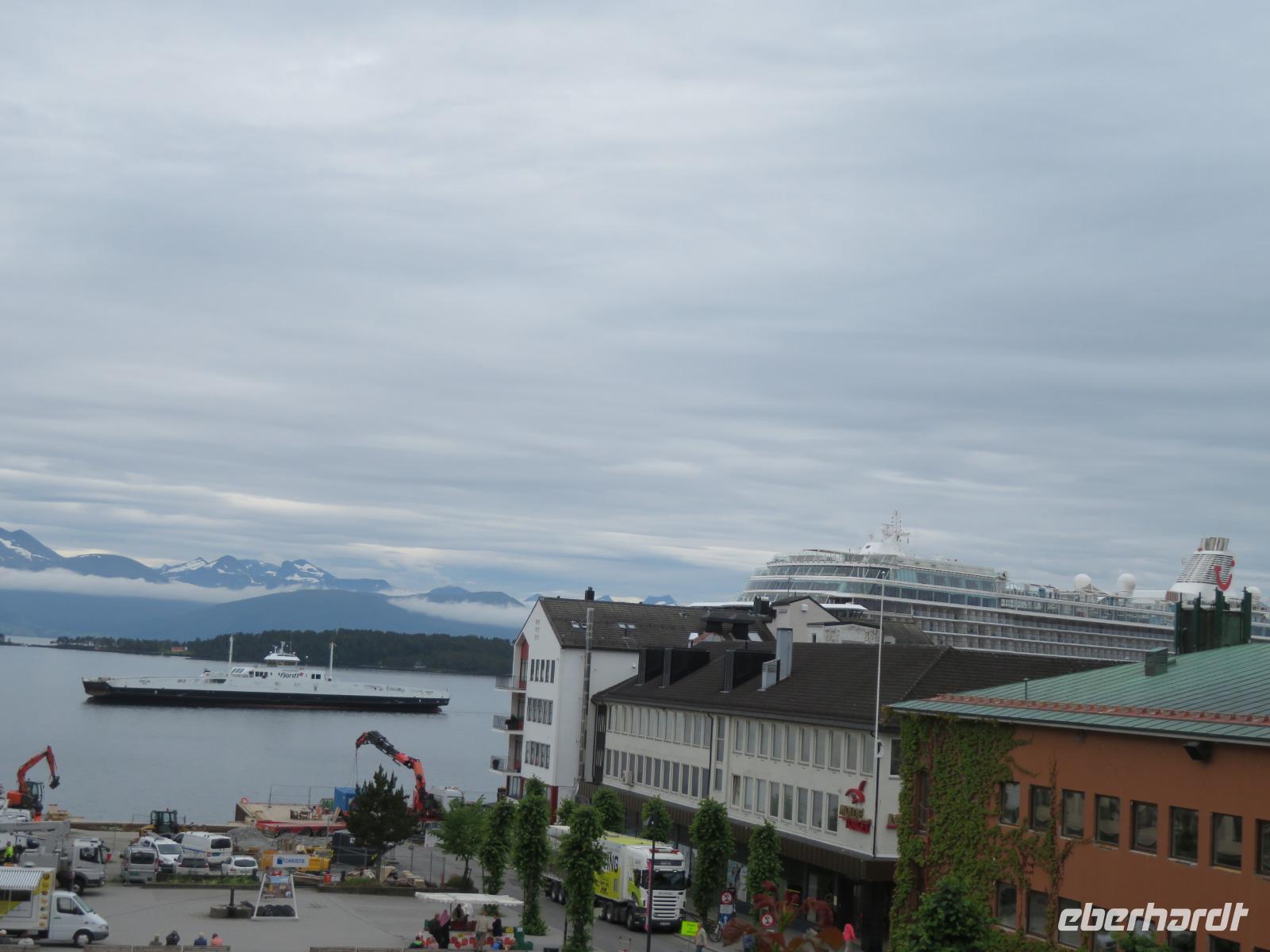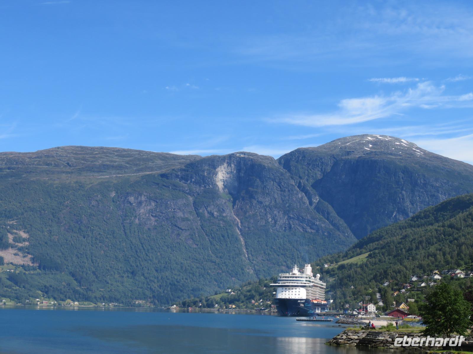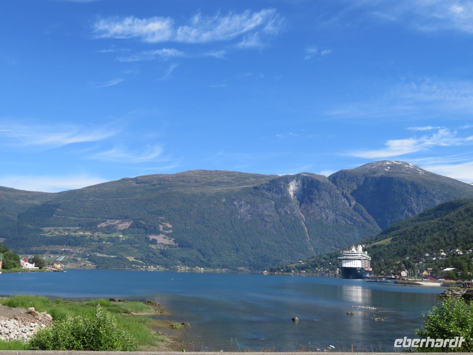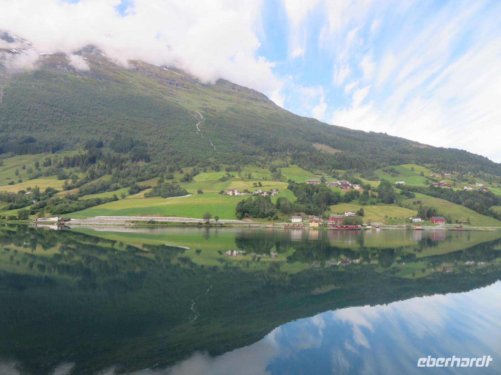 Es ist unglaublich wir liegen mit unserer „Mein Schiff 5" inmitten tiefer Fjorde, grüner Wiesen, üppiger Vegetation, kleiner Bäche und hoher Berggipfel. Die Gebirgslandschaft in den Alpen kann nicht schöner sein.