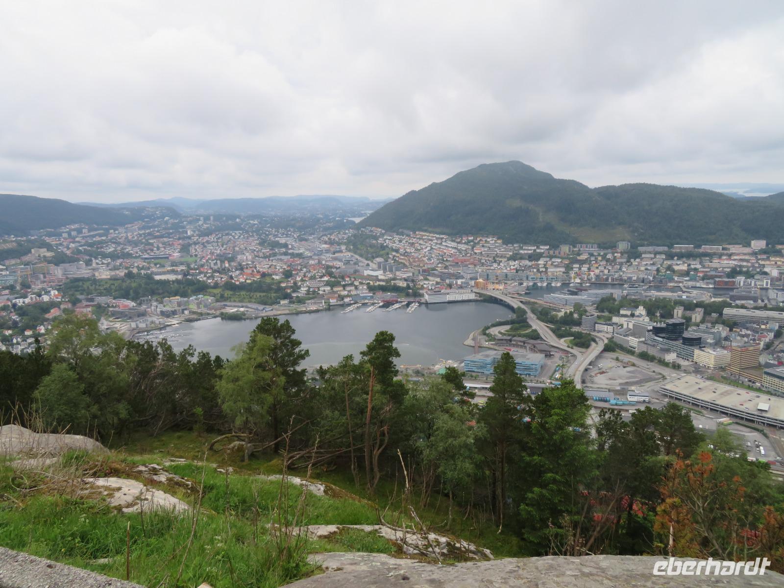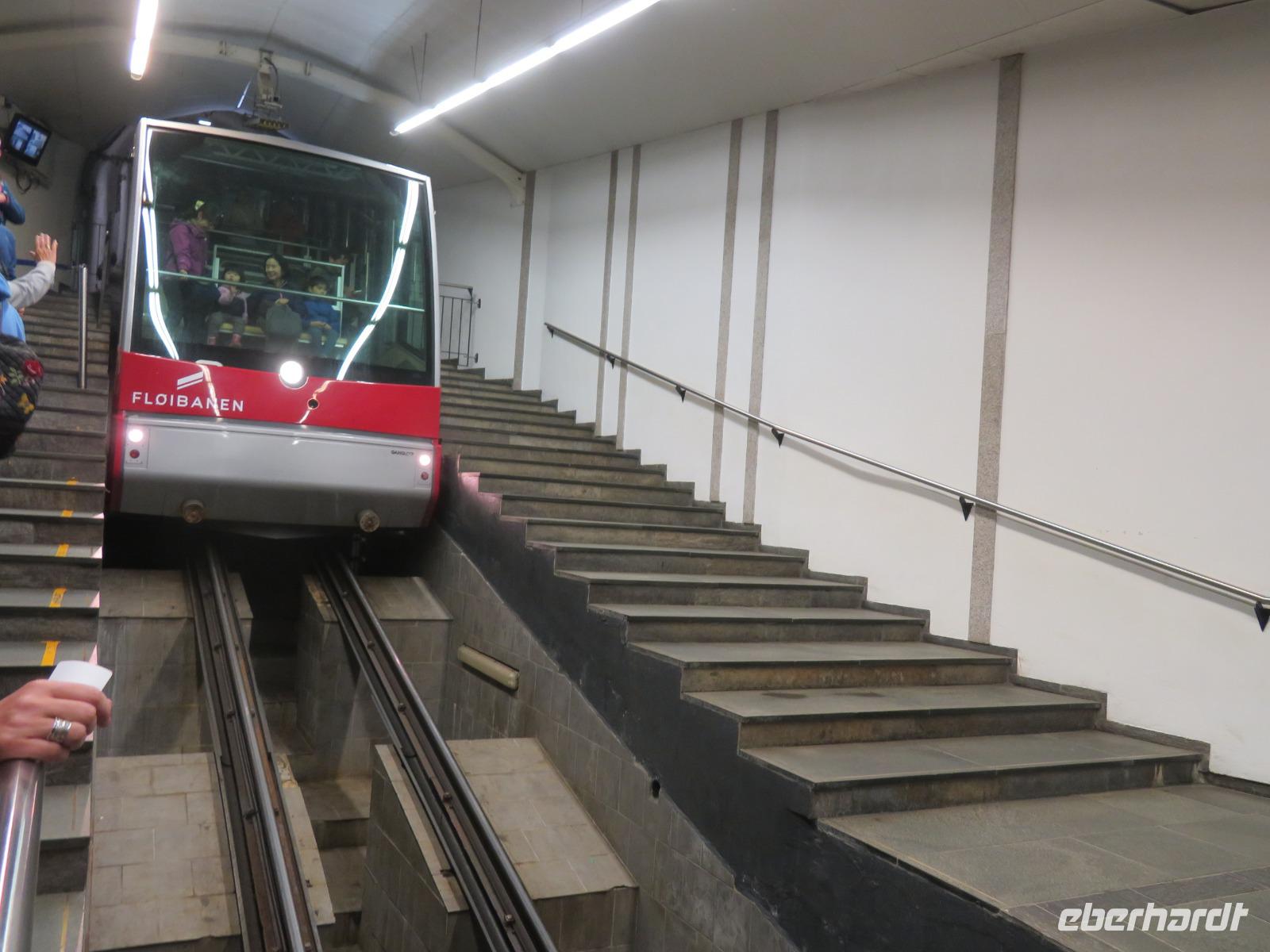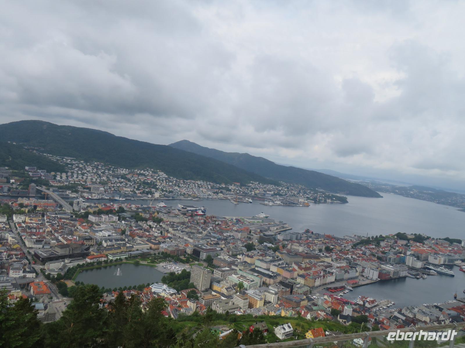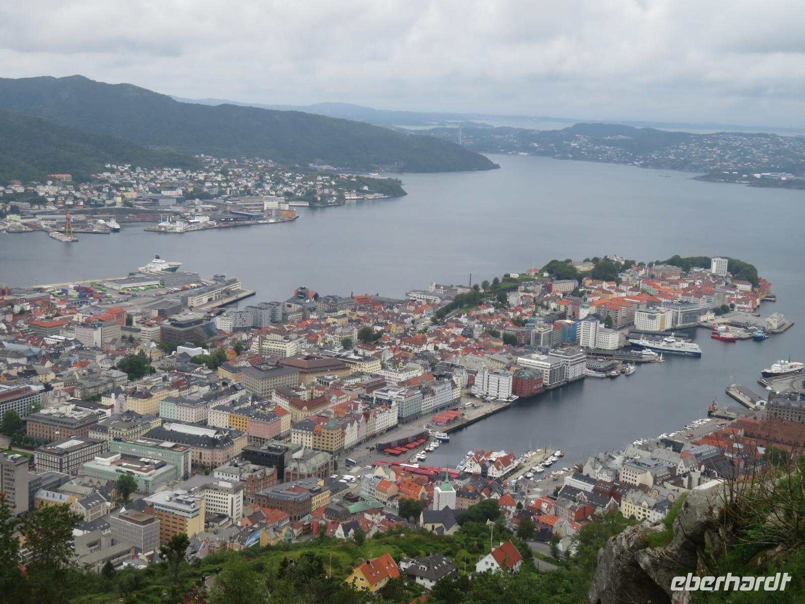 bei unserer Ankunft in Bergen, der zweitgrößten Stadt Norwegens, gleichzeitig wohl auch die Regenreichste. Unser Liegeplatz war ideal gegenüber der Bergenhus-Festungsanlage, einem Wahrzeichen aus dem 12. Jahrhundert. Ein Teil meiner Reisegruppe hatte sich zu einem individuellen Rundgang durch Bergen verabredet. Nach einem gemütlichen Frühstück spazierten wir, vorbei am Hafen und dem Stadtteil Bryggen, zuerst zur Floyenbahn, einer Zahnrad-Bahn auf den 330m hohen Hausberg der Stadt - Floyen.
