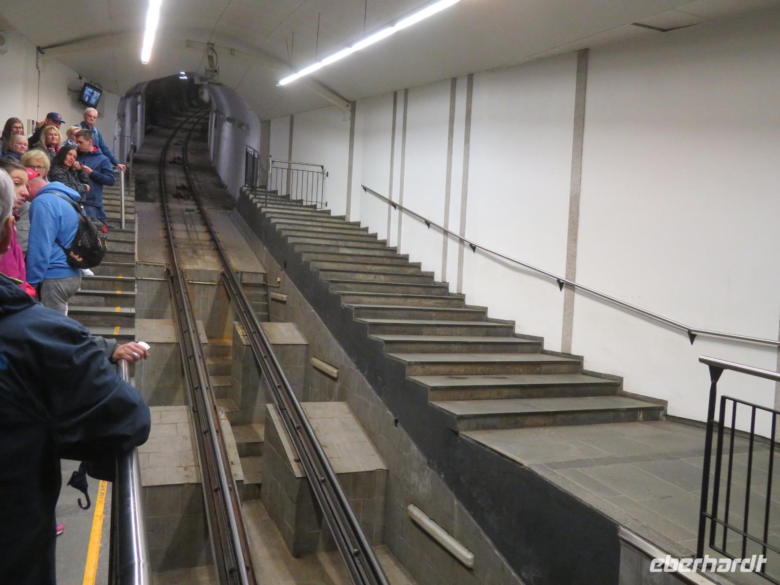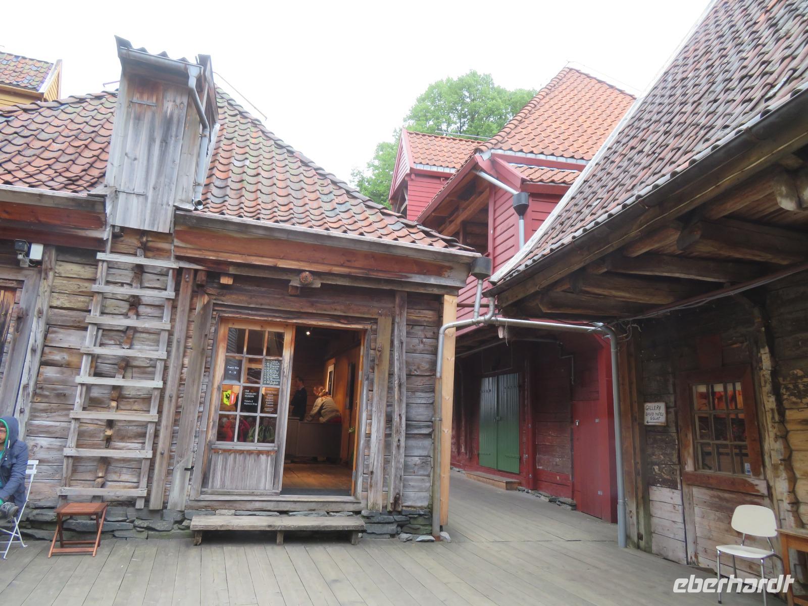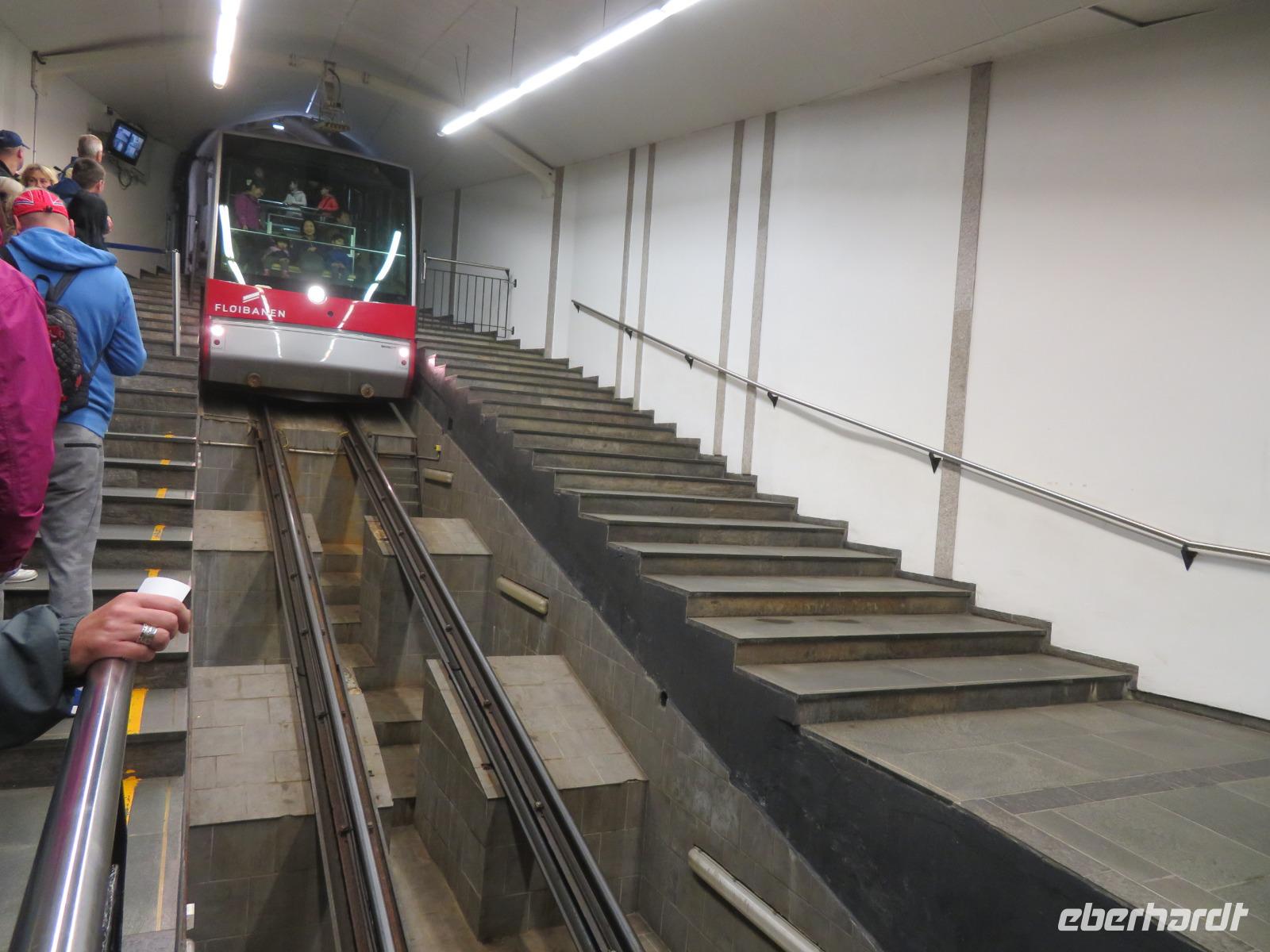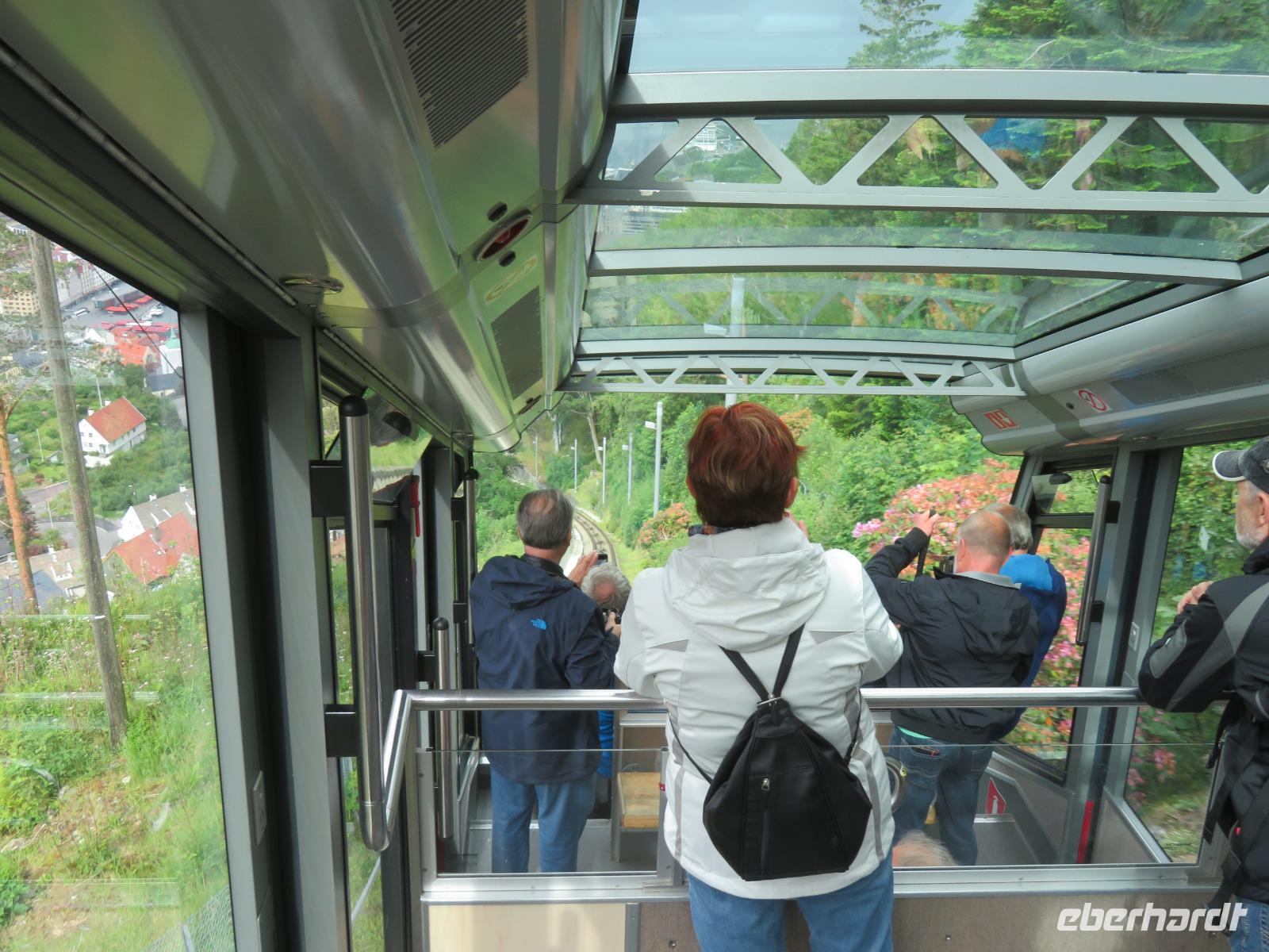 bei unserer Ankunft in Bergen, der zweitgrößten Stadt Norwegens, gleichzeitig wohl auch die Regenreichste. Unser Liegeplatz war ideal gegenüber der Bergenhus-Festungsanlage, einem Wahrzeichen aus dem 12. Jahrhundert. Ein Teil meiner Reisegruppe hatte sich zu einem individuellen Rundgang durch Bergen verabredet. Nach einem gemütlichen Frühstück spazierten wir, vorbei am Hafen und dem Stadtteil Bryggen, zuerst zur Floyenbahn, einer Zahnrad-Bahn auf den 330m hohen Hausberg der Stadt - Floyen.