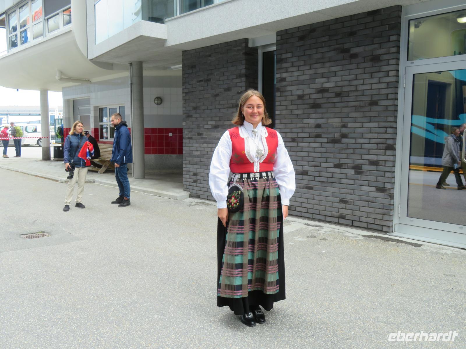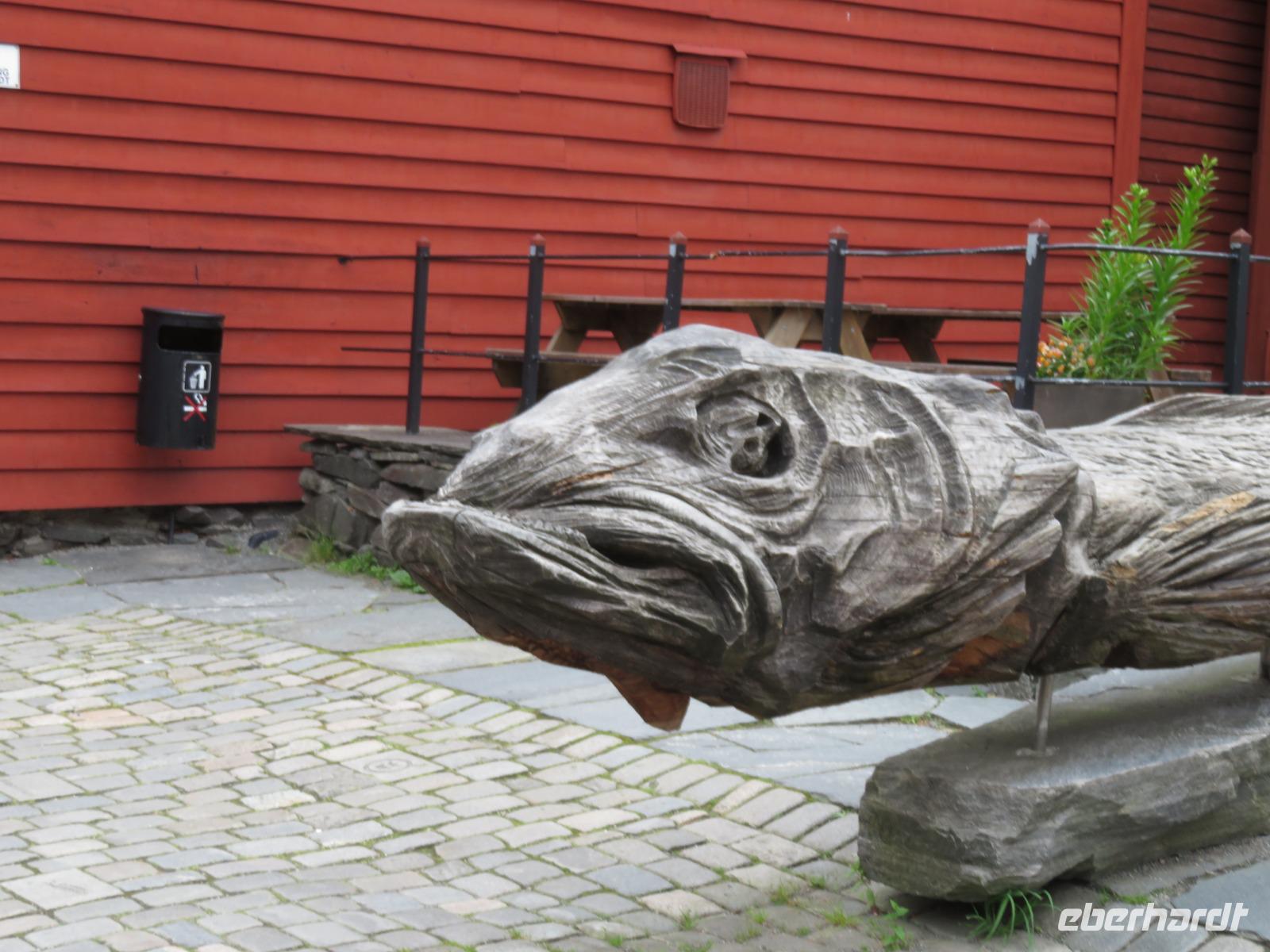Wir spazierten zum Fischmarkt im Zentrum der Stadt. Hier wird alles angeboten was das Meer so hergibt, aber auch Elch-, Wal- und Rentiersalami, Marmelade aus Molte-Beeren, Obst, Souvenirs und Getränke. Bei einem kleinen Rundgang erkundeten wir den wunderschönen Stadtpark, mit dem Theater und der Statue des bekannten norwegischen Dichters Hendrik Ibsen, der hier auch gewirkt hat. Auf dem Fischmarkt gönnten wir uns ein leckeres Fischbrötchen und lernten das in Norwegen selbst die Toilettengebühren mit Kreditkarte bezahlt werden. Zum Abschluss unseres Stadtrundganges besuchten wir das Hanseviertel Bryggen, wo sich die historischen typisch norwegischen bunten aus Holz gebauten Lagerhäuser mit ihren idyllischen Hinterhöfen an vergangene Handelszeiten erinnern. Das Gebiet steht heute unter dem Schutz der UNESCO und wurde zum Weltkulturerbe erklärt.
