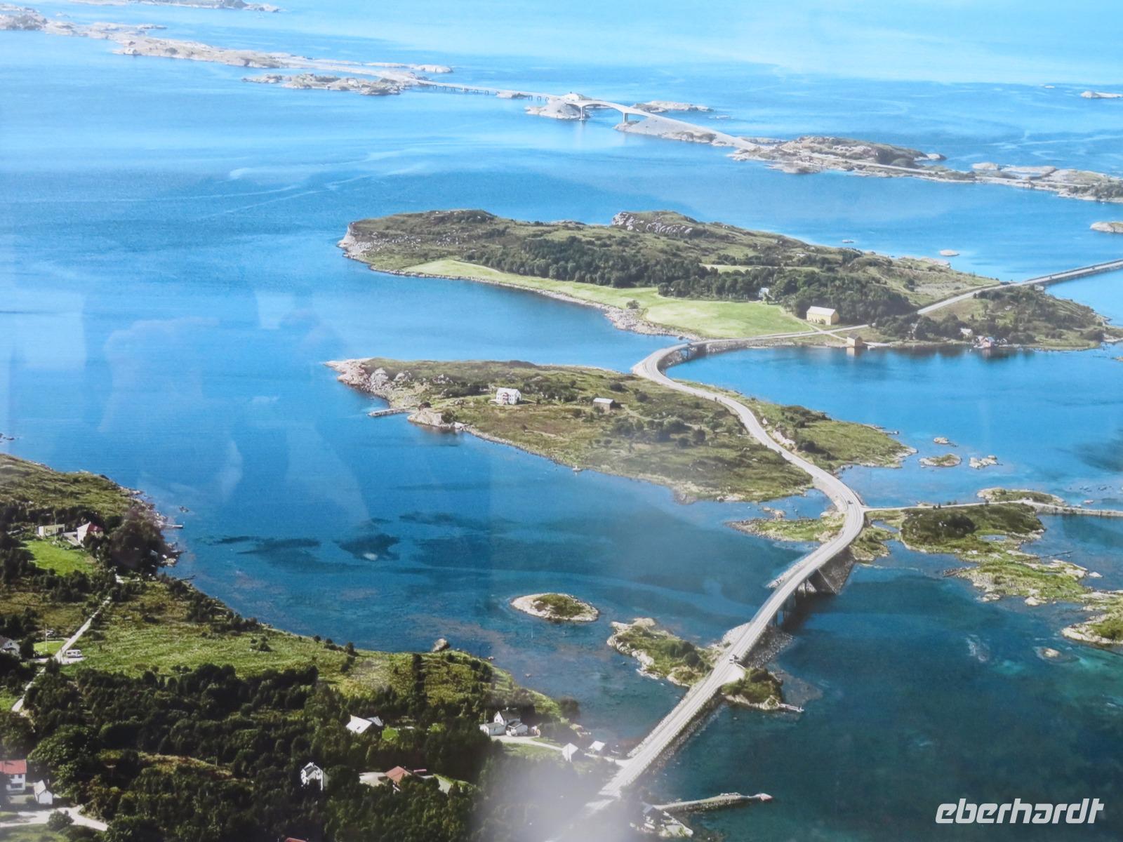 Insgesamt 8 umwerfende Brücken bilden den Kern der Straße durch Inseln und Schären, die im Jahr 1989 eröffnet wurde. Die größte Brücke ist die Storseisund-Brücke mit einer Länge von 260m. Auf dem 407m über dem Meeresspiegel liegende Aussichtspunkt Varden hatten wie die Möglichkeit ein tolles Panoramafoto von Molde, den umliegenden 222 Berggipfeln und der einzigartigen Fjordlandschaft zu machen.