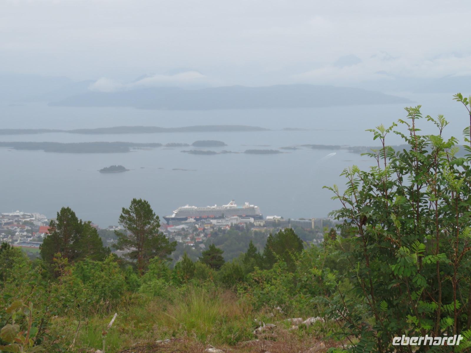 Zurück durch das Örtchen Geiranger ging es nun wieder über Serpentinen hinauf in die Berge zum 1500m hochgelegenen Aussichtspunkt Dalsnibba. Hier soll man einen traumhaften Blick über die schneebedeckten Gipfel, den Fjord mit den vor Anker liegenden Kreuzfahrtschiffen und den Ort Geiranger haben. Schade wir sahen genau nix, alles war in dichten Nebel gehüllt. Um 18 Uhr wurden die Anker gelichtet und bei super Wetter, vorbei an der noch vor Anker liegenden AIDAdiva, erlebten wir die Ausfahrt aus dem Fjord jetzt bei Sonnenschein. Lektor Markus Kummerer versorgte uns mit interessanten Details rund um den Geiranger Fjord. Insbesondere begeisterten die Wasserfälle „Die 7 Schwestern" und die herrlichen Farben von Wasser und Landschaft.