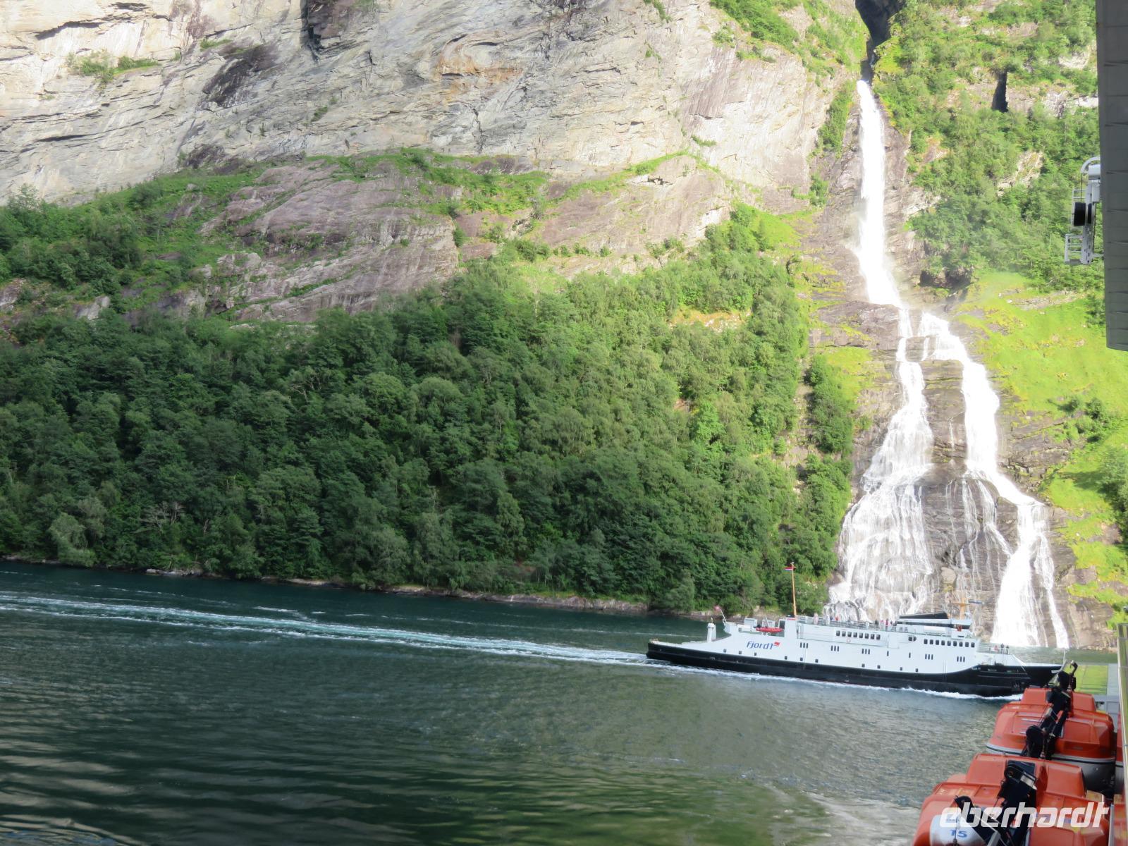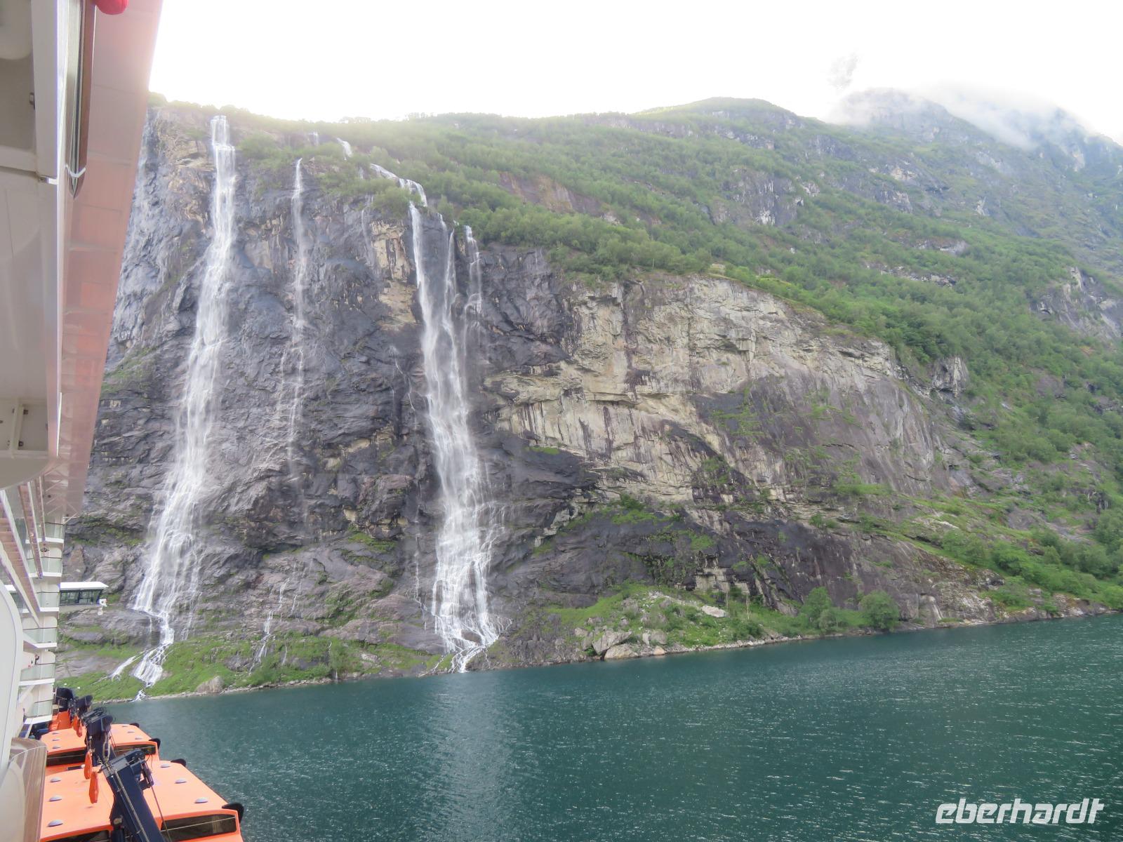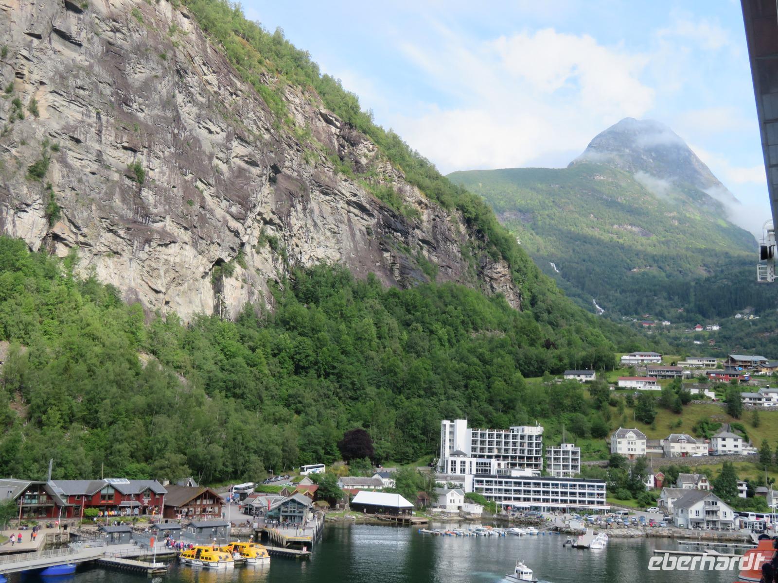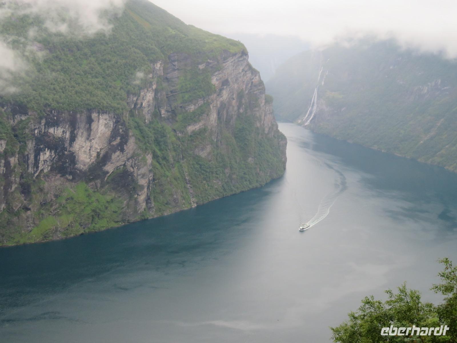 zum Weltnaturerbe zählende Fjord ist ca. 16 km lang an dessen Ende sich das 300 Einwohner zählende Dörfchen Geiranger befindet. Da er weit im Landesinneren liegt, ragen aber hier die Felswände besonders hoch und steil auf, die Wasserfälle sind besonders schön und der Blick auf die schneebedeckten Berge besonders eindrucksvoll.