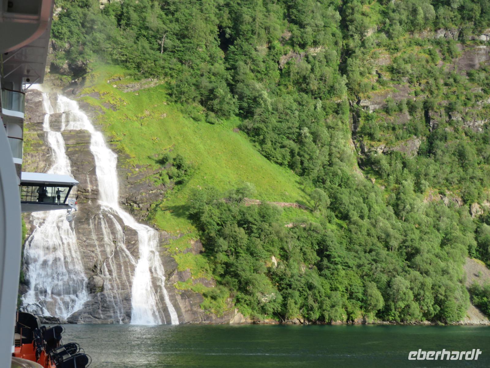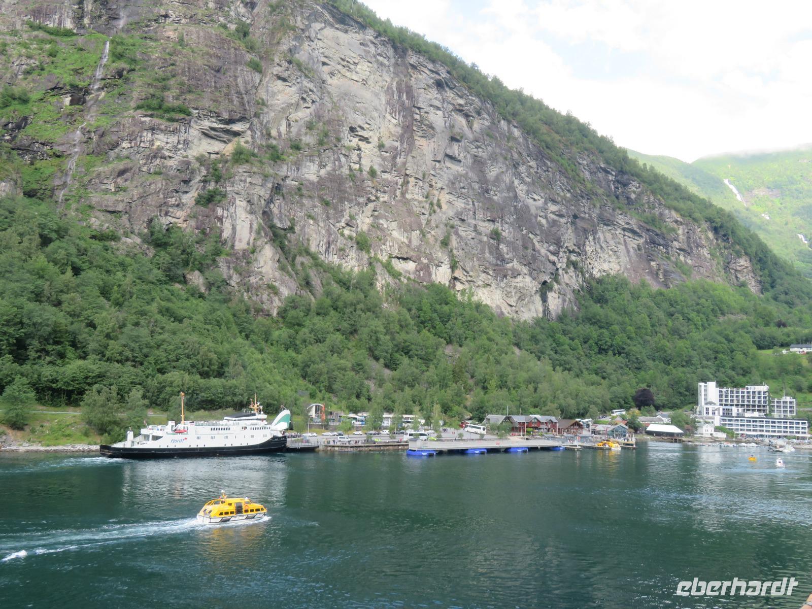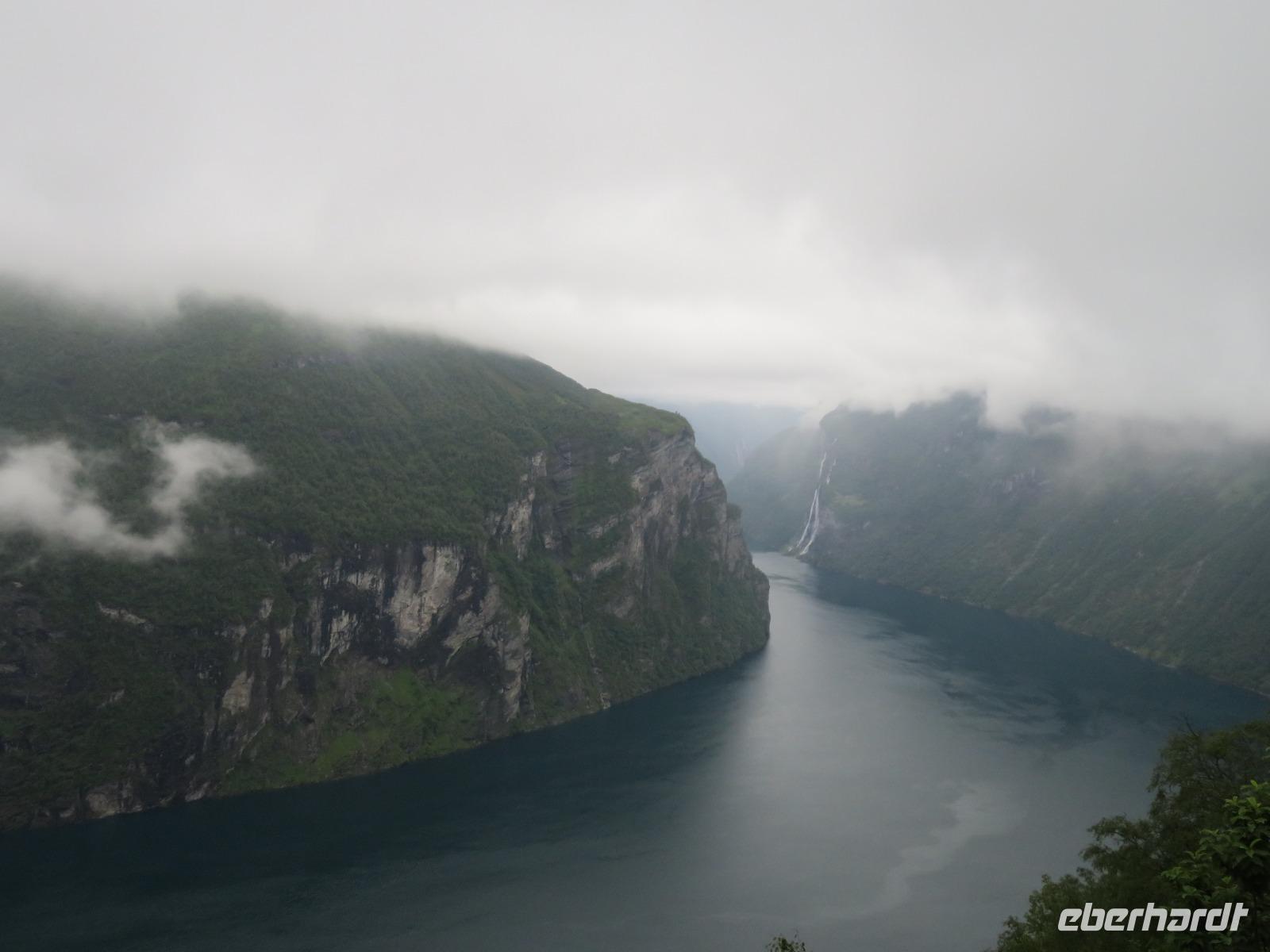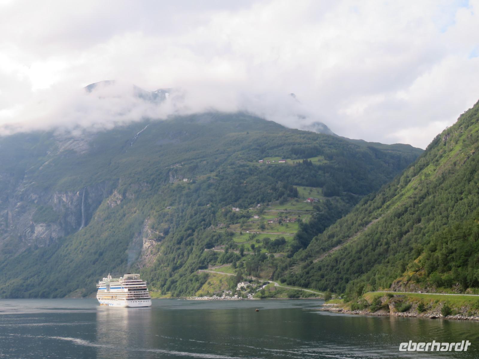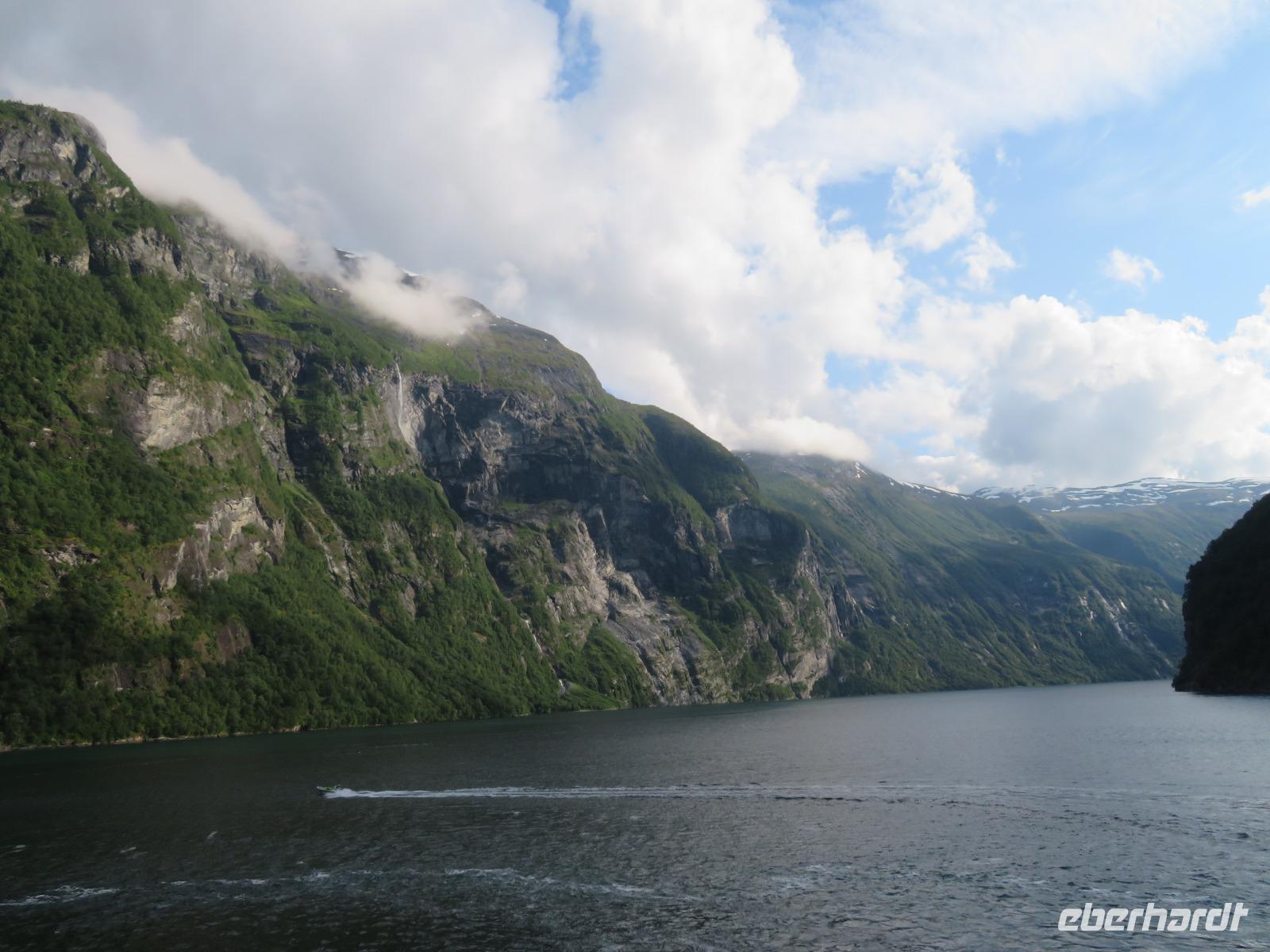 zum Weltnaturerbe zählende Fjord ist ca. 16 km lang an dessen Ende sich das 300 Einwohner zählende Dörfchen Geiranger befindet. Da er weit im Landesinneren liegt, ragen aber hier die Felswände besonders hoch und steil auf, die Wasserfälle sind besonders schön und der Blick auf die schneebedeckten Berge besonders eindrucksvoll.